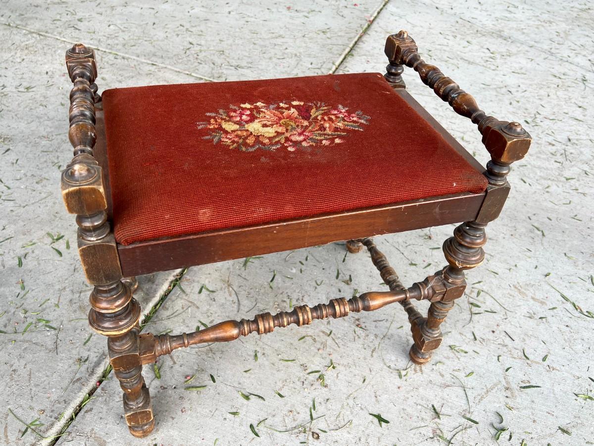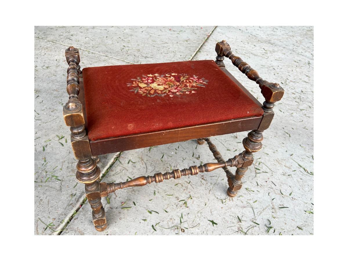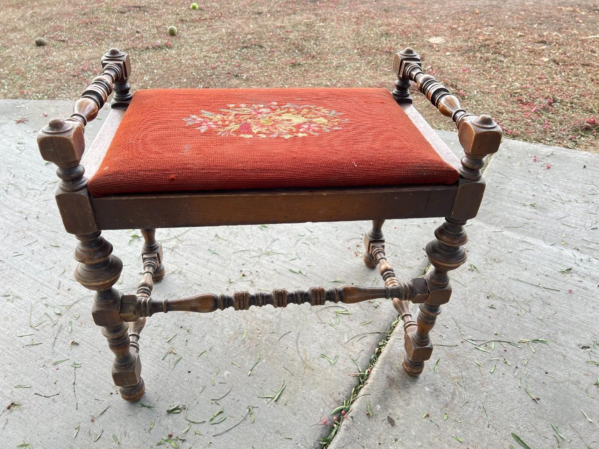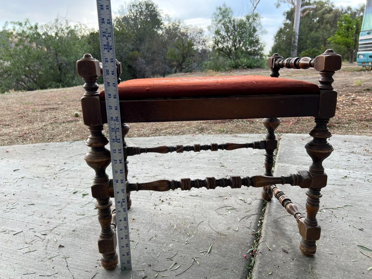 Vintage Spanish Style Small Carved Wood Cushioned Sitting Bench - IN LA HABRA HEIGHTS PICK UP ONLY