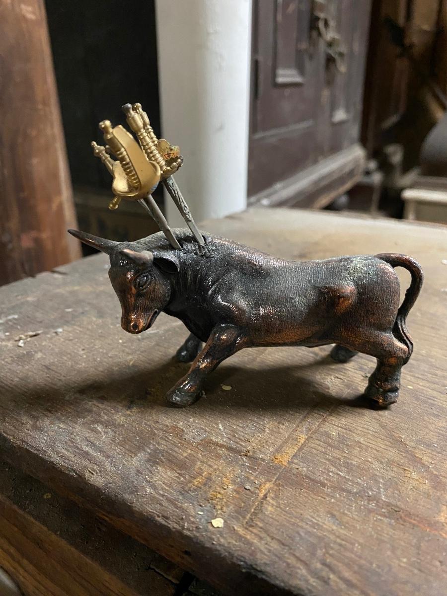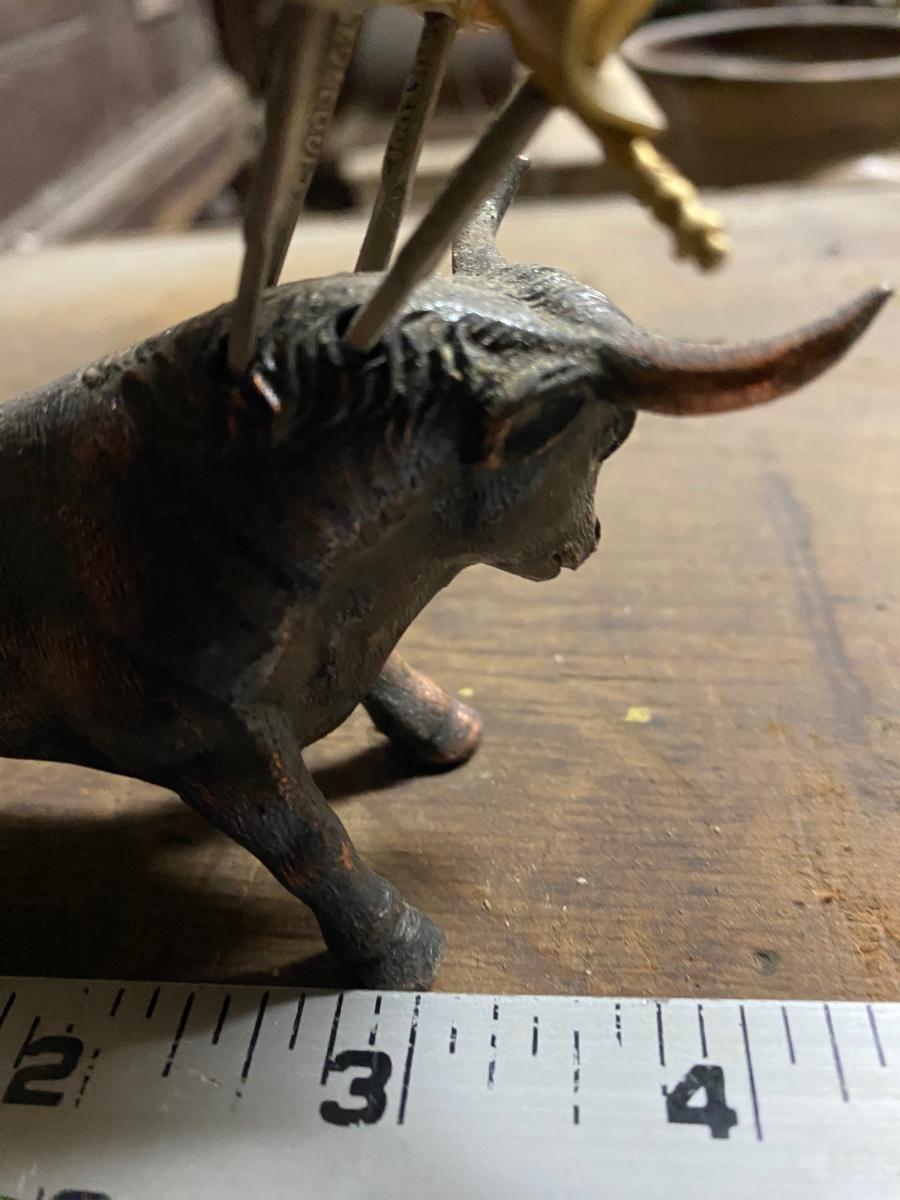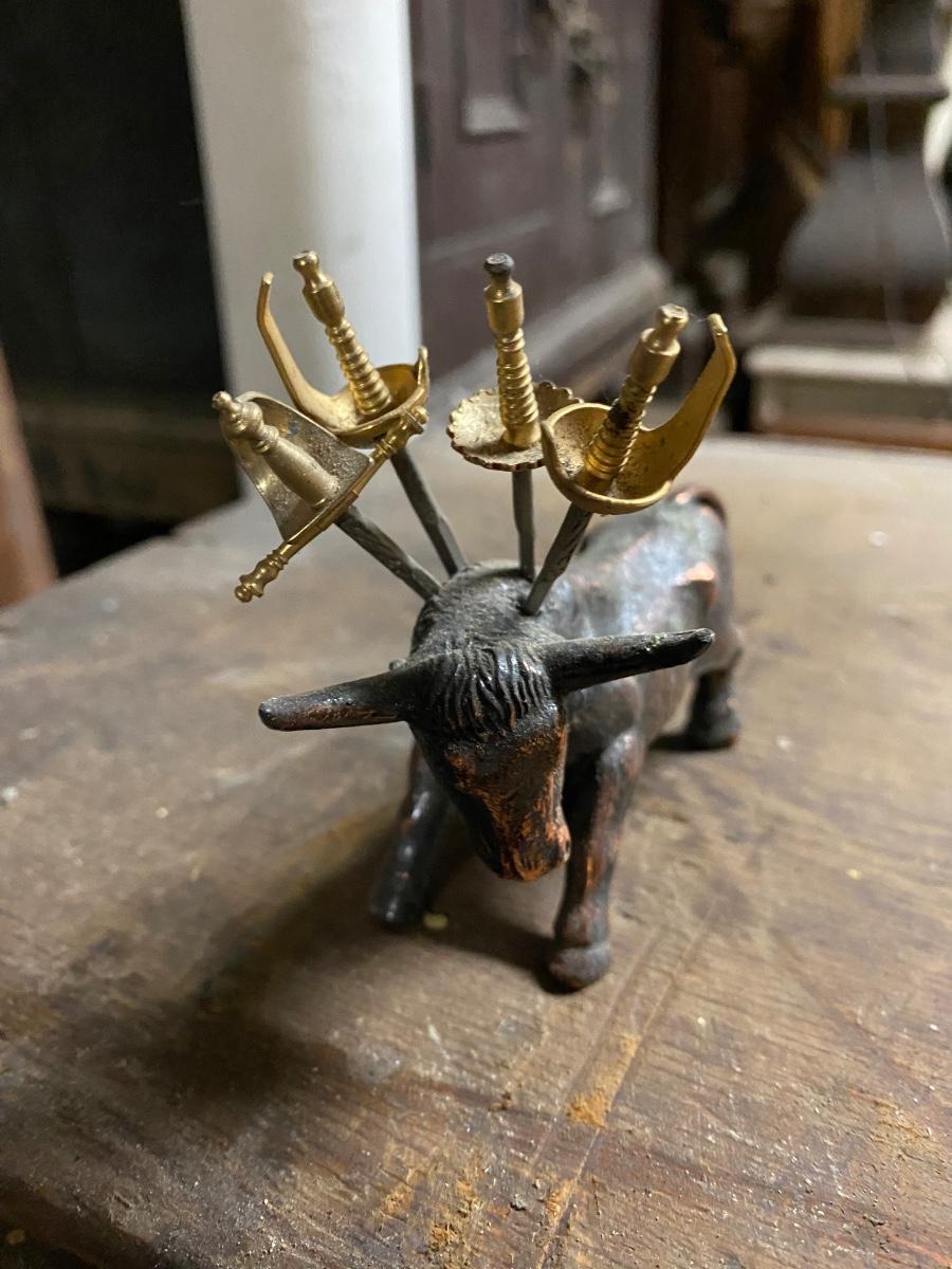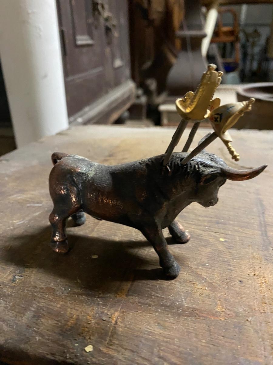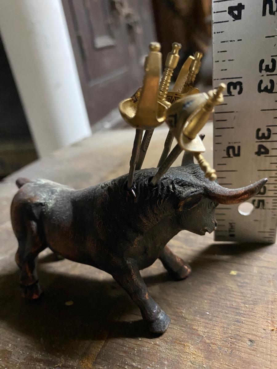 VINTAGE SPANISH TOLEDO SWORD COCKTAIL PICKS & BULL Holder, 4 1/2" long with horn. Comes with 4 words