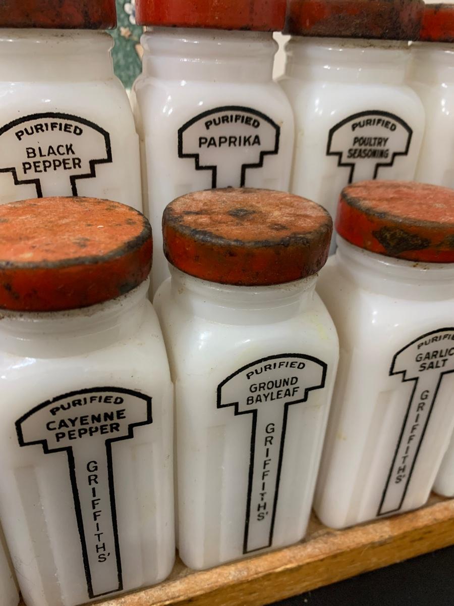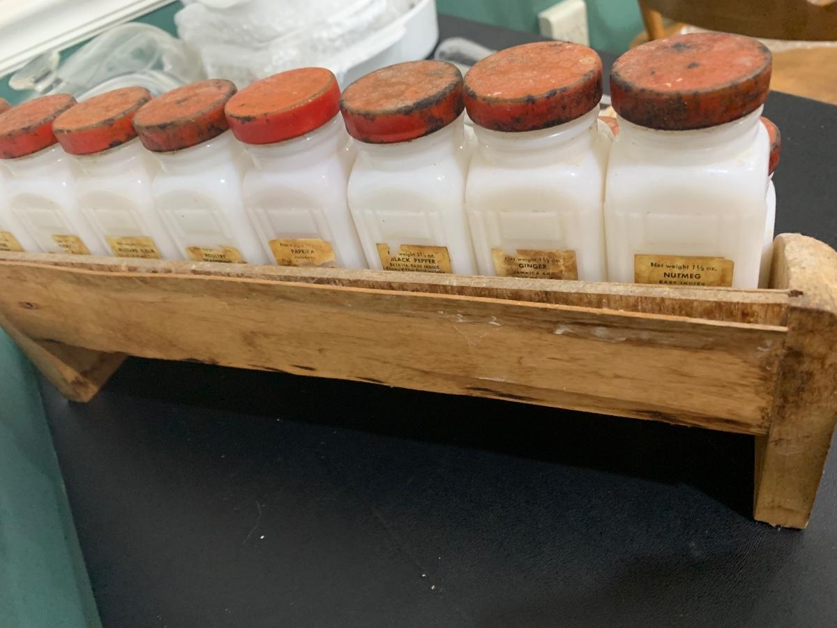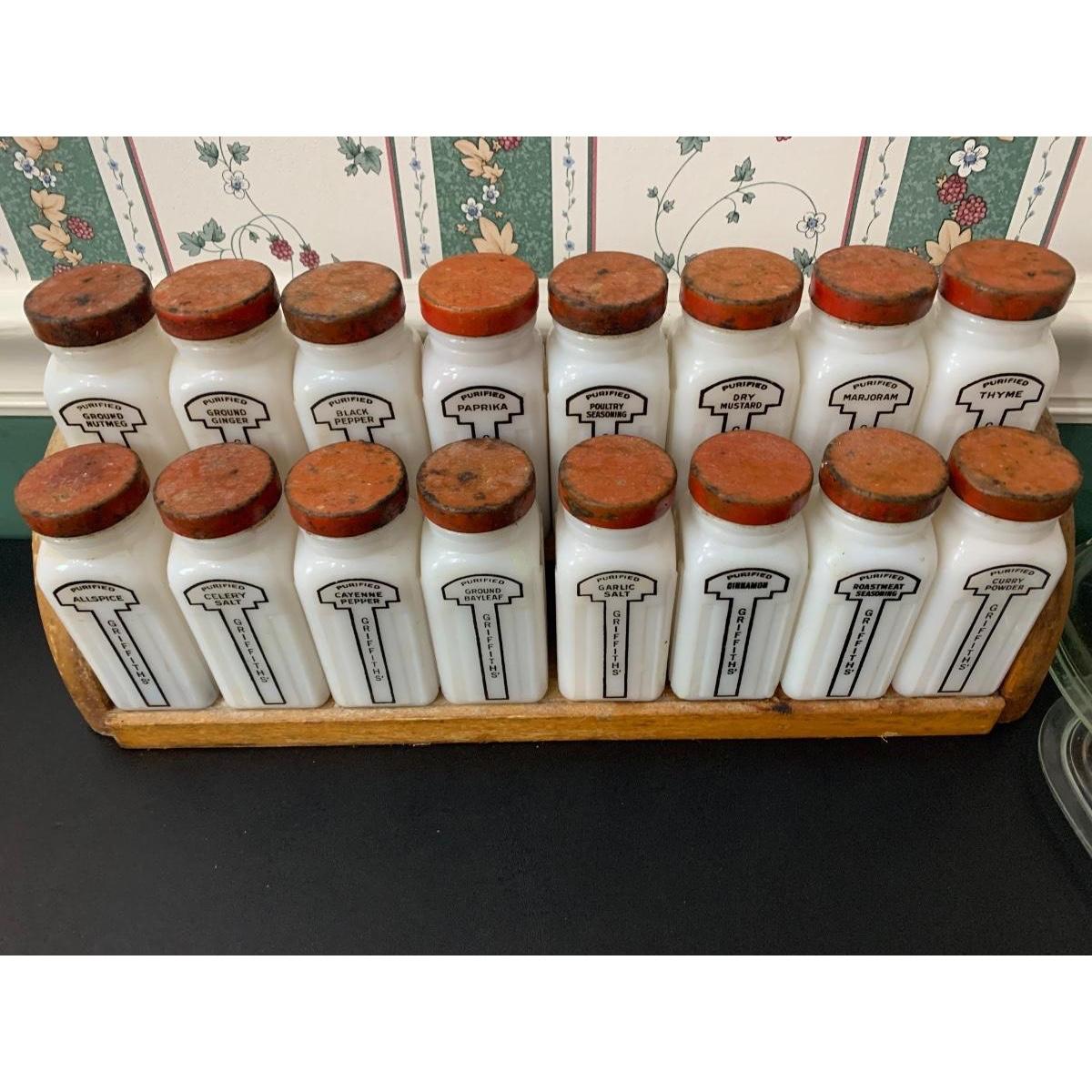 16 Vintage MCM white milk glass jars with wooden shelf spice rack. Probably “Griffiths”.