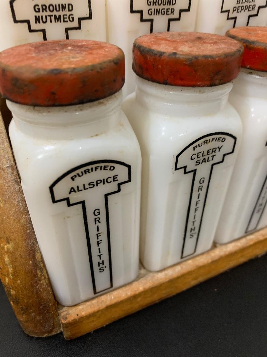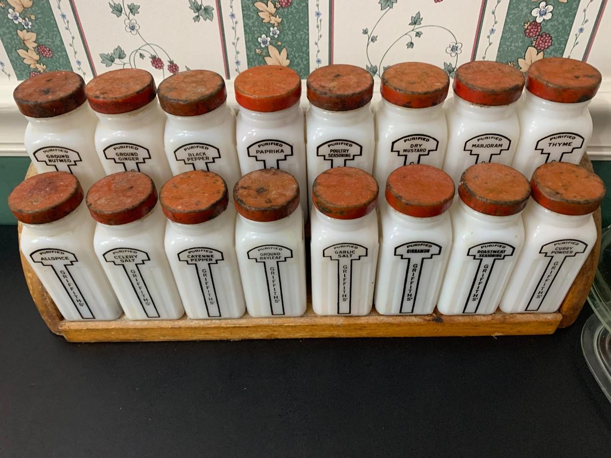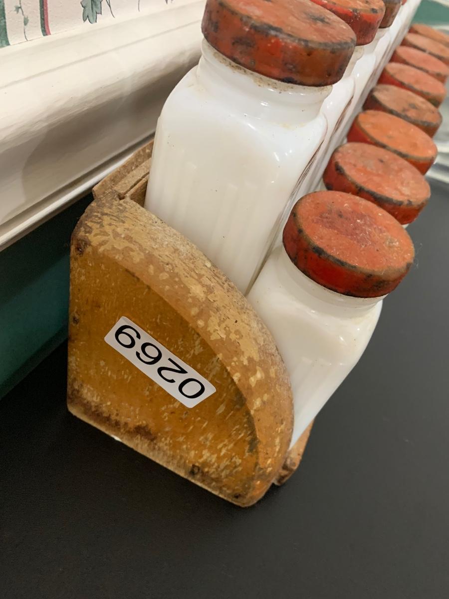 16 Vintage MCM white milk glass jars with wooden shelf spice rack. Probably “Griffiths”.