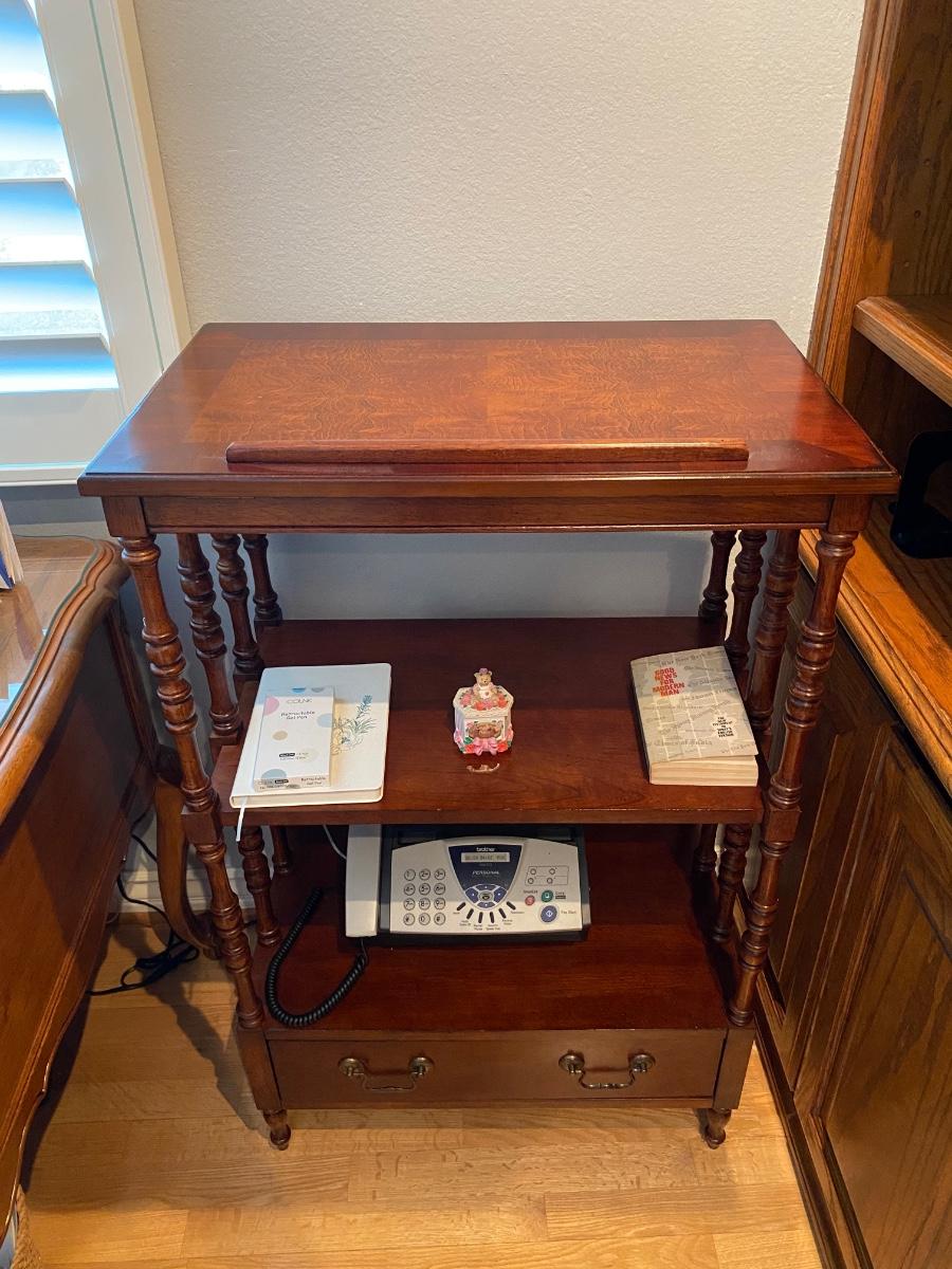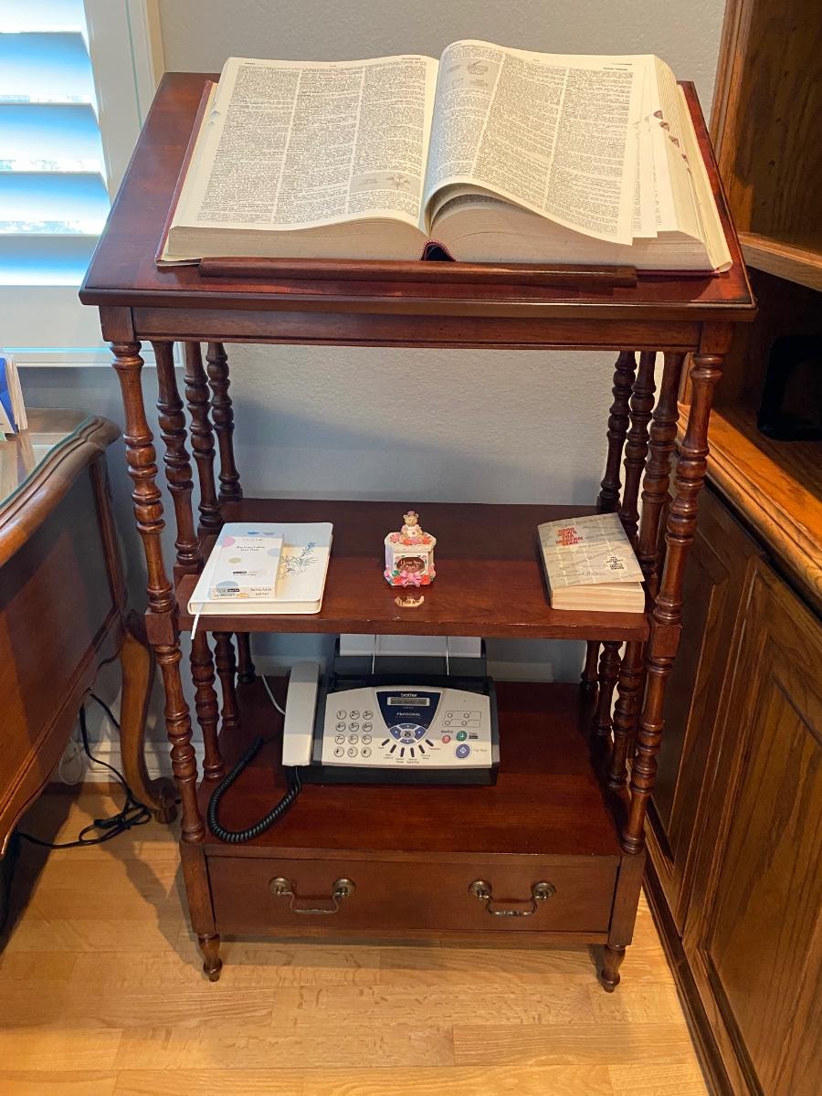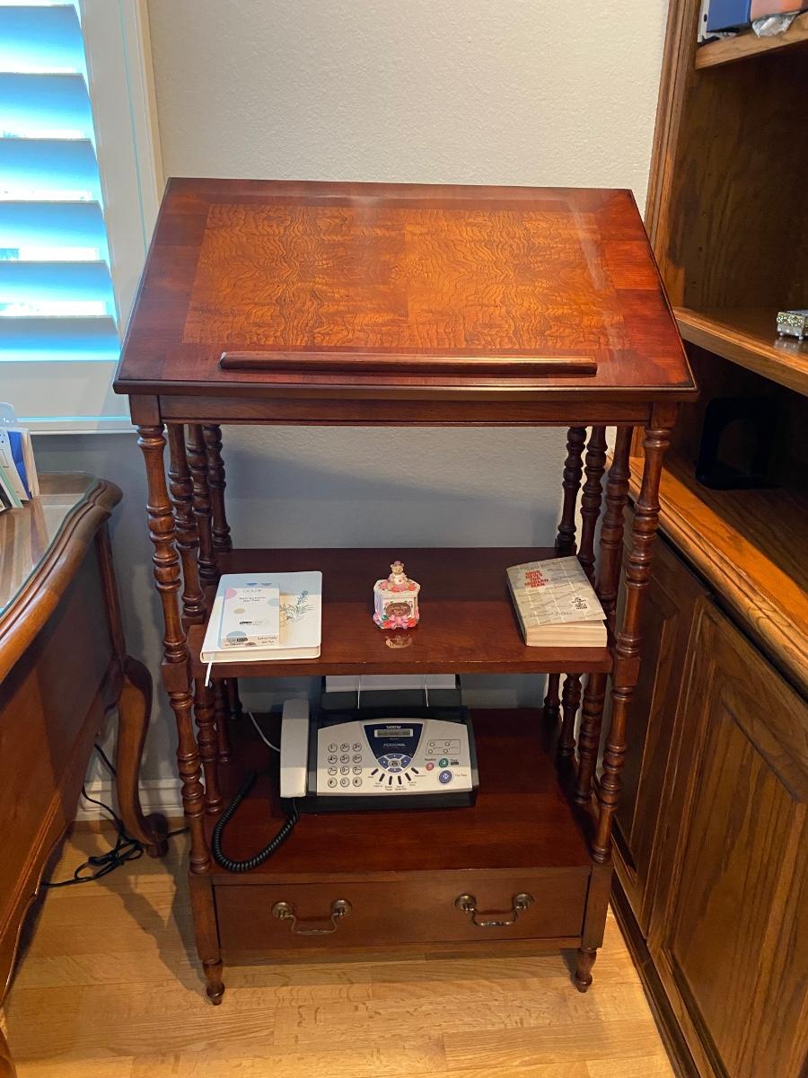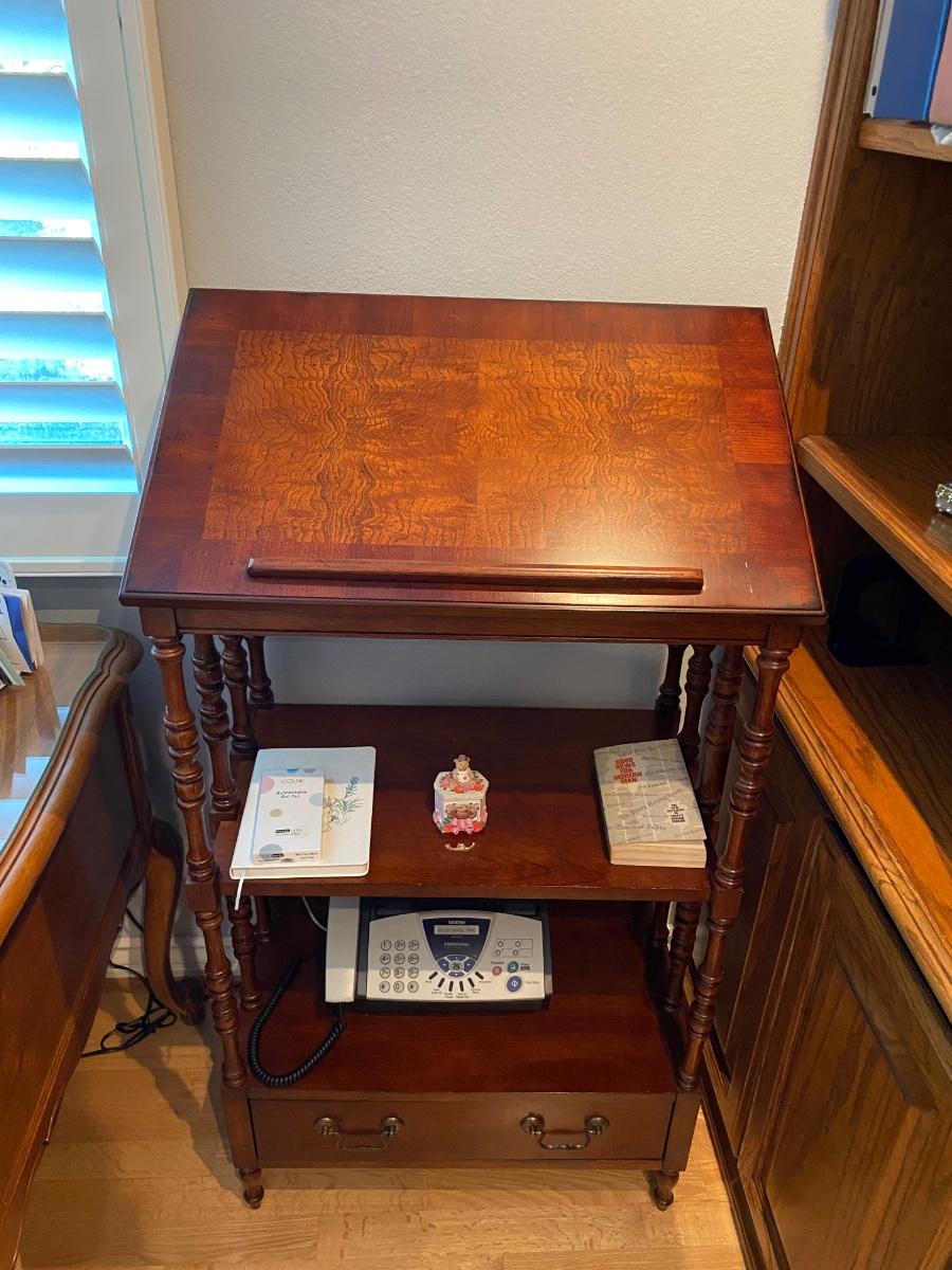 Vintage wood lectern table stand with tilting top. One drawer at the bottom and shelf in the middle. In good condition. Does not come with any items seen in photo. Great for family bible display or in a library/den.