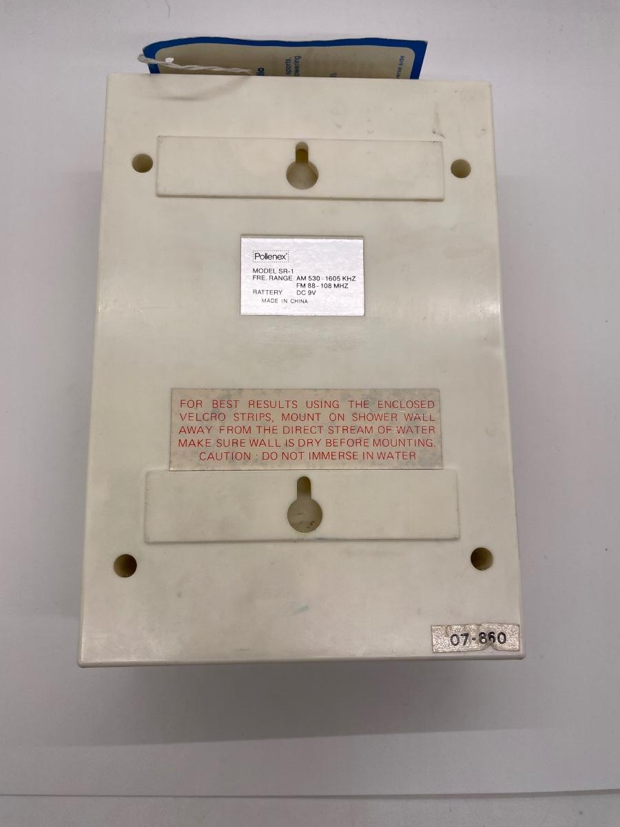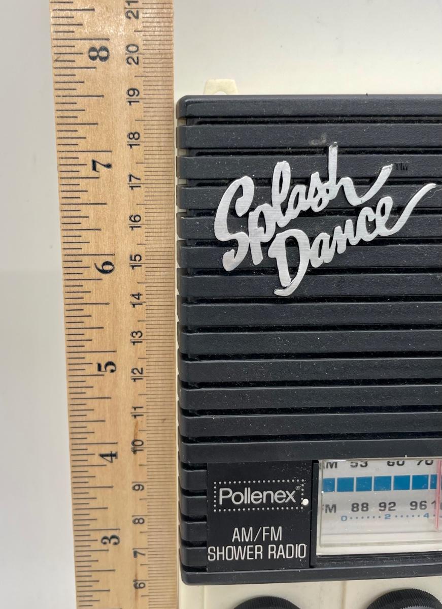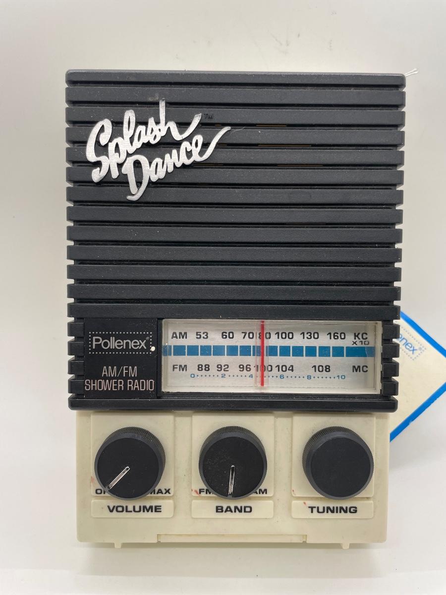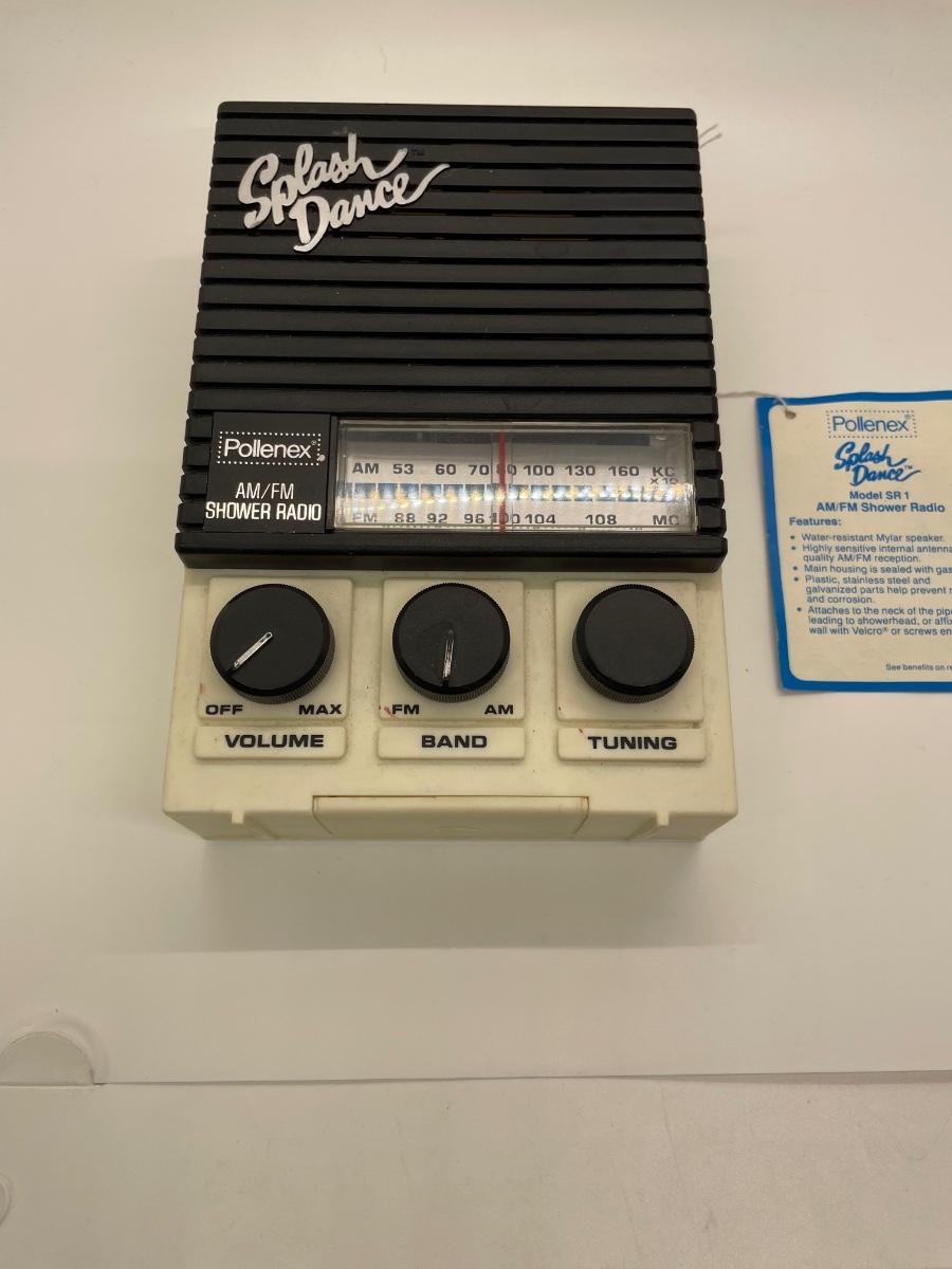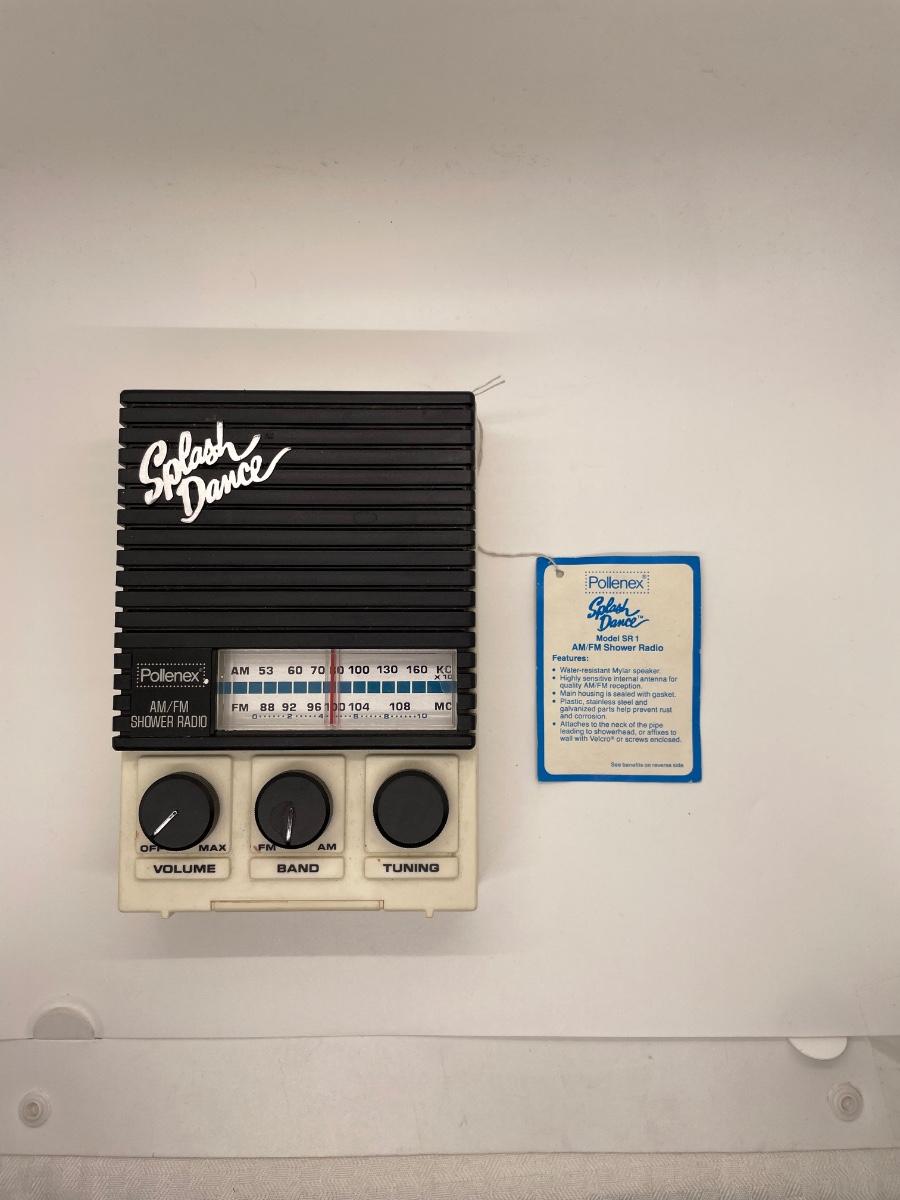 Splash Dance AM-FM Shower Radio by Pollenex. Uses 9-volt battery, tested, works as expected.