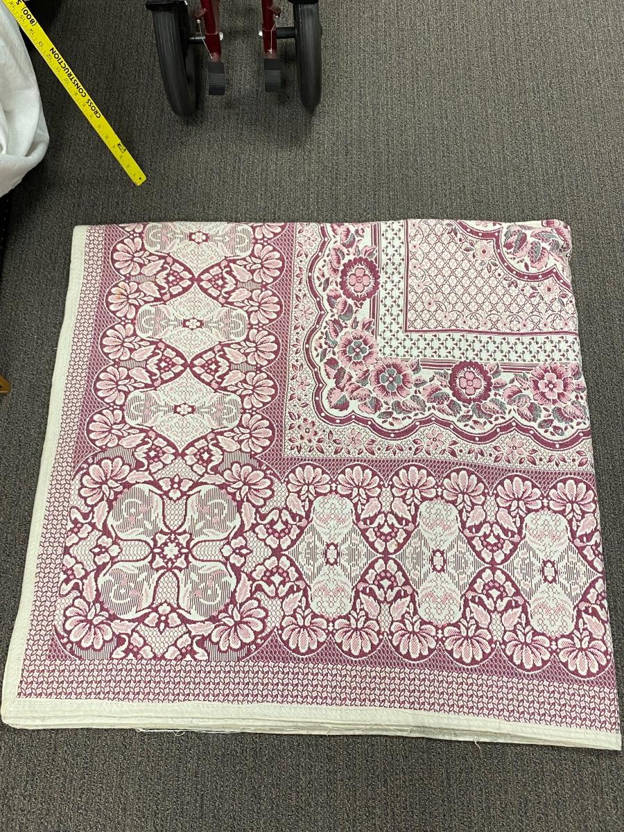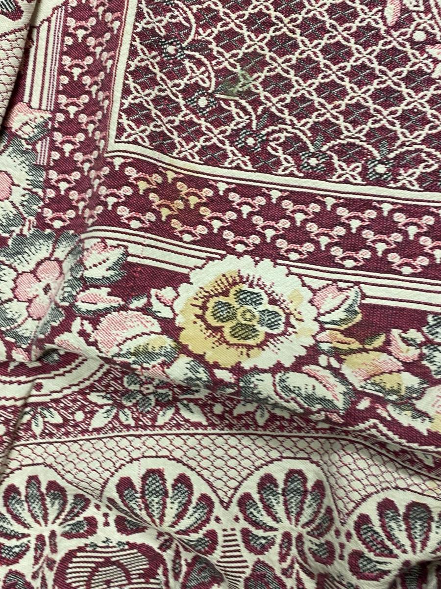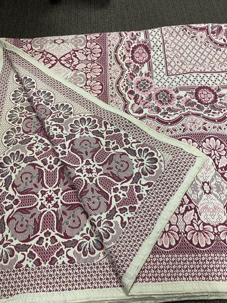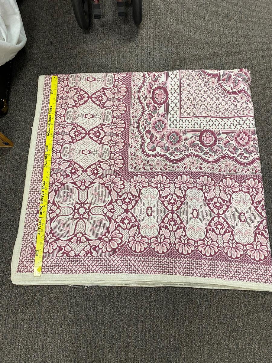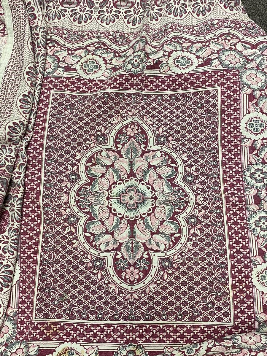 Vintage Square Area Rug Blanket. About 6' square. There is some spots and stains. Heavy weight material makes it seem more like an area rug then a blanket but would work great for outdoors like a picnic. Beautiful floral pattern.