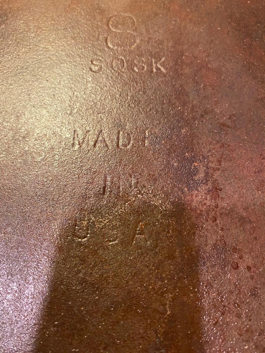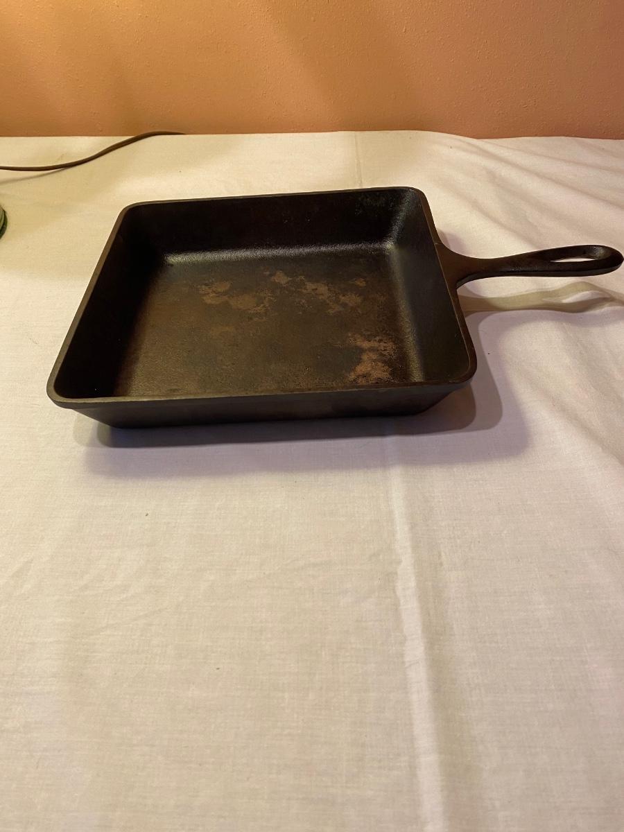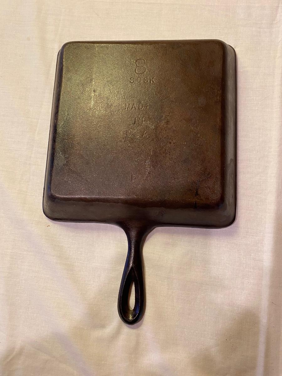 Vintage Square cast iron skillet made in USA, marked 8 SOSK. Approx 9-1/2 x 9-1/2.