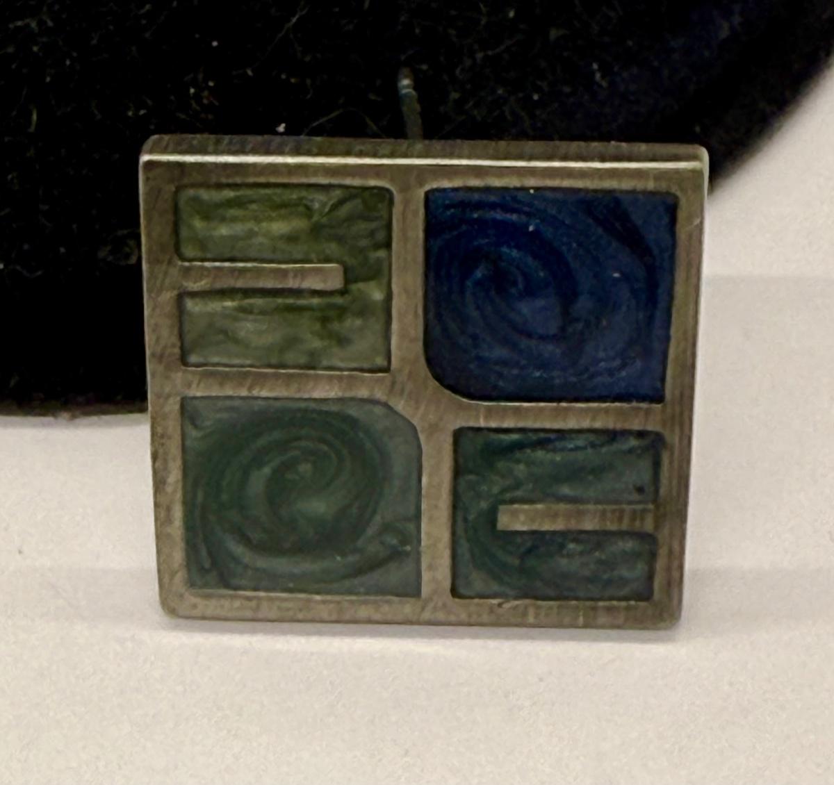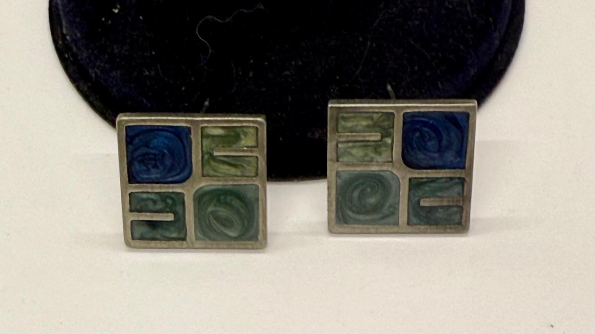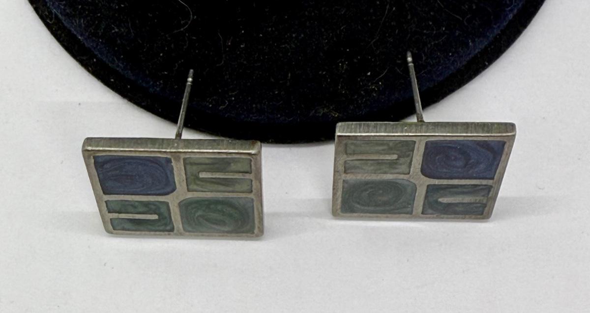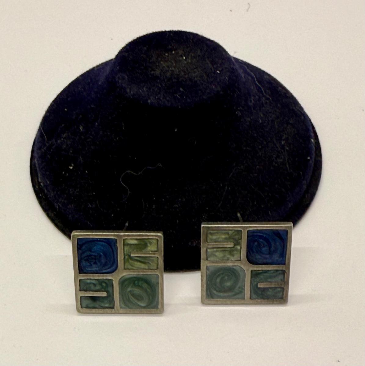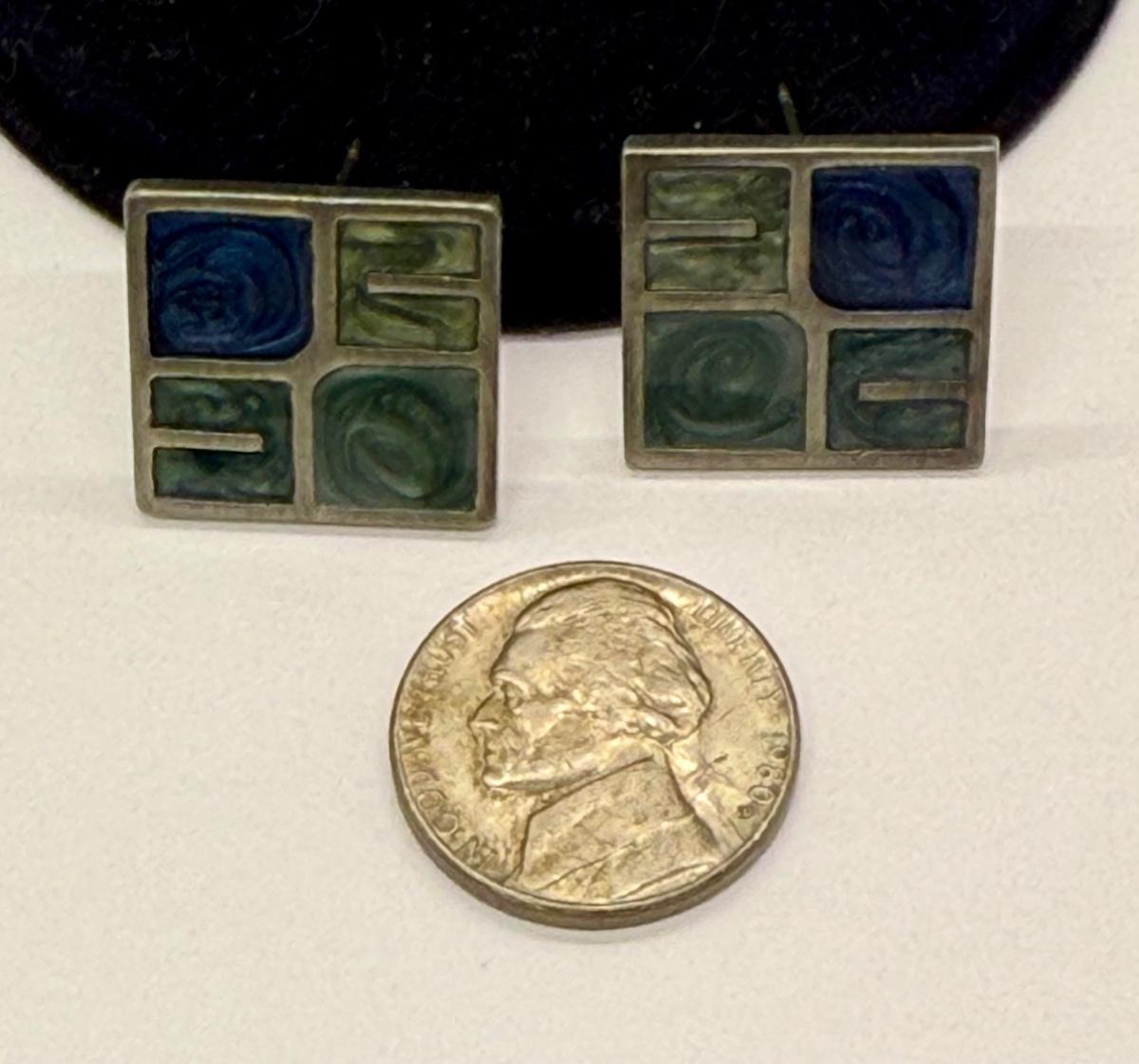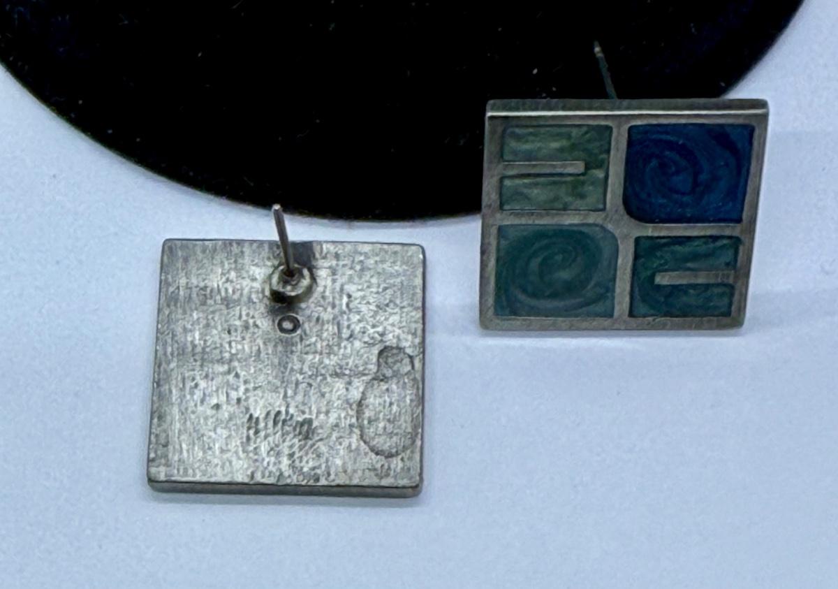 Silvertone "panes" holding green and blue chips, sort of like miniature stained glass windows. For pierced ears. Good condition.