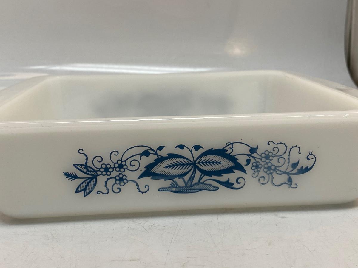Vintage Square Glasbake 9" Baking Dish Brownie Pan Blue Onion Pattern. In good condition.