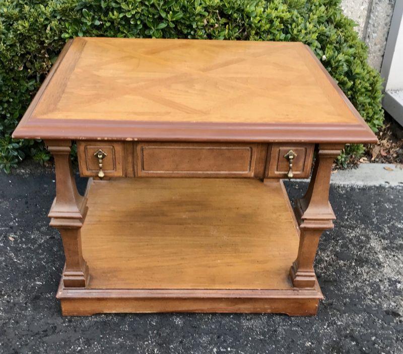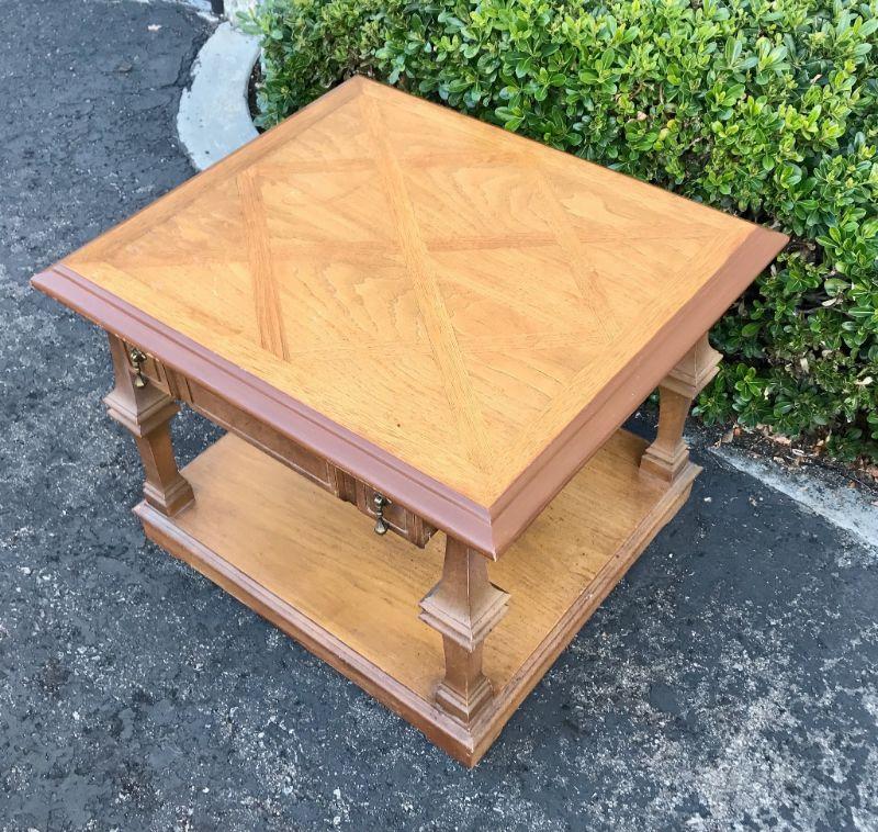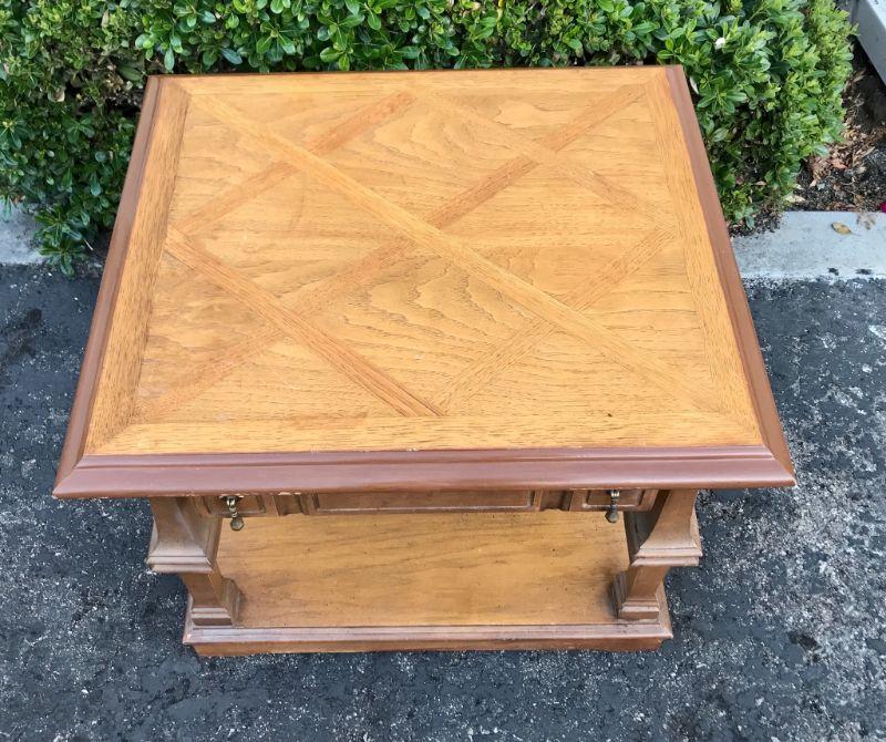 Vintage light wood end table. Great multi tone finish grid design to the top. Measures 30x30x23. Good condition, signs of normal everyday use.