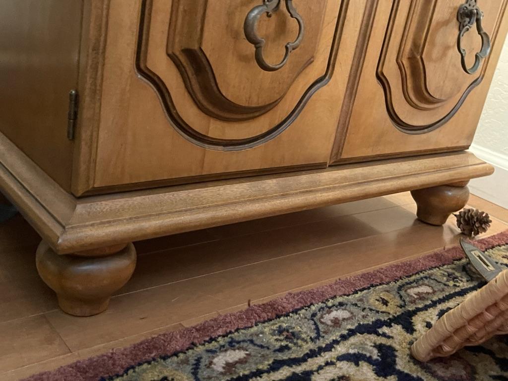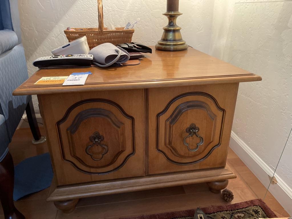 Wood side table with bun feet. Large storage with carved doors and pull handles. In great condition, no obvious marks. Matches Lot 11