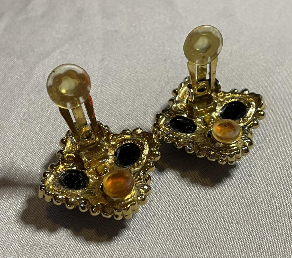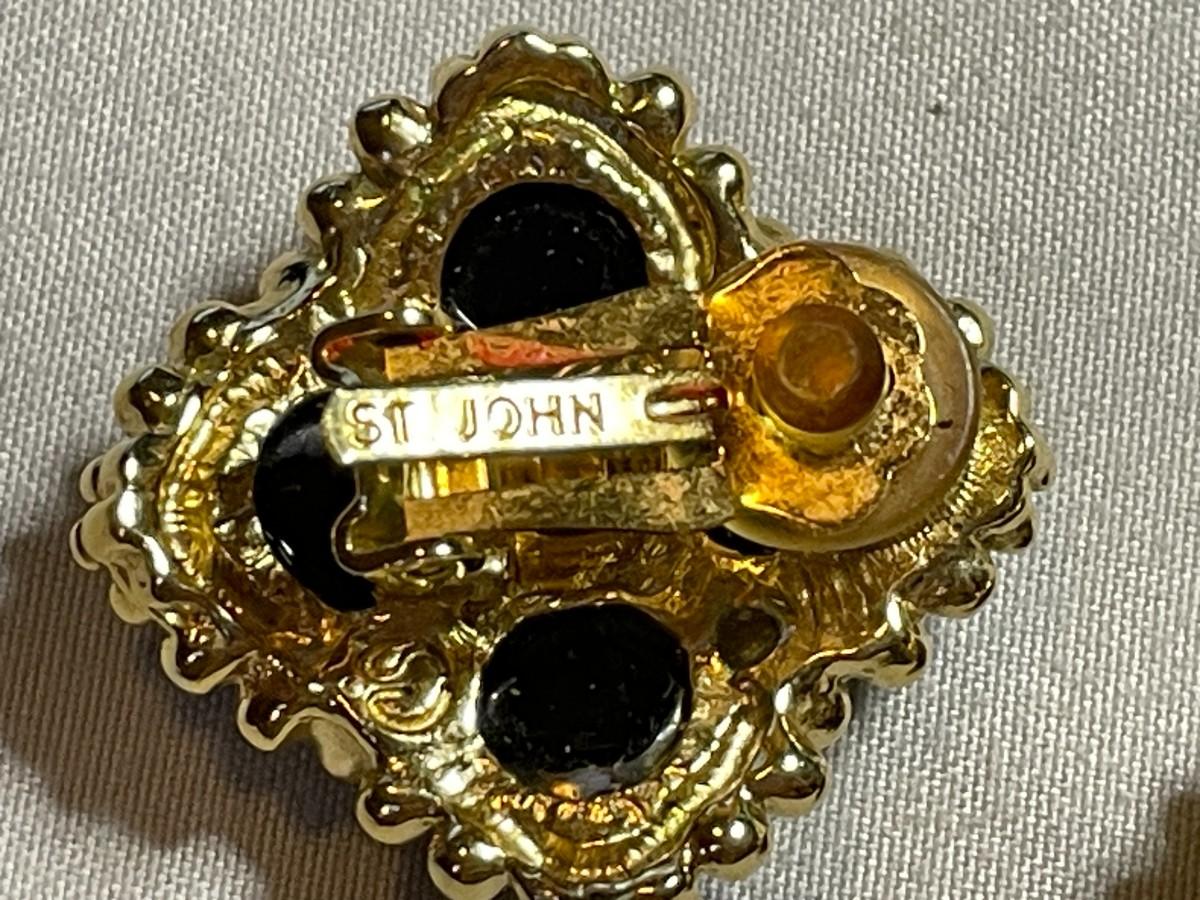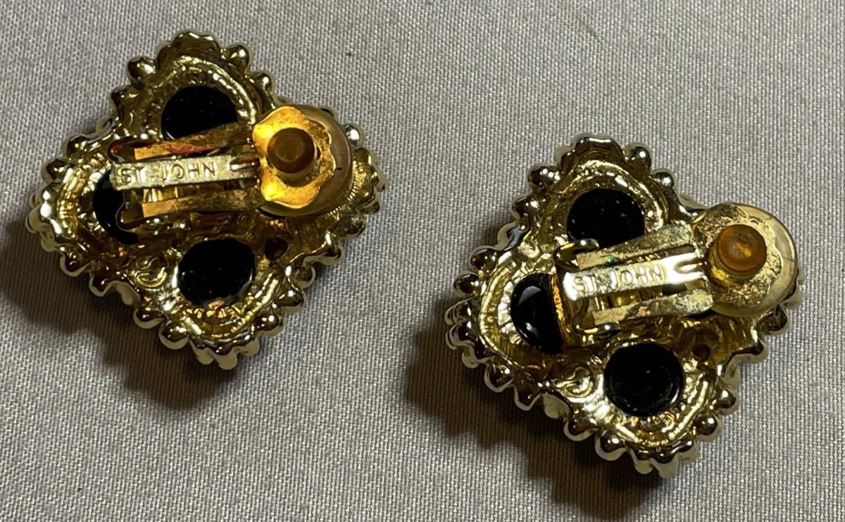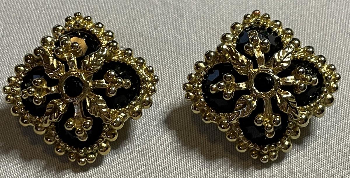 These are gold tone metal with black glass faceted accents. They are about 1 inch square and in excellent condition.