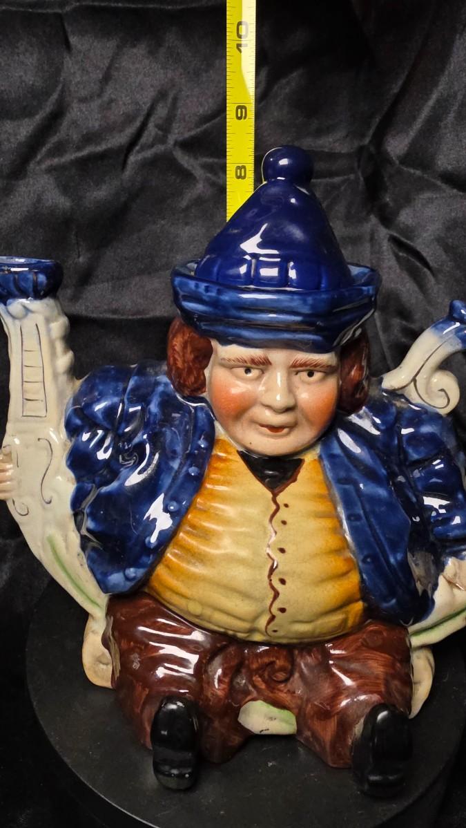Rich cobalt blues and warm golden tones bring the figure to life, from the rounded hat that forms the removable lid to the expressive facial features and carefully detailed garments. The flowing curves of the handle and spout integrate seamlessly into the character’s form, showcasing the craftsmanship and storytelling typical of vintage Staffordshire production.