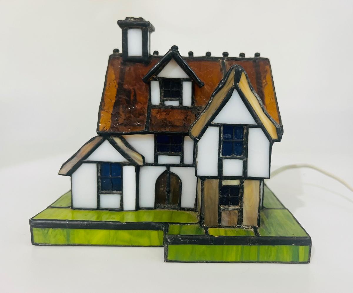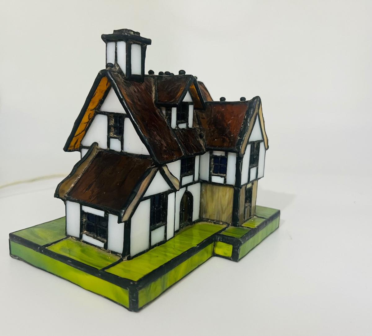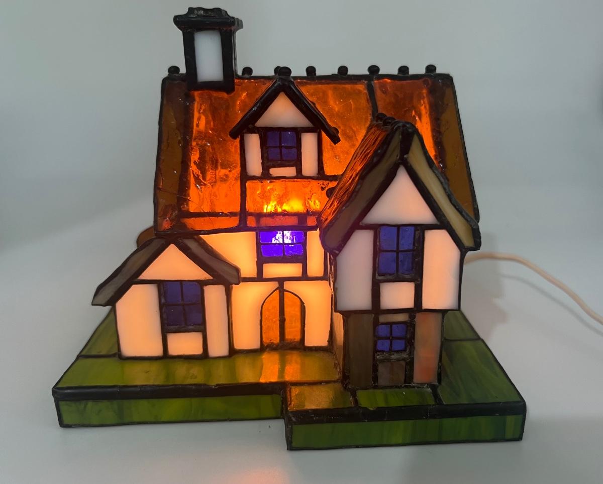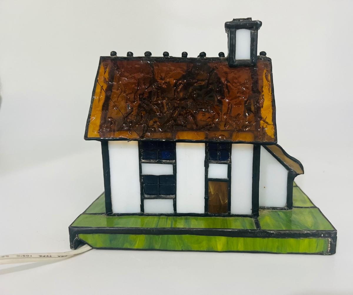 One Vintage stained glass cottage from Germany measures 6 inches tall, 6 1/2 inches wide and 5 1/2 inches deep.