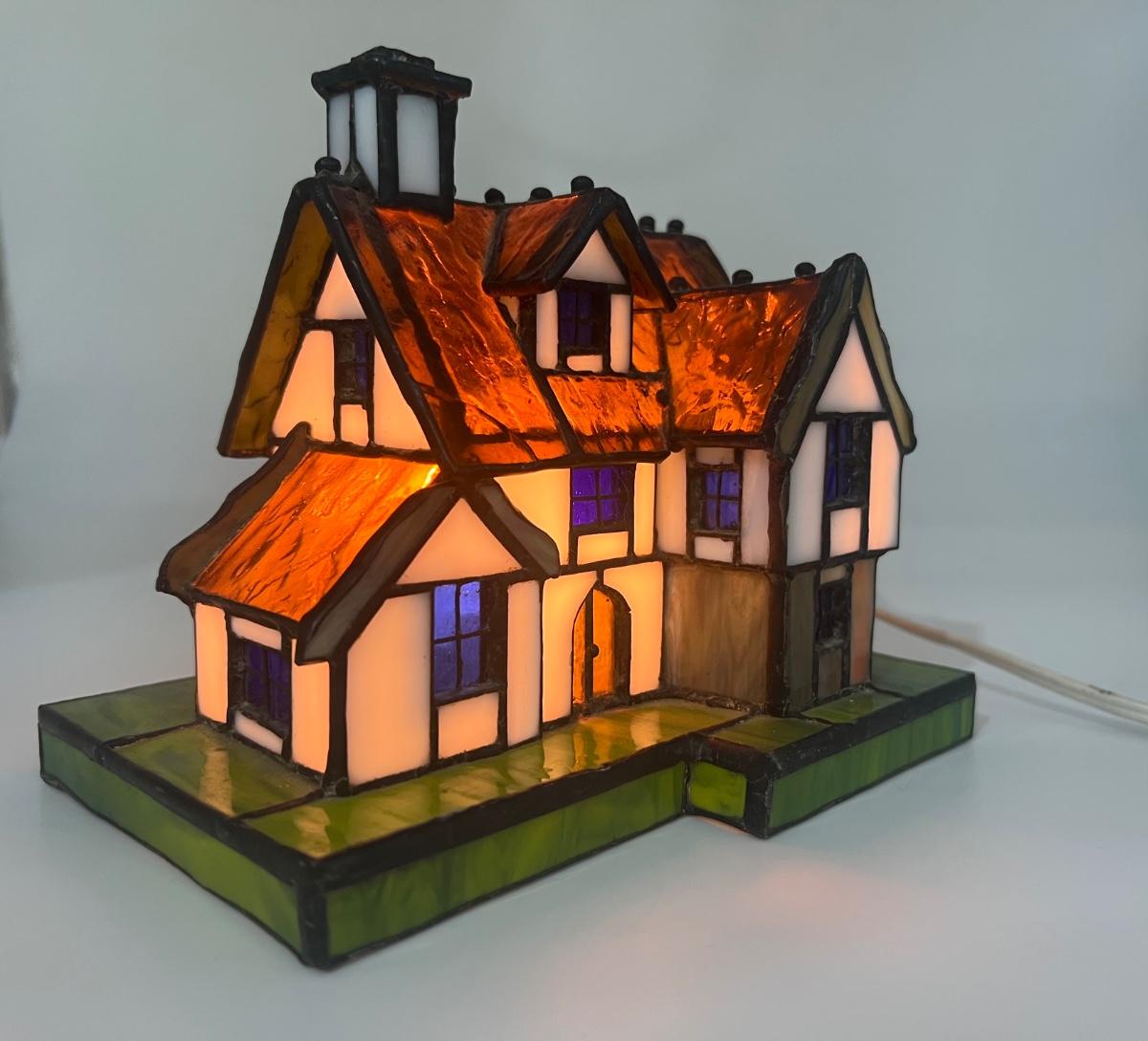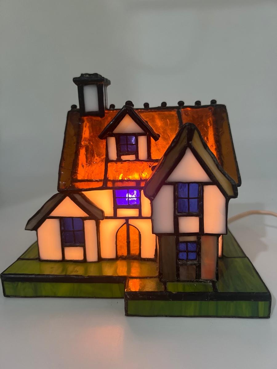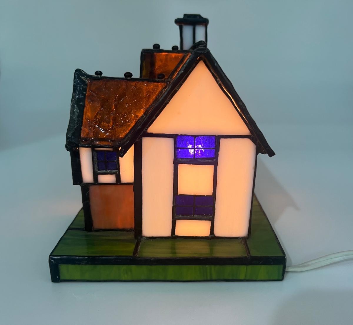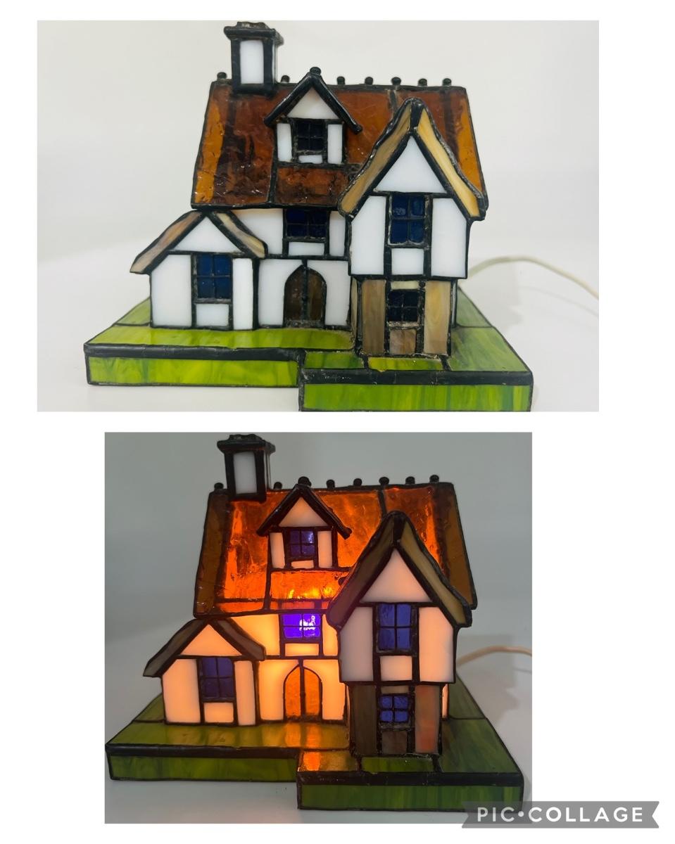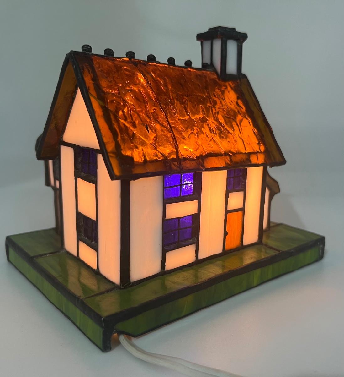 One Vintage stained glass cottage from Germany measures 6 inches tall, 6 1/2 inches wide and 5 1/2 inches deep.