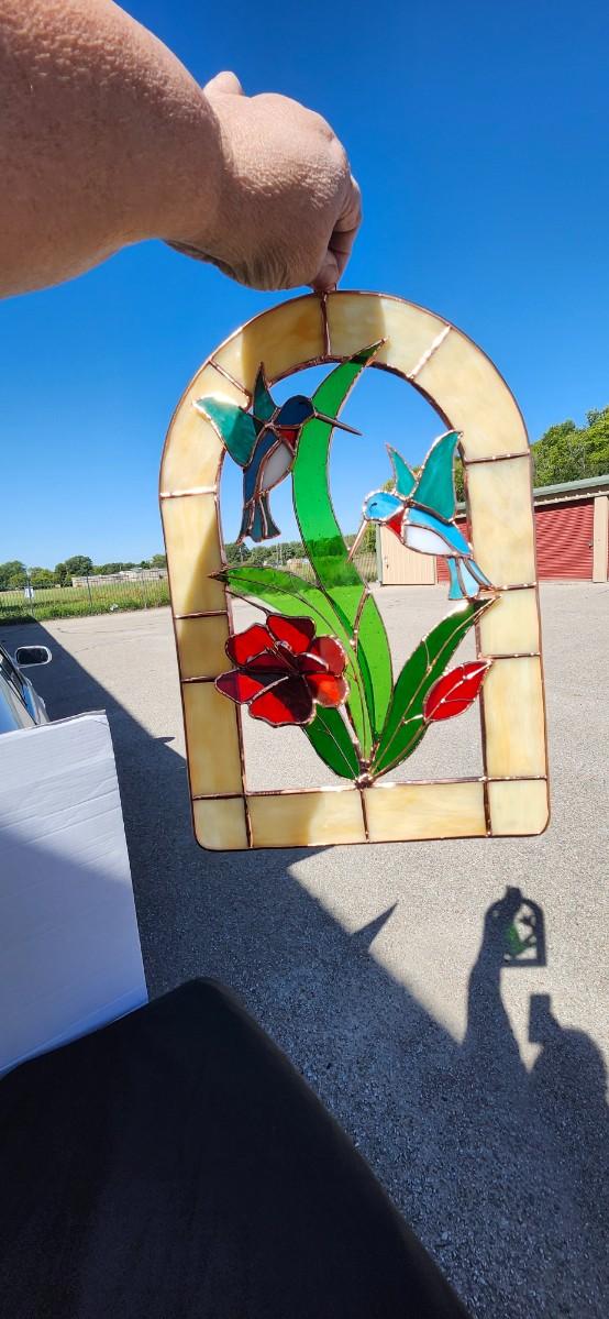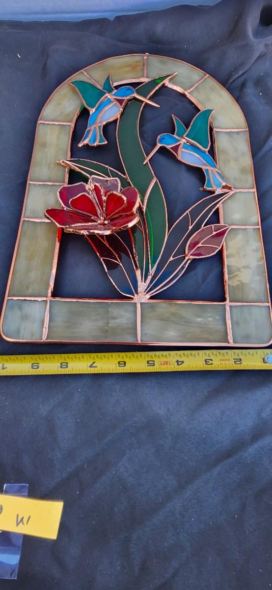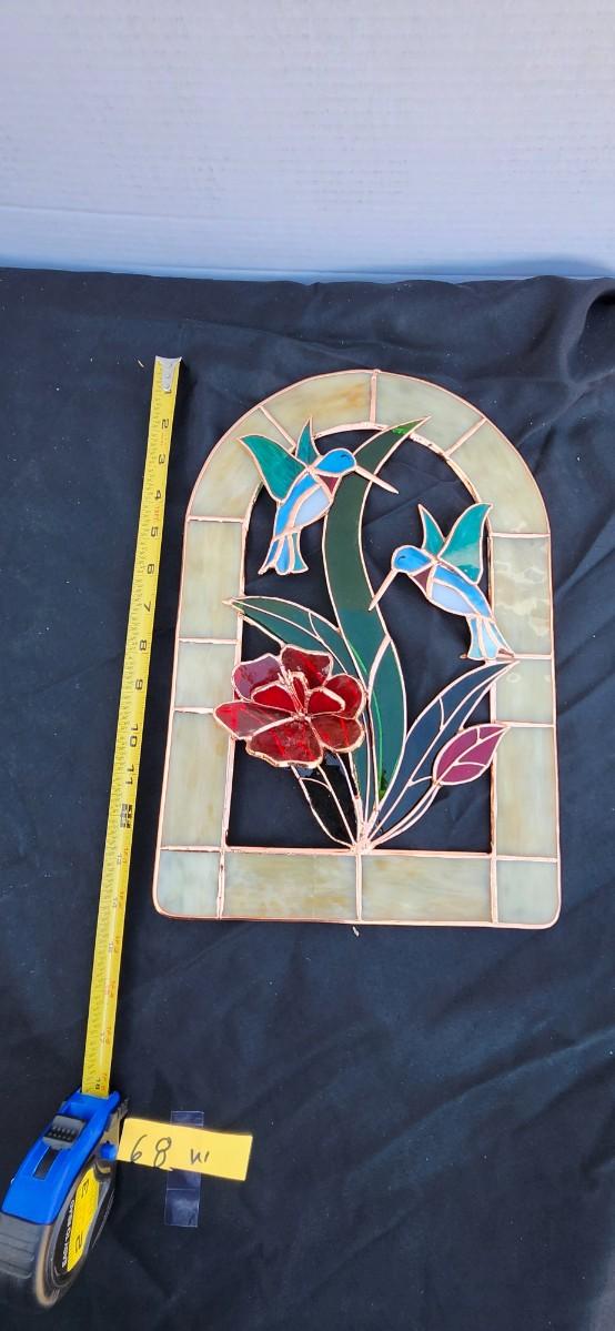Vintage Stained Glass Panel Hanging Sun Catcher 2 birds With Floral Design
