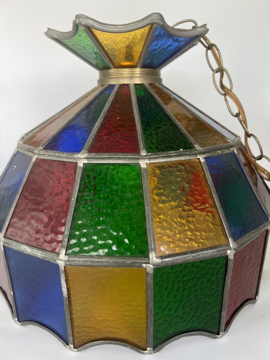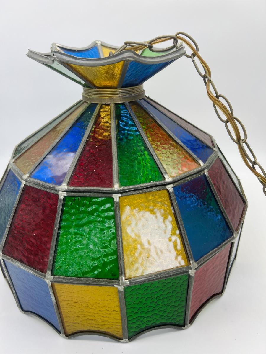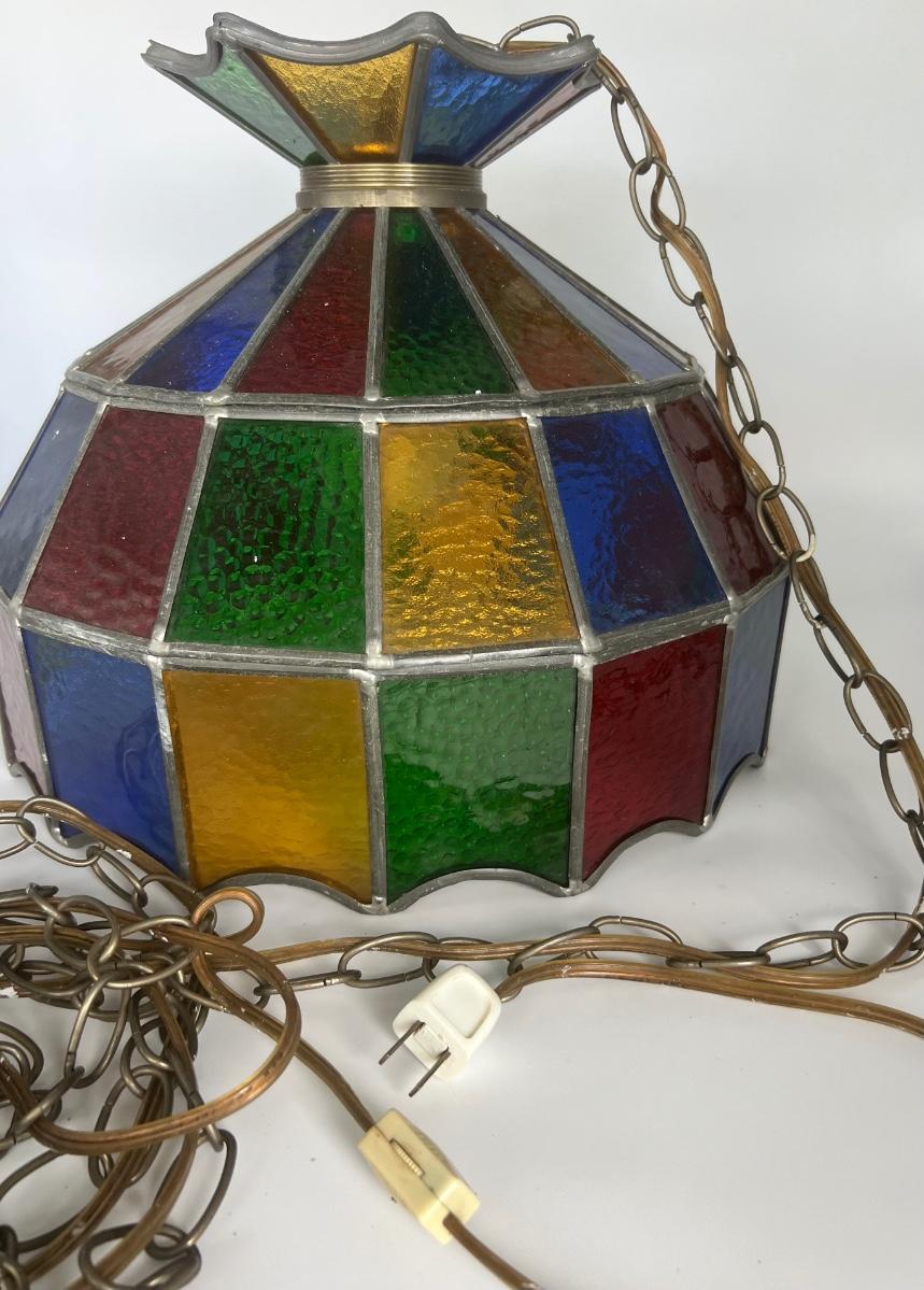 Vintage Stained Glass UNDERWRITERS LABORATORIES portable lamp, swag light. This has a long chain around the wiring and plugs in, see pictures. light measures approximately 13 inches tall and 15 1/2 inches round.