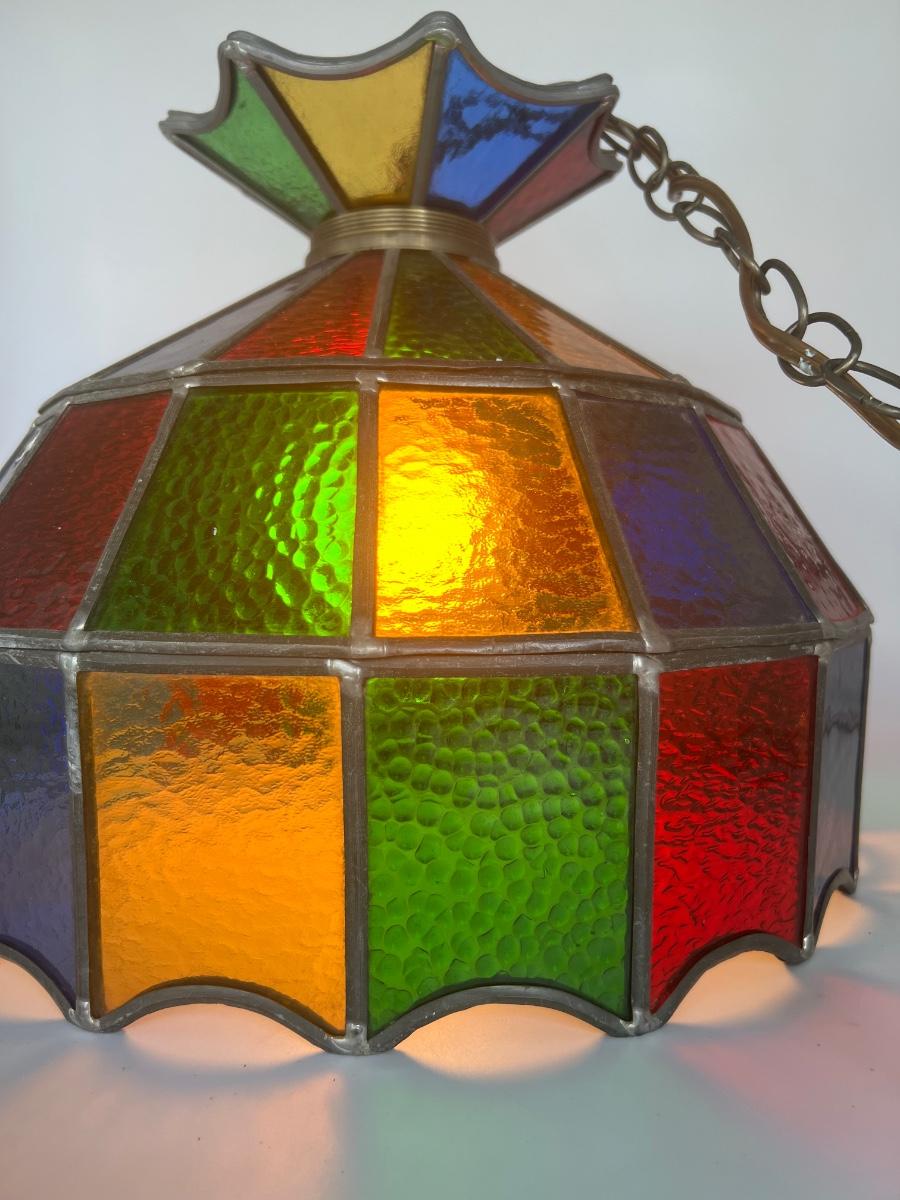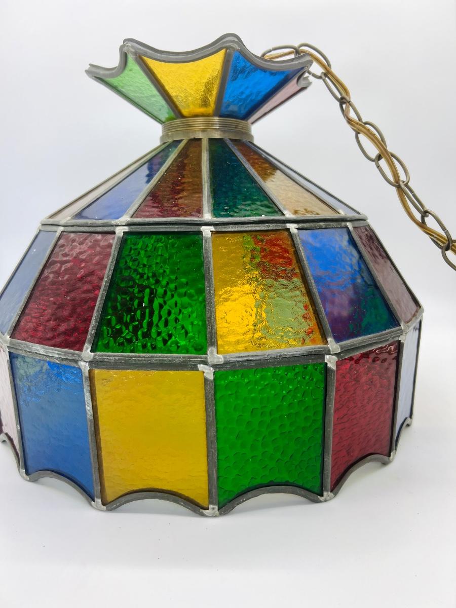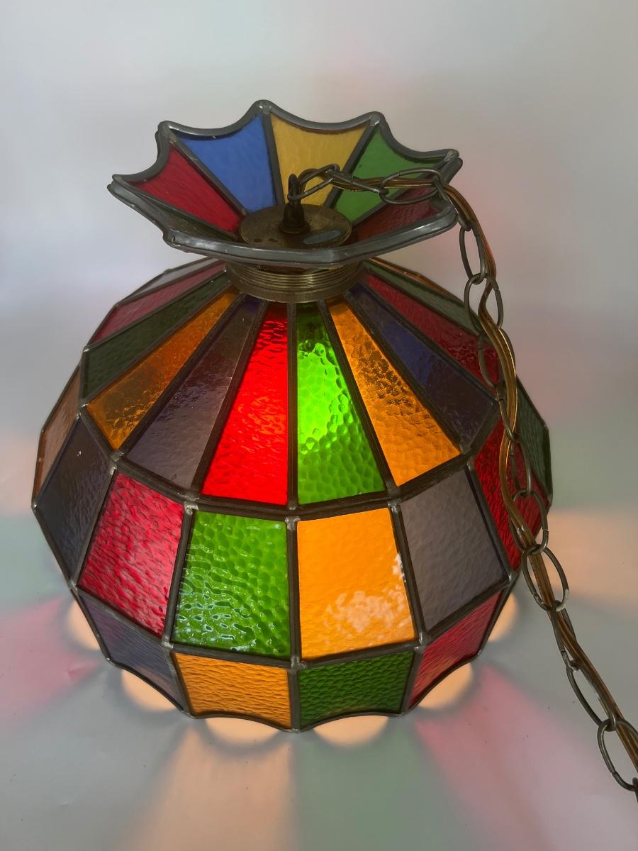 Vintage Stained Glass UNDERWRITERS LABORATORIES portable lamp, swag light. This has a long chain around the wiring and plugs in, see pictures. light measures approximately 13 inches tall and 15 1/2 inches round.