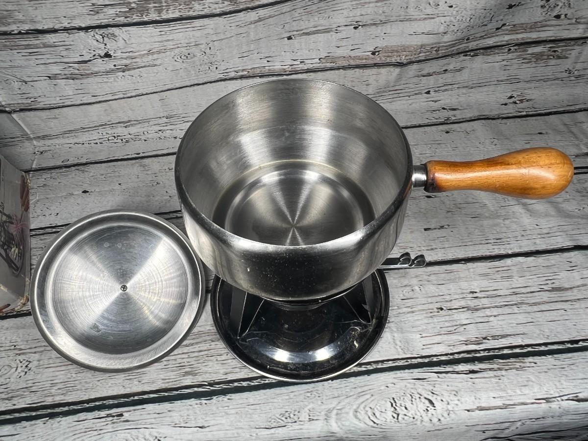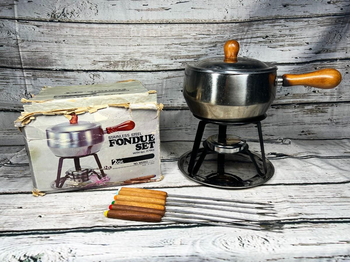 Vintage Stainless Steel Made in Japan Fondue Set with 6 Piece Forks, there is some use to the pan and box, but there is no significant damage and is in good vintage condition. Check pictures for more details and for sizing