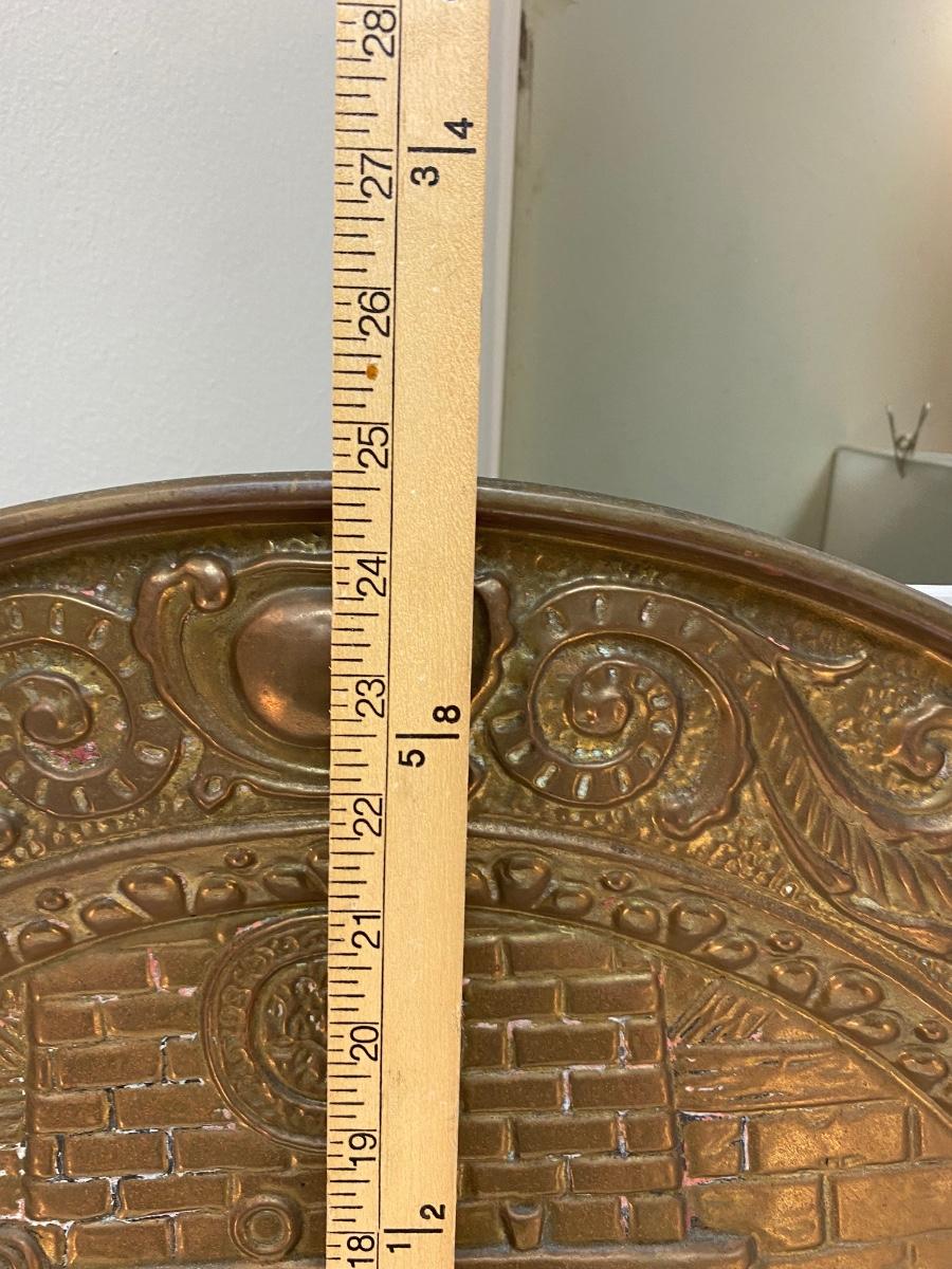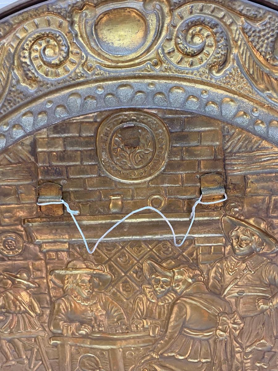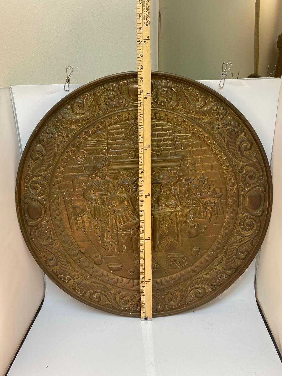 Vintage Stamped Embossed Hammered Brass Copper Metal Tavern Scene Wall Hanging Medallion. Large, about 25" size. No maker mark noticed. It is missing the original hanger on the back.