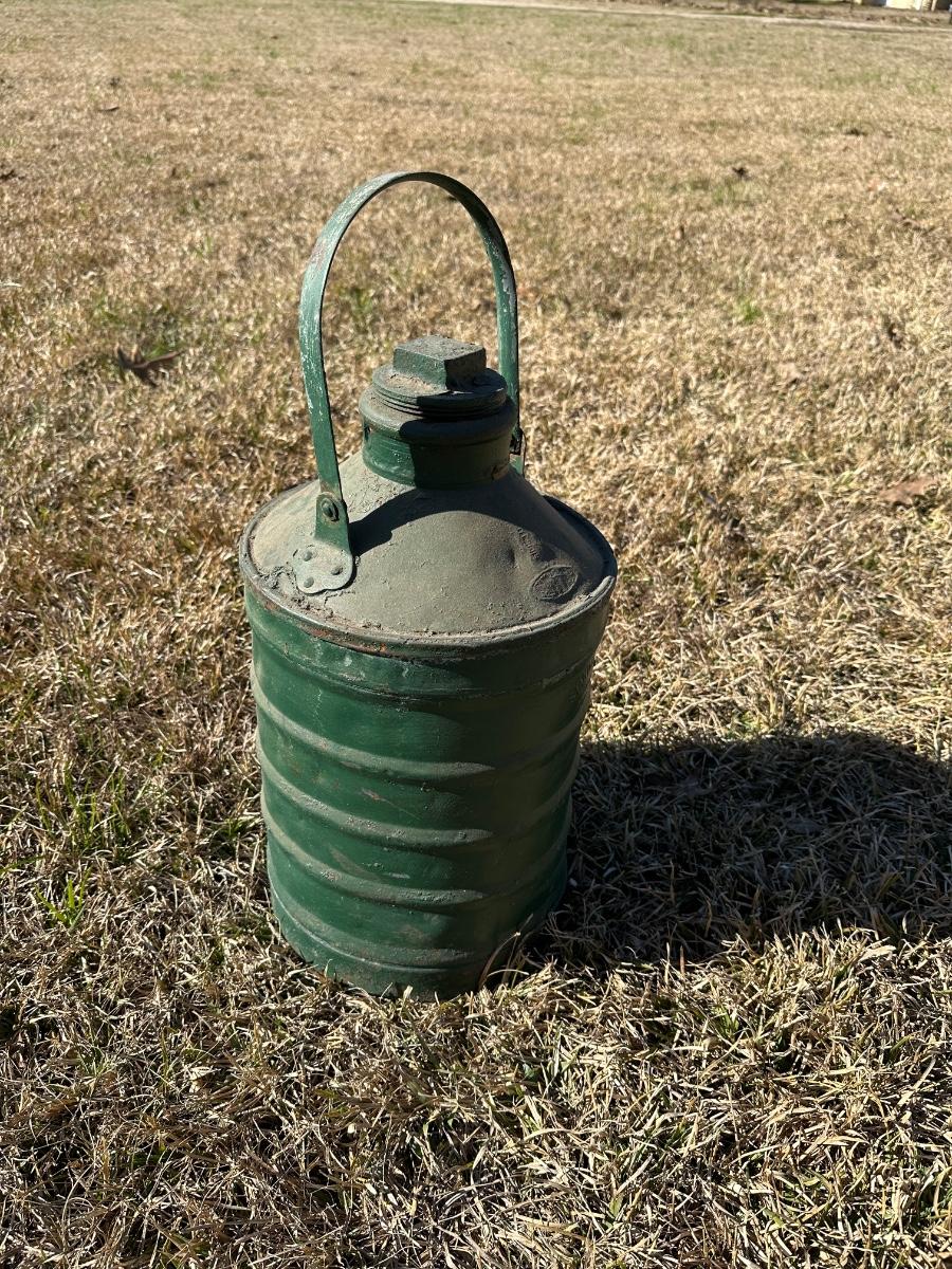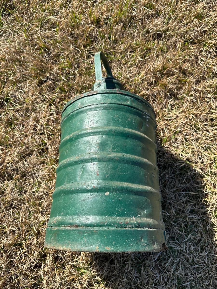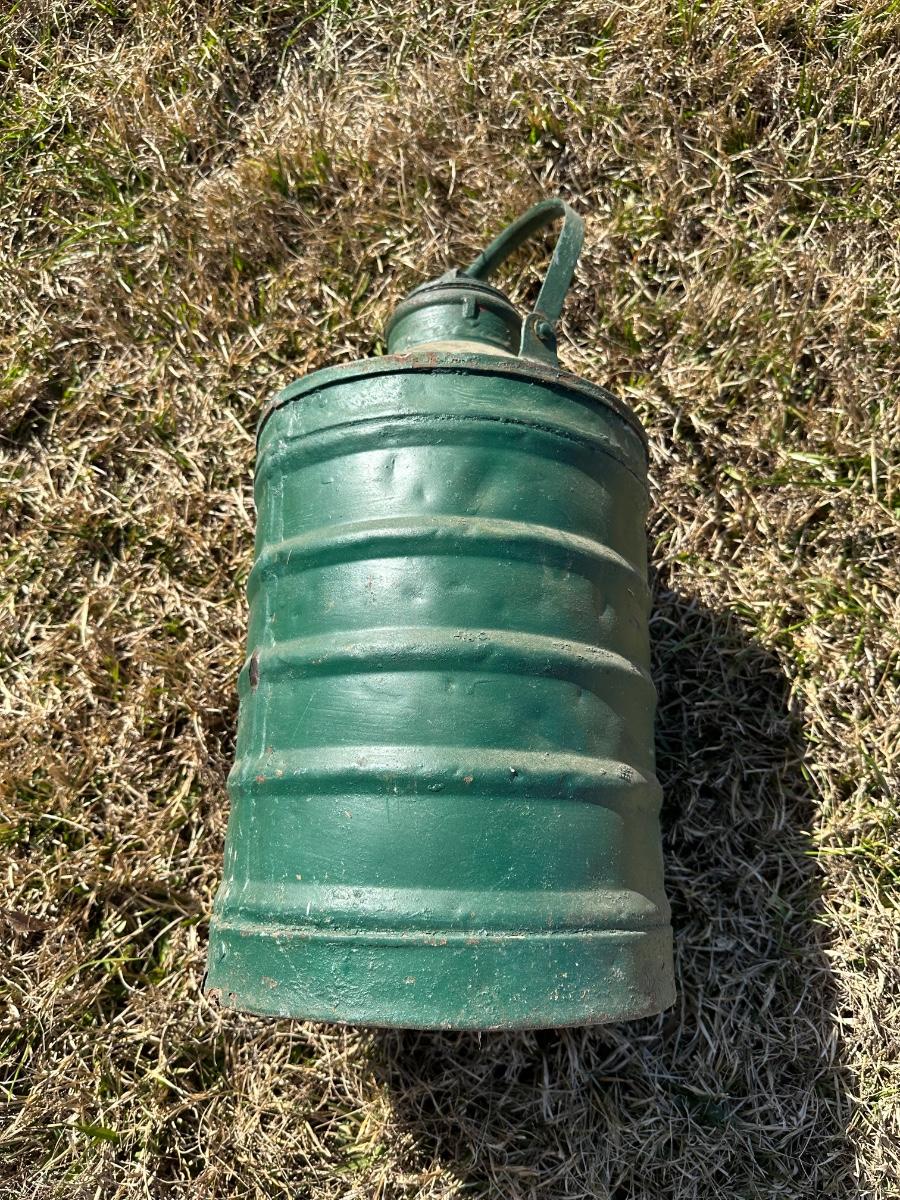 Authentic early 20th-century soda acid fire extinguisher with original green paint and embossed lettering. Cylindrical ribbed steel body with arched carry handle and screw-top cap. This is an industrial / oil-company issued extinguisher, not a decorative reproduction.