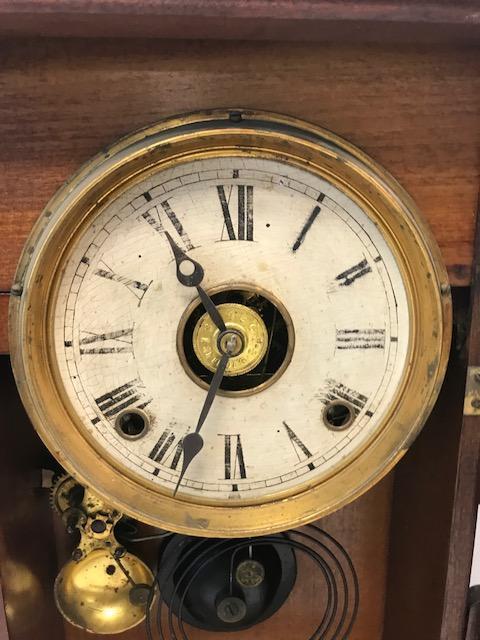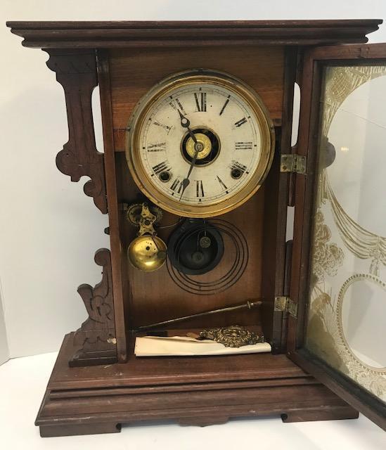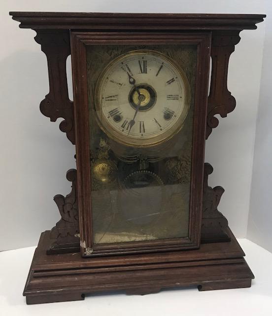 Description: Standing mantle clock/ cracked front glass. Measurement approximate:17 H X 15 W X 4.5 D. Material: Wood & Glass. Shipping cost: $35 Excluding California, Alaska & Hawaii.