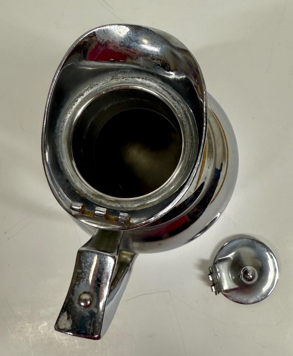 This carafe is in good used condition with the exception of missing the pin from the hinged top.