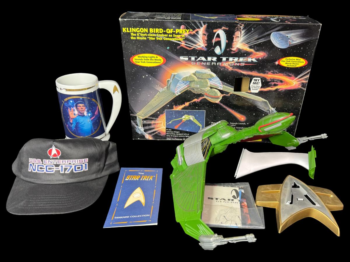 Includes a USS Enterprise ball cap, Mr. Spock tankard, and a Star Trek Generations Klingon Bird of Prey (assembled). Total of three pieces. The tankard and the Bird of Prey include the original packaging. Pre-auction estimate: $75-$100.