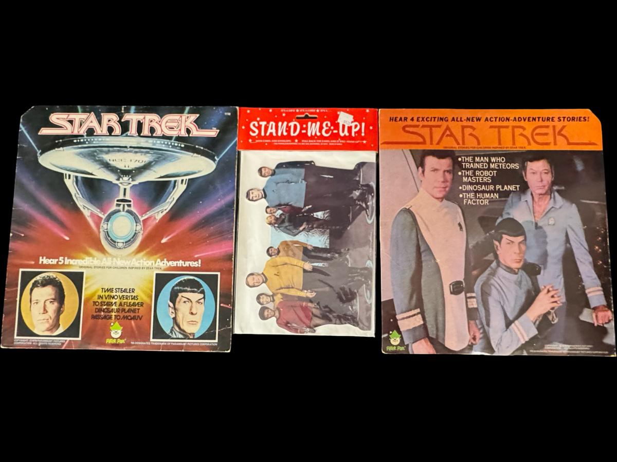 Includes two Star Trek albums (not tested), fan club interviews for original cast members, and an unopened stand-me-up gift card. Total of 11 pieces. Pre-auction estimate: $25-$50.
