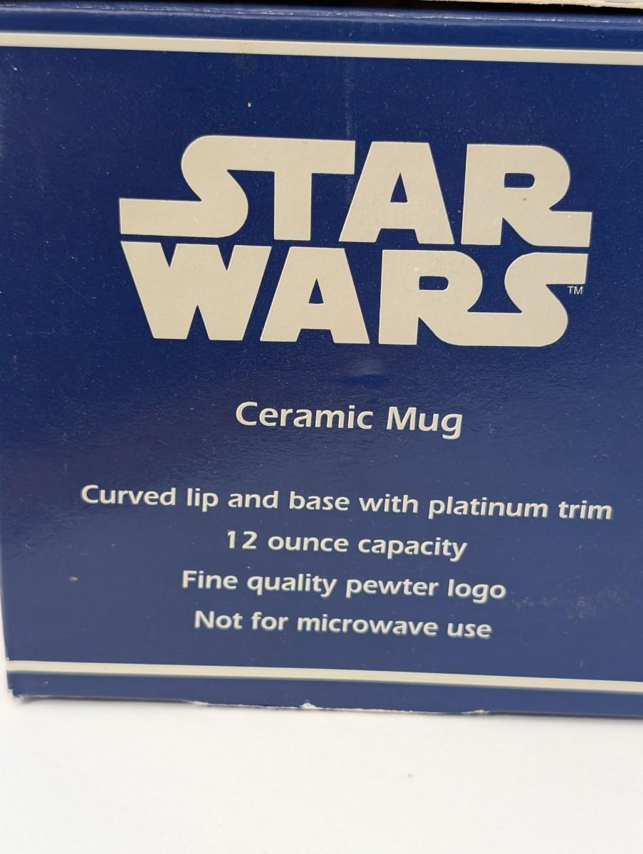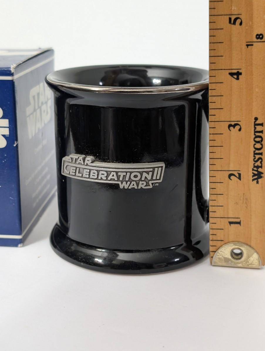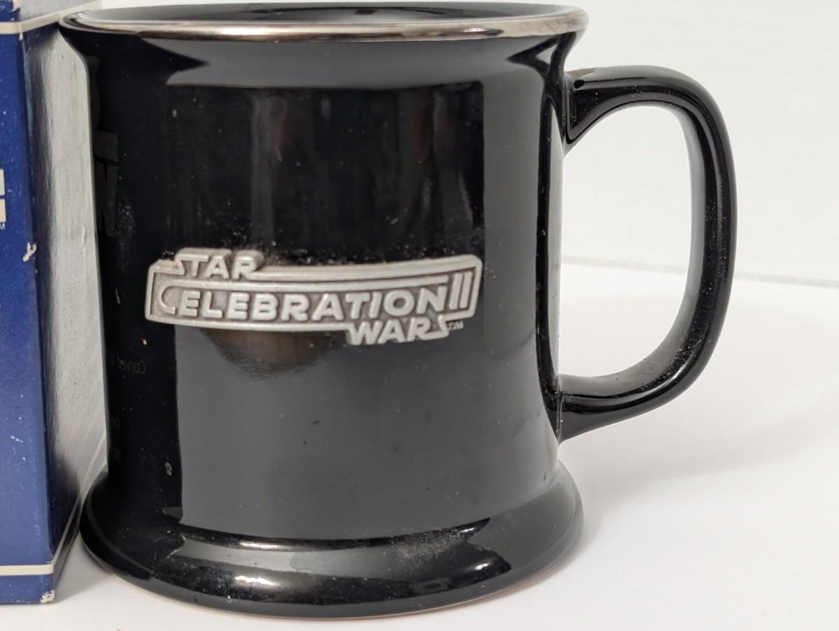 Vintage Star Wars Celebration II ceramic mug with pewter logo by Rawcliffe. Features platinum trim and 12 oz capacity. Comes in its original box marked Star Wars Ceramic Mug with pewter logo. A must-have collectible for Star Wars Celebration memorabilia enthusiasts. Not for microwave use.