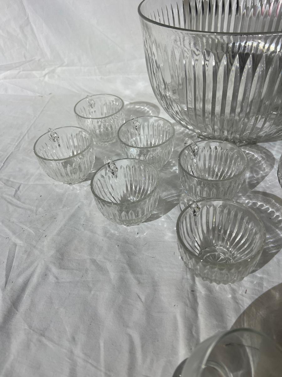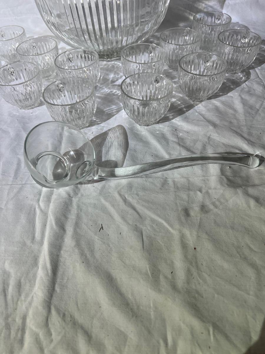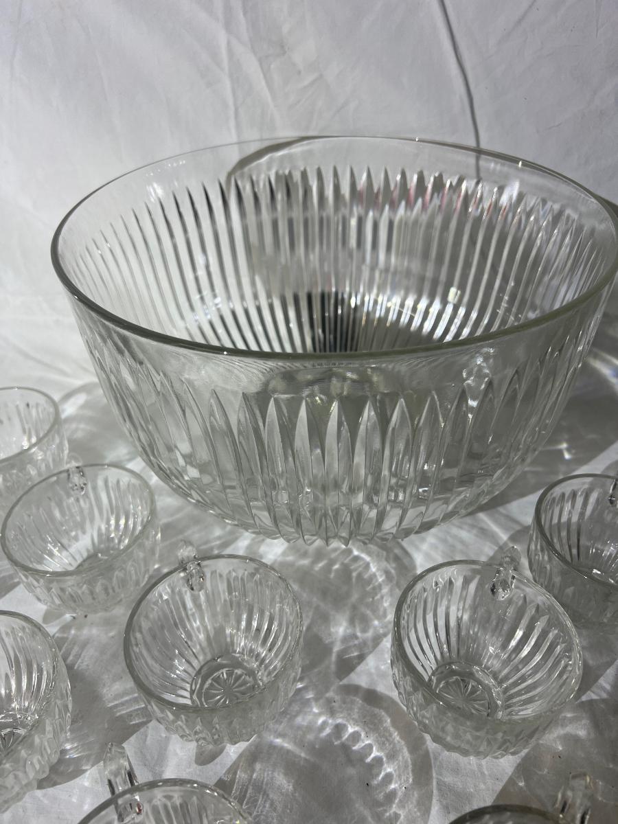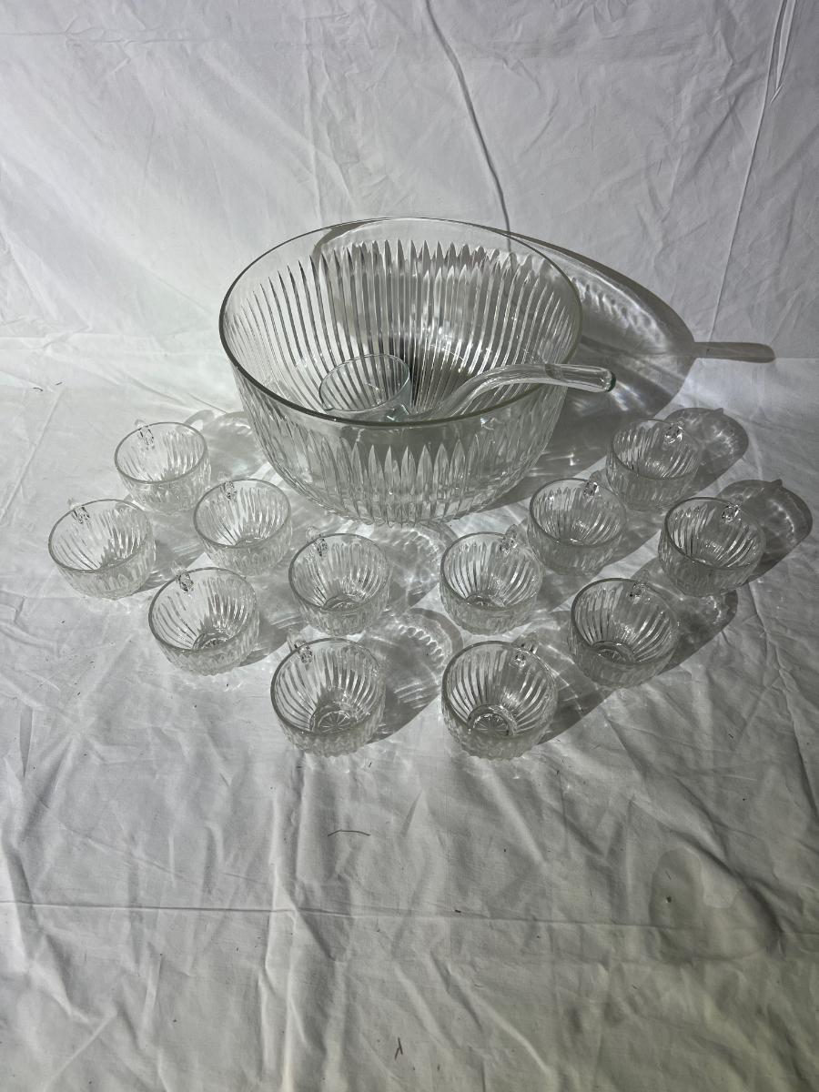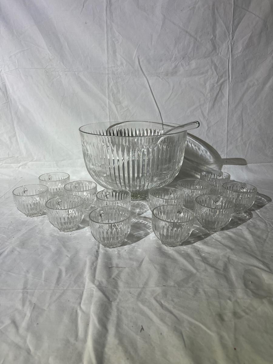 Vintage Starlight Glass Punch Bowl Set with glass ladle and 12 cups