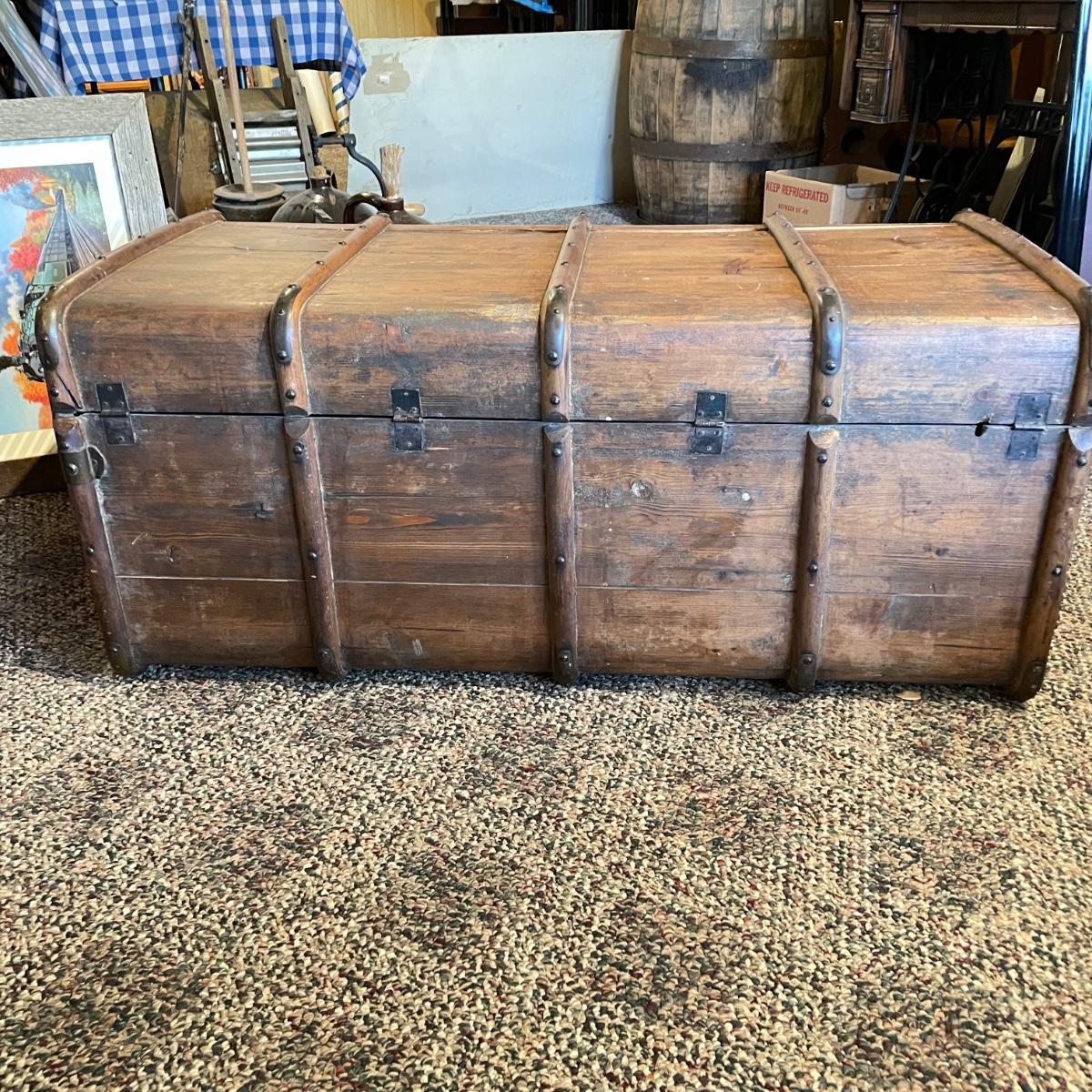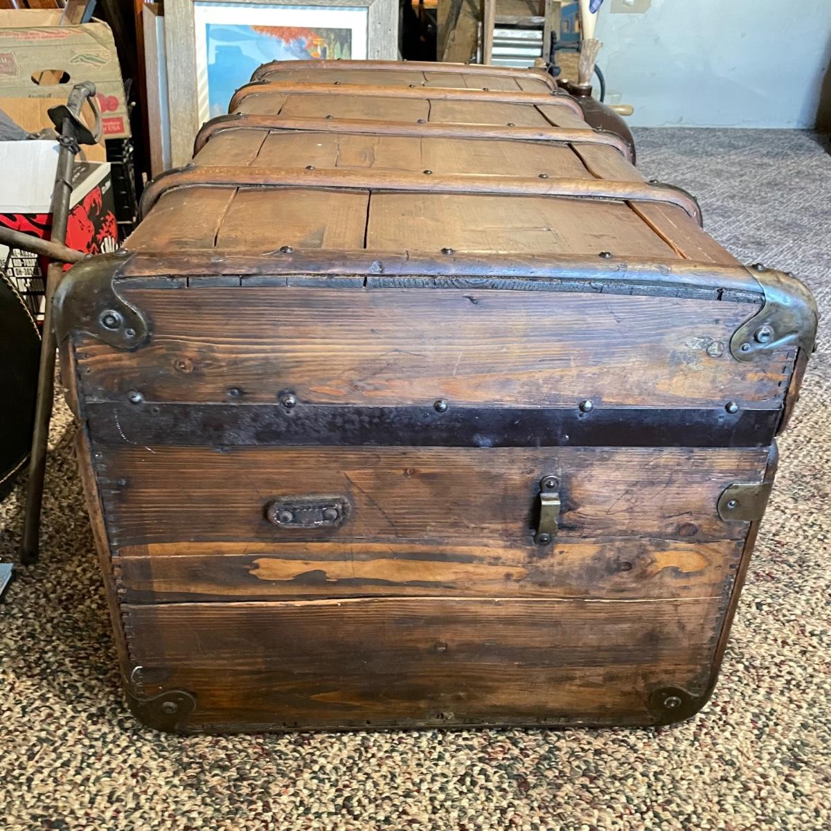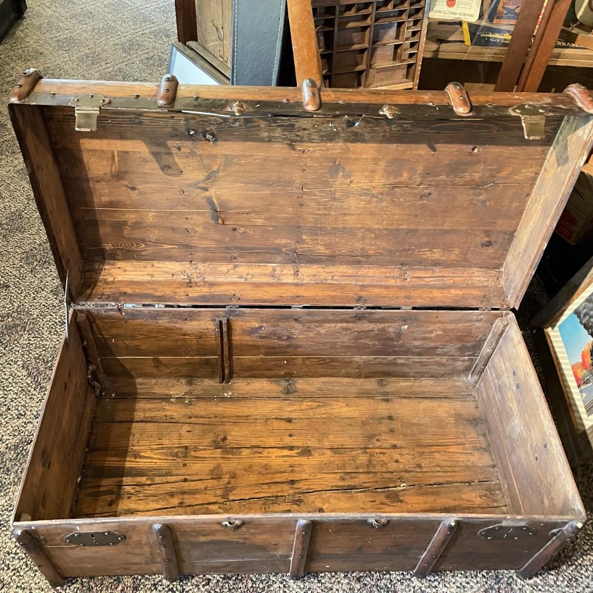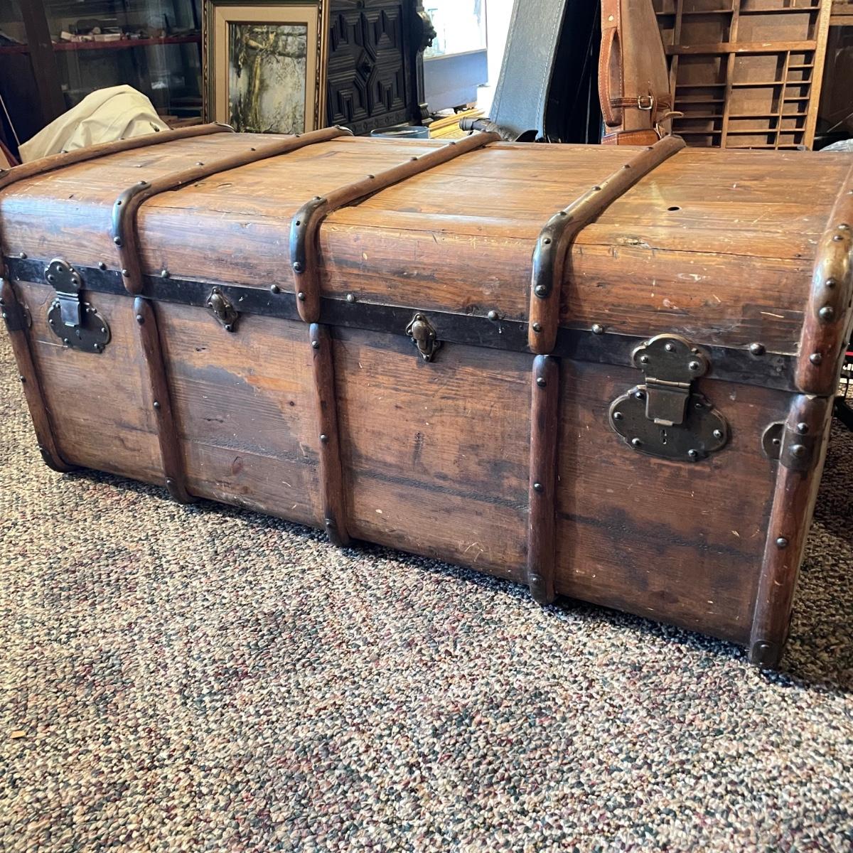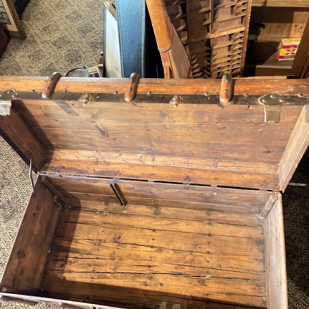 Solid wood steamer trunk with a flat lid and metal hardware and accents. Trunk measures approximately 43” x 22” x 19” and it’s fairly light weight for its size. It has a few blemishes and missing leather handles, but it’s in amazing shape for its age. See images. Local pick up only.