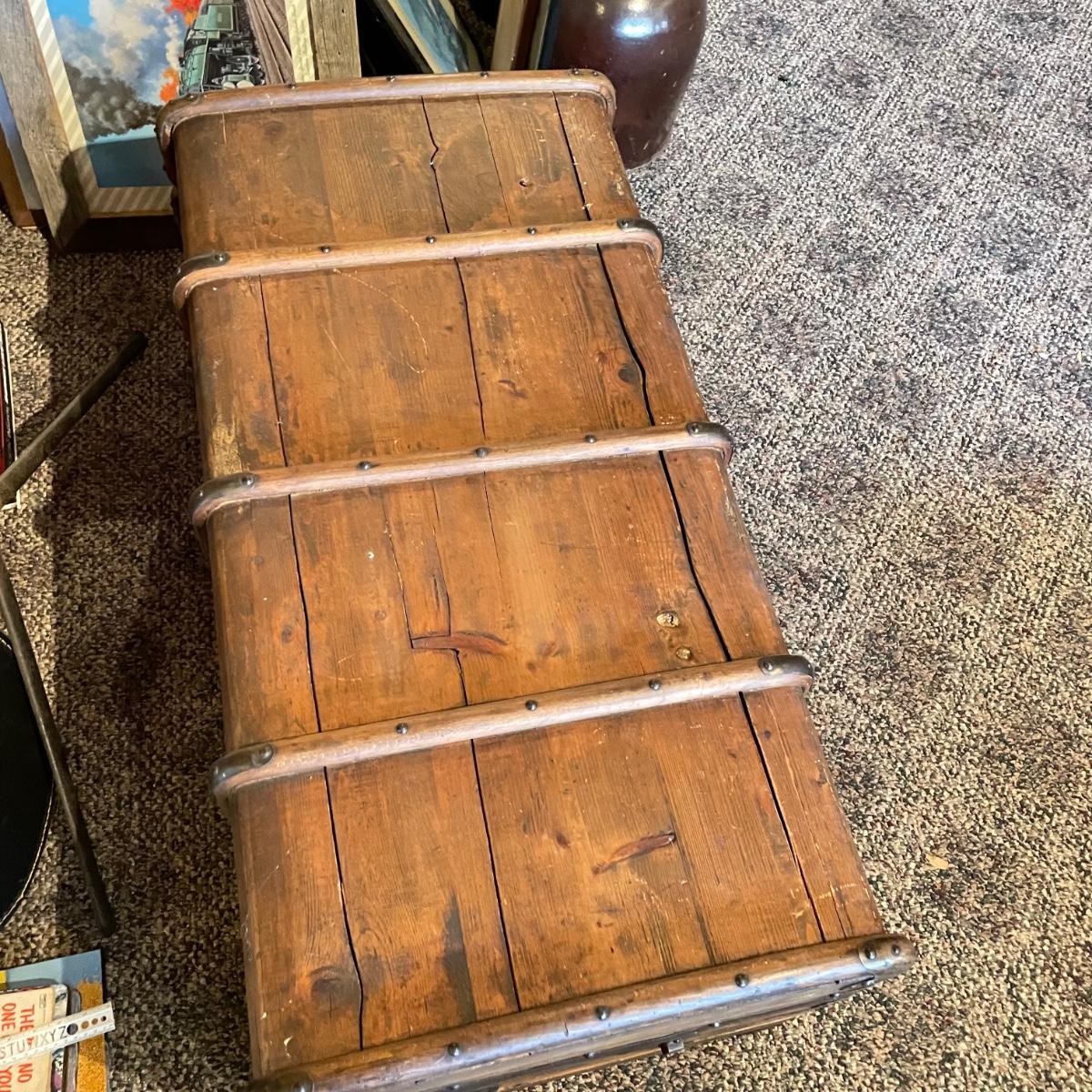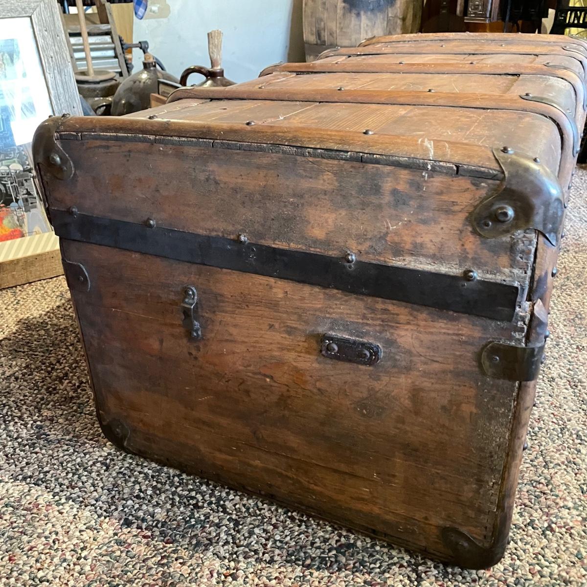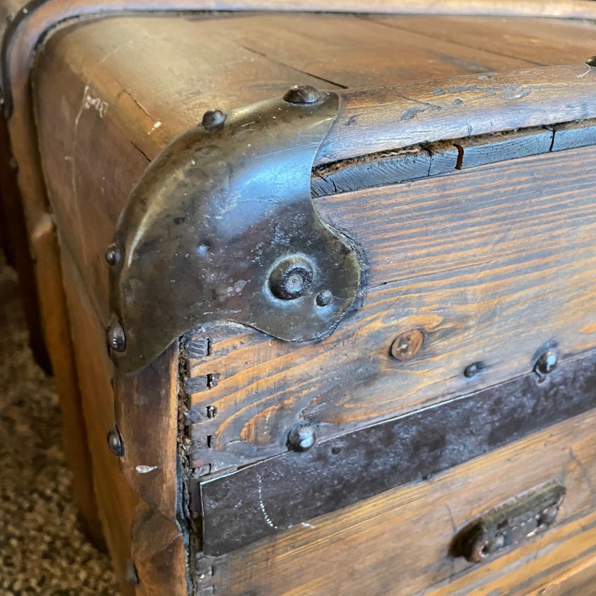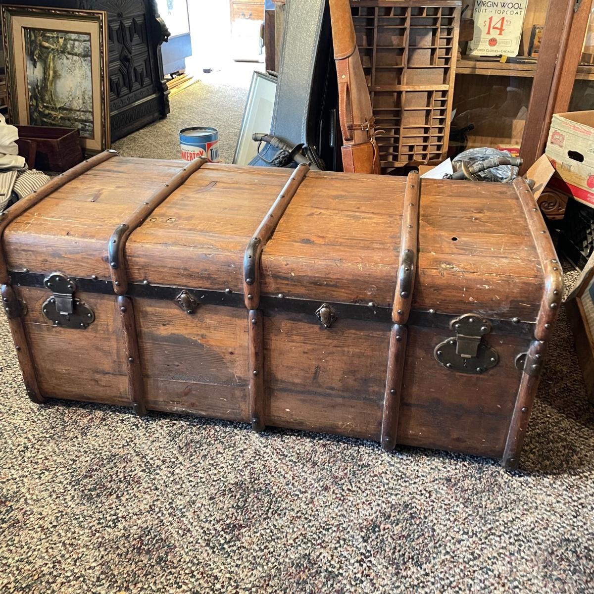 Solid wood steamer trunk with a flat lid and metal hardware and accents. Trunk measures approximately 43” x 22” x 19” and it’s fairly light weight for its size. It has a few blemishes and missing leather handles, but it’s in amazing shape for its age. See images. Local pick up only.
