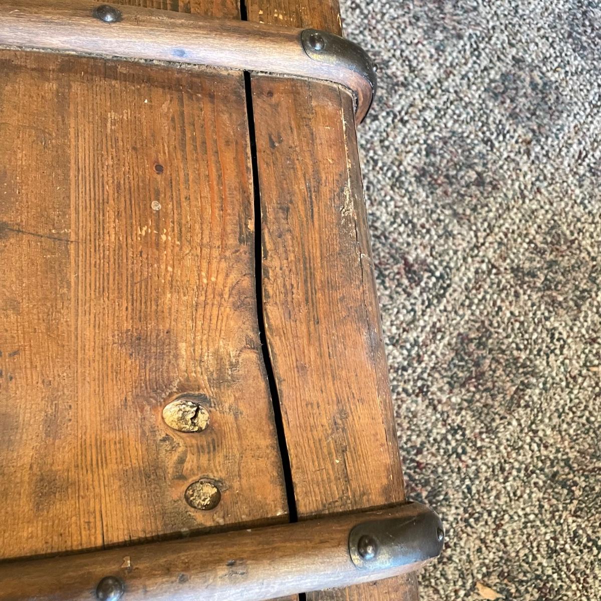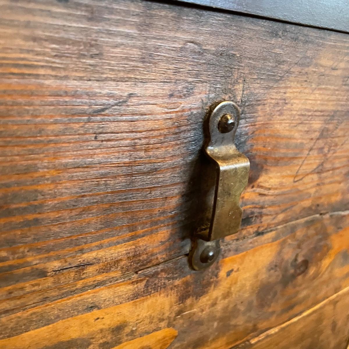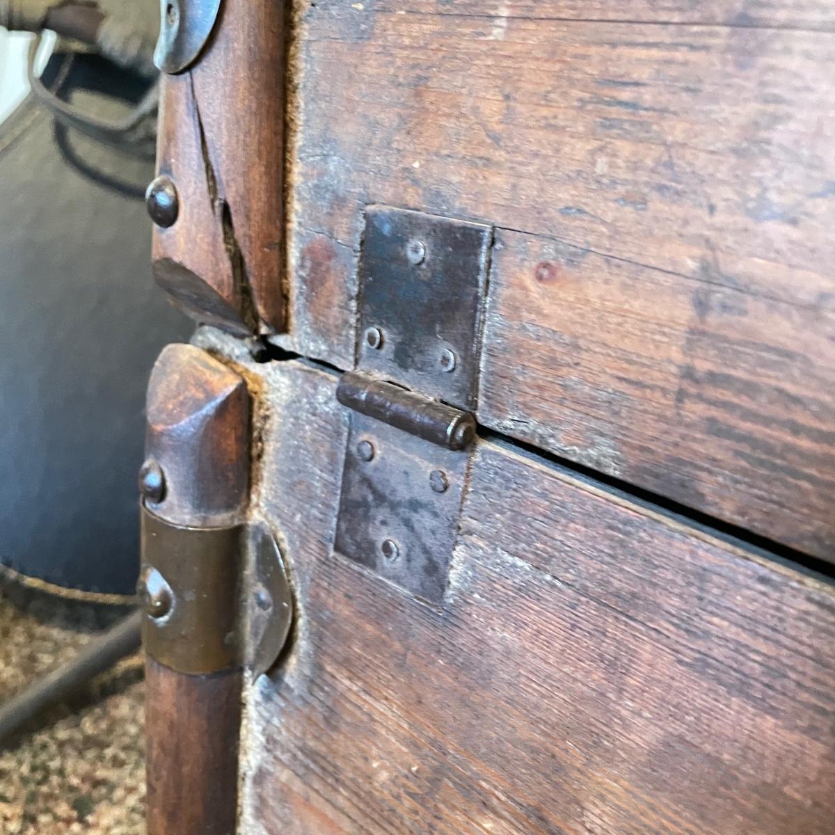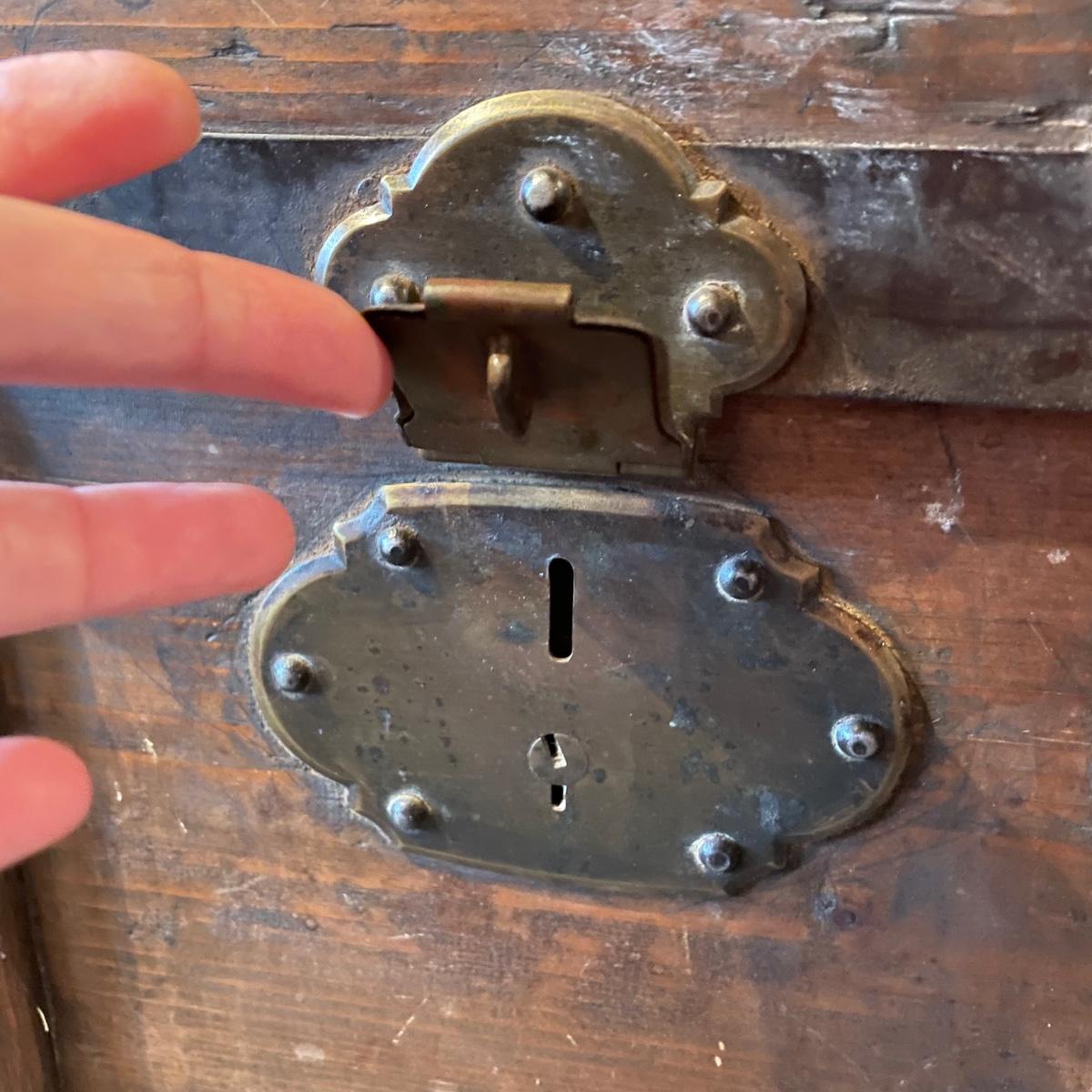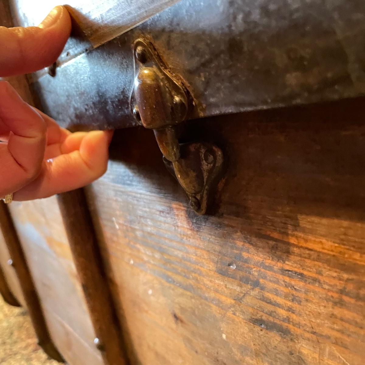 Solid wood steamer trunk with a flat lid and metal hardware and accents. Trunk measures approximately 43” x 22” x 19” and it’s fairly light weight for its size. It has a few blemishes and missing leather handles, but it’s in amazing shape for its age. See images. Local pick up only.