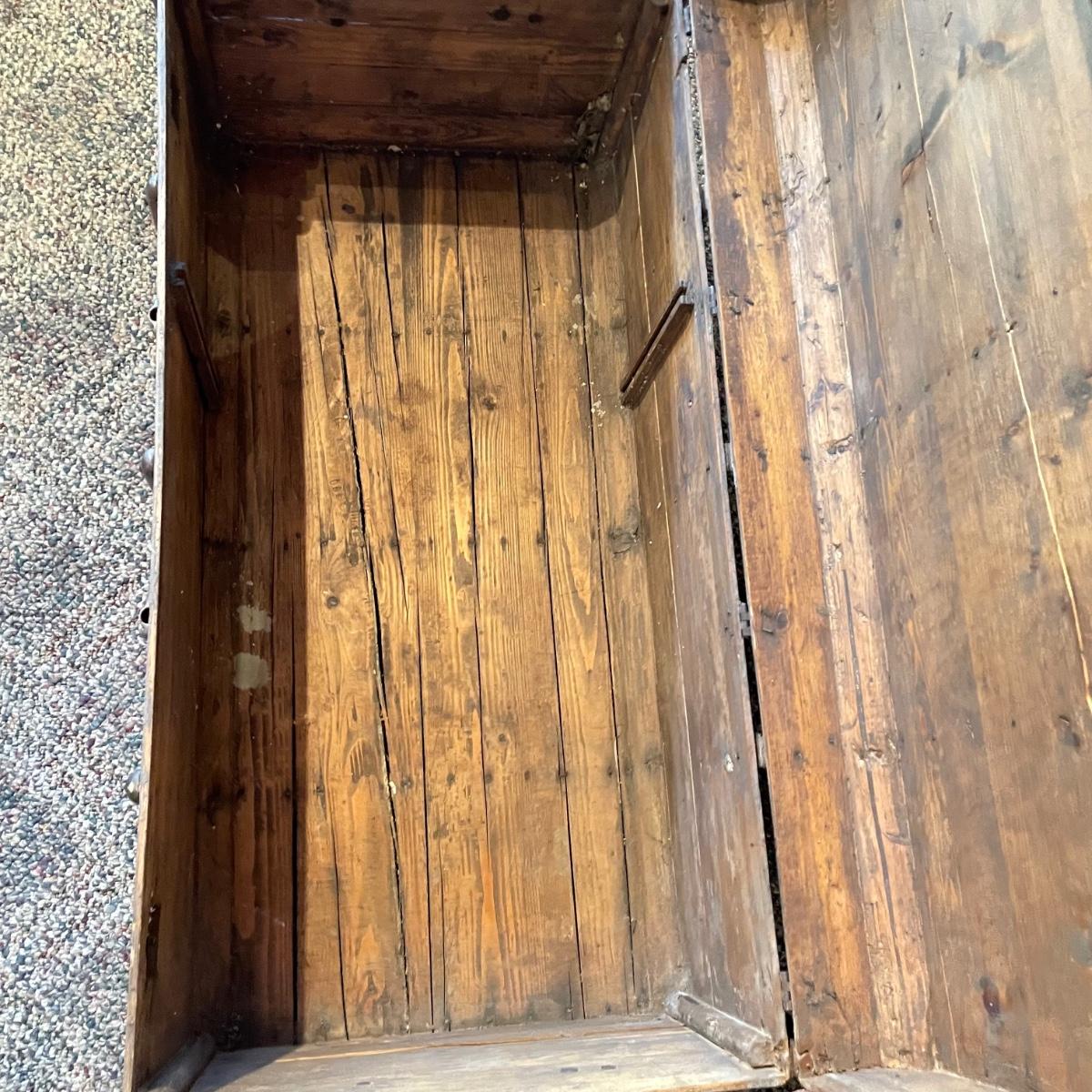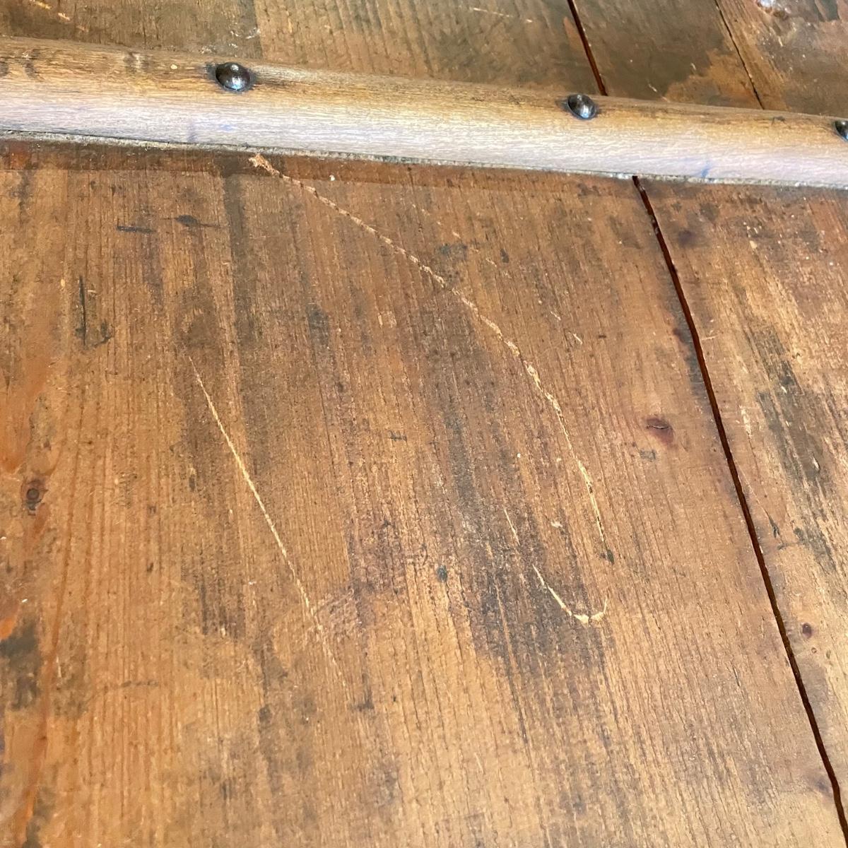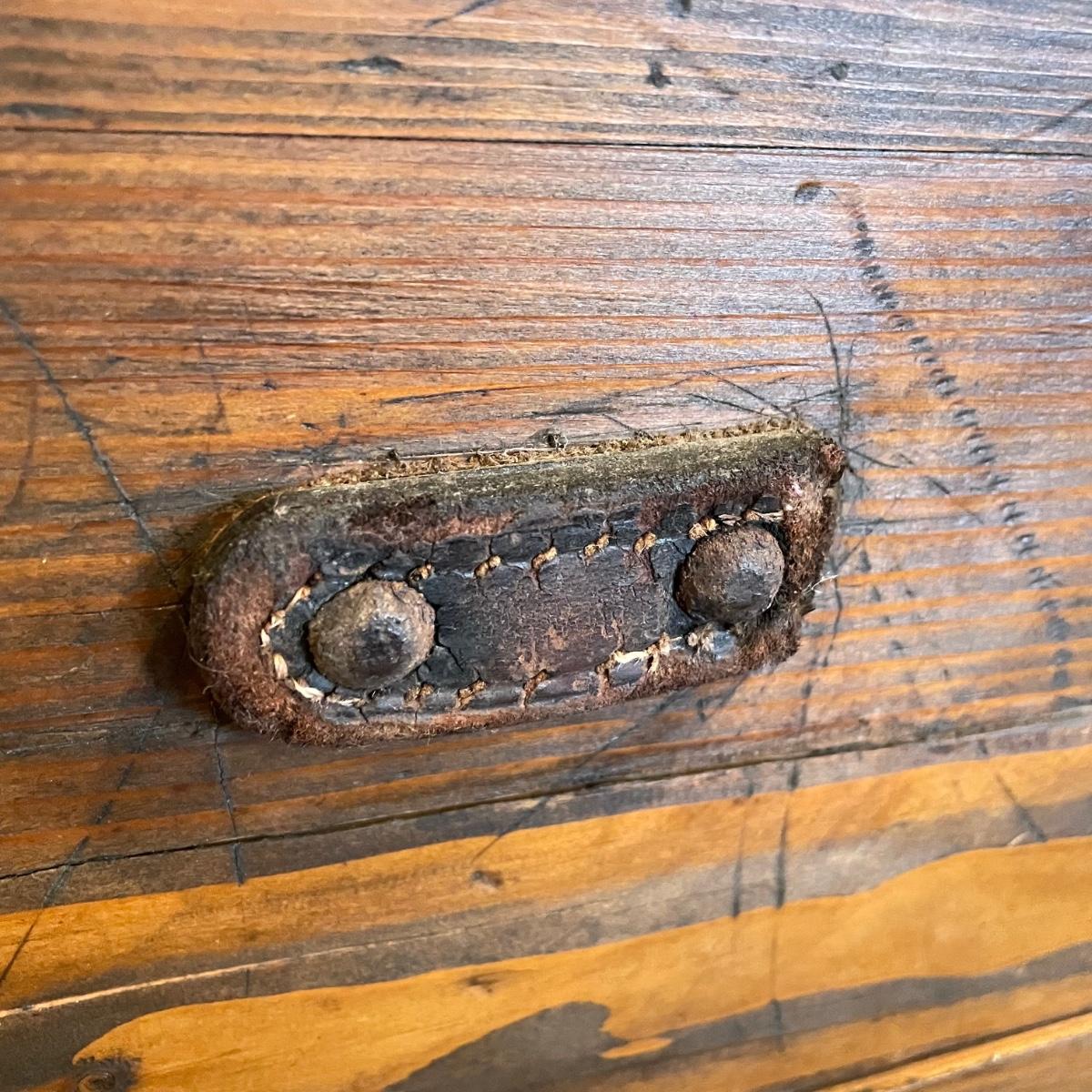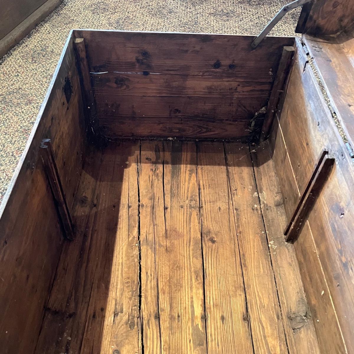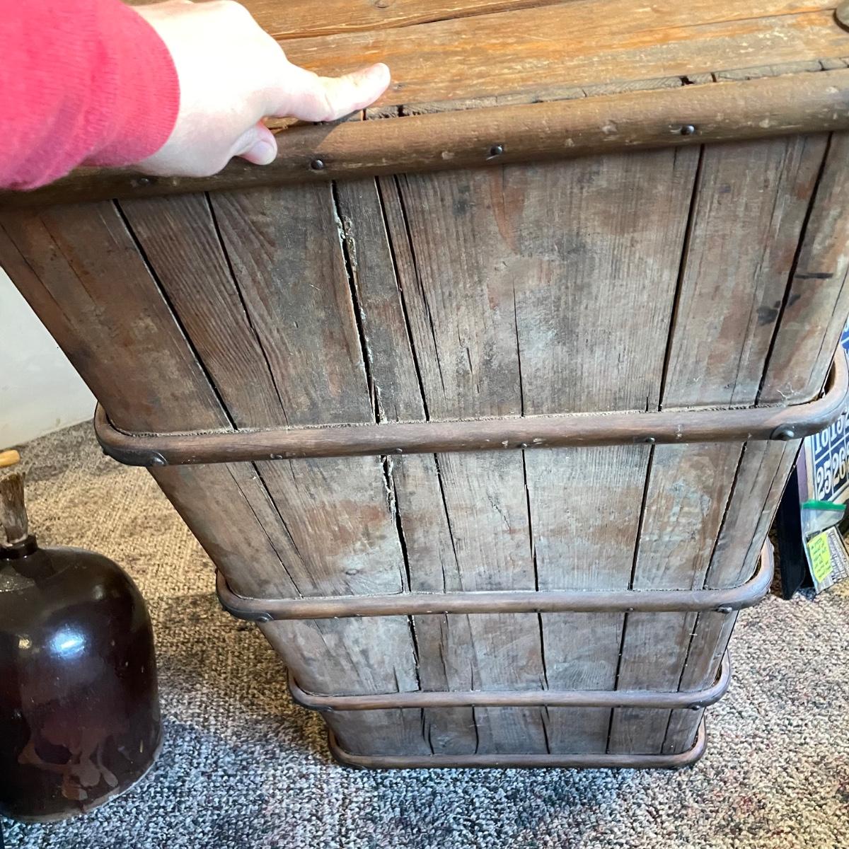 Solid wood steamer trunk with a flat lid and metal hardware and accents. Trunk measures approximately 43” x 22” x 19” and it’s fairly light weight for its size. It has a few blemishes and missing leather handles, but it’s in amazing shape for its age. See images. Local pick up only.