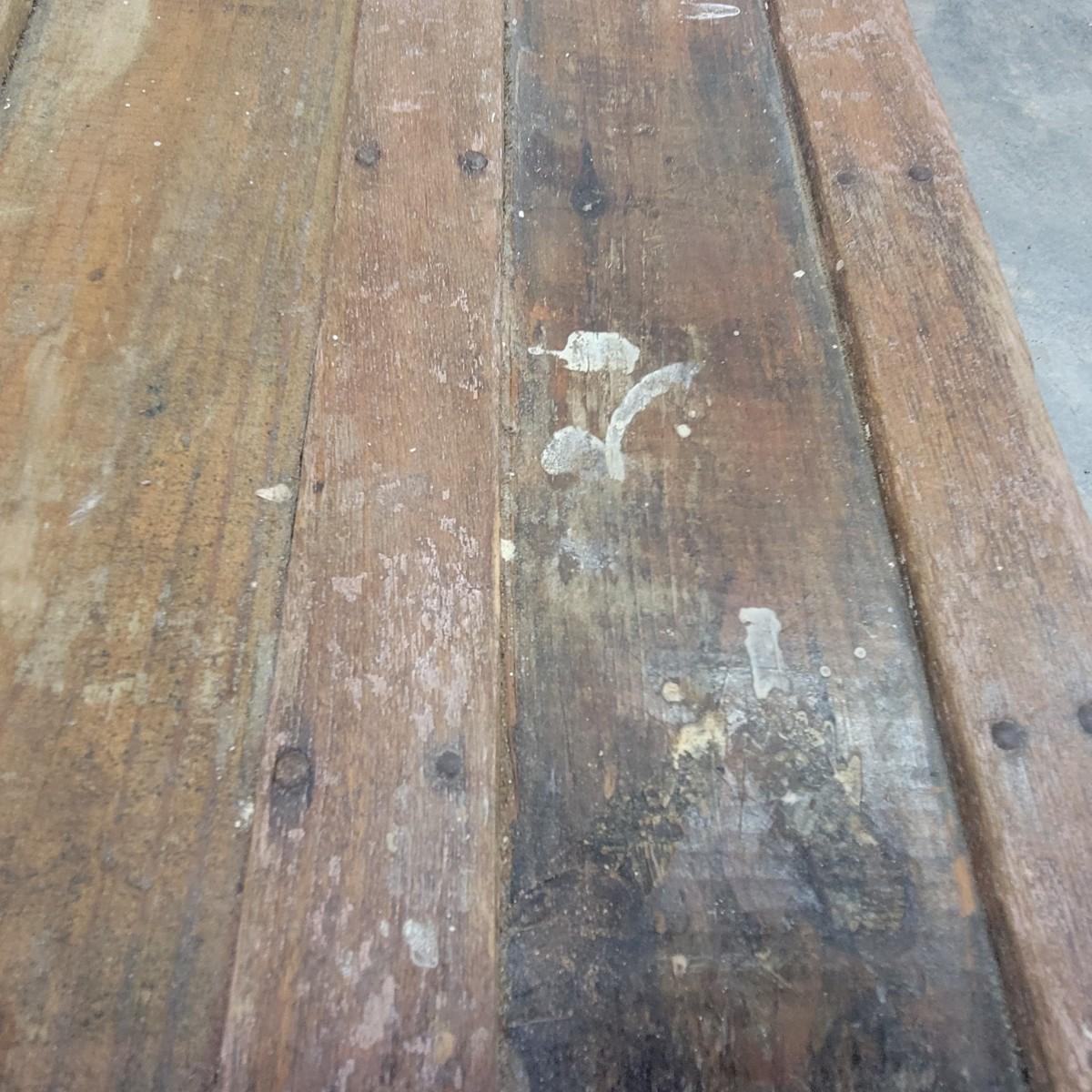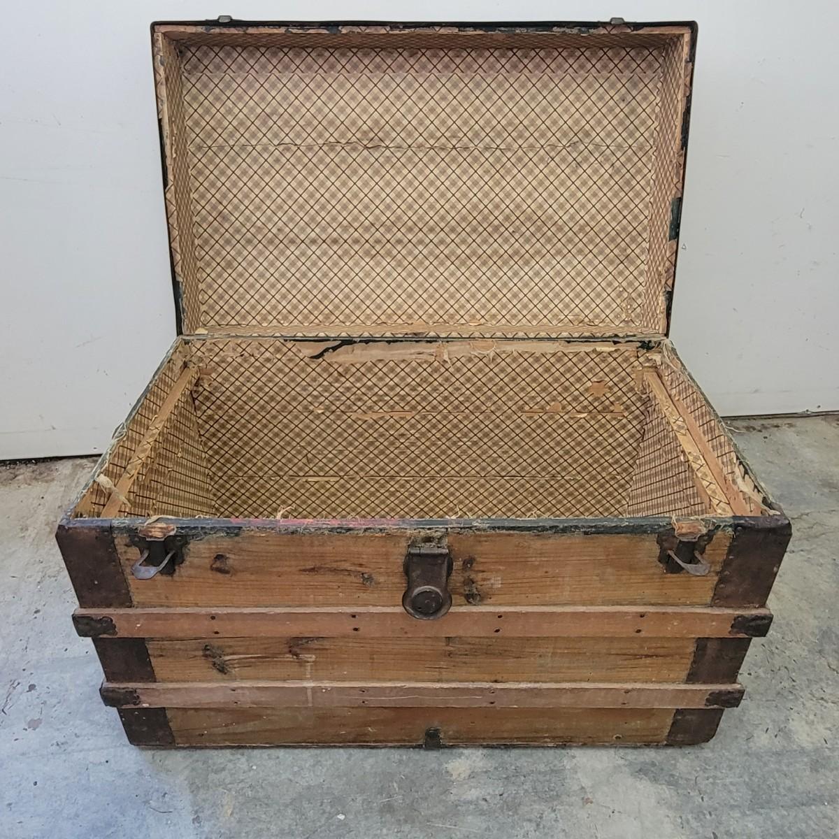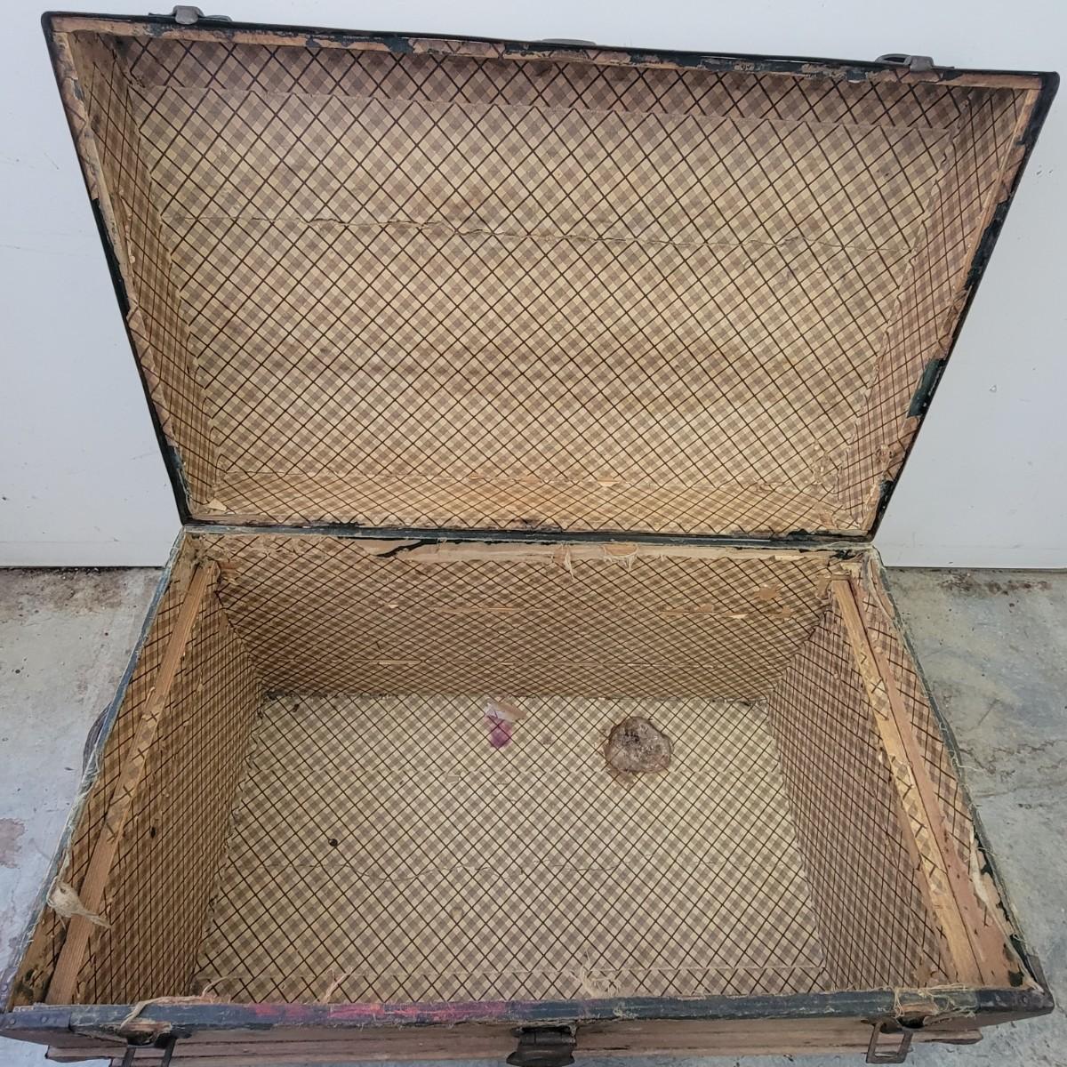 Vintage wooden steamer trunk with decorative, steel reinforcements and leather straps. Clasps still work and the lock closes, but is not functional. The interior's paper liner is peeling and has some stains.