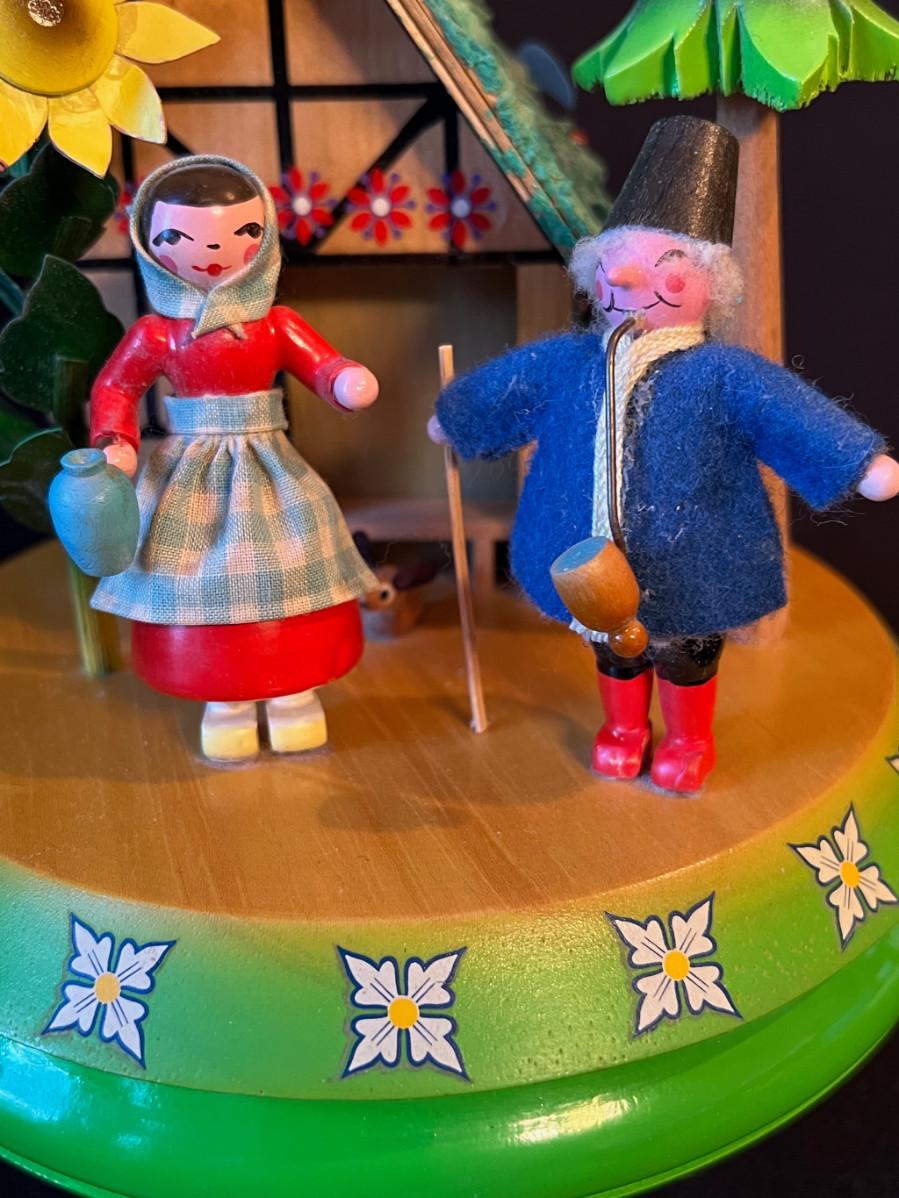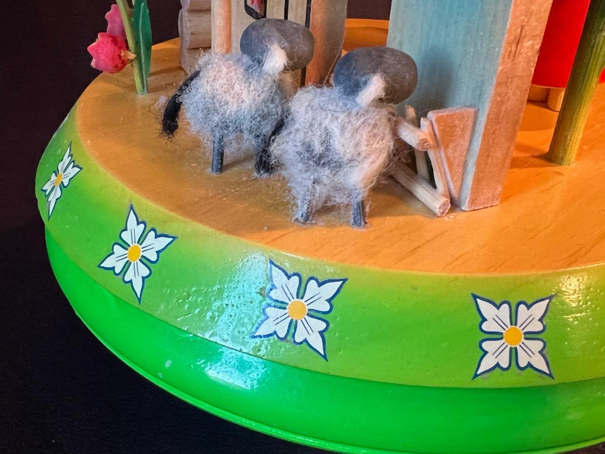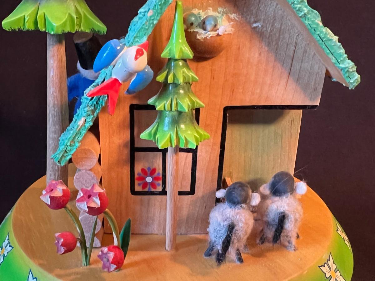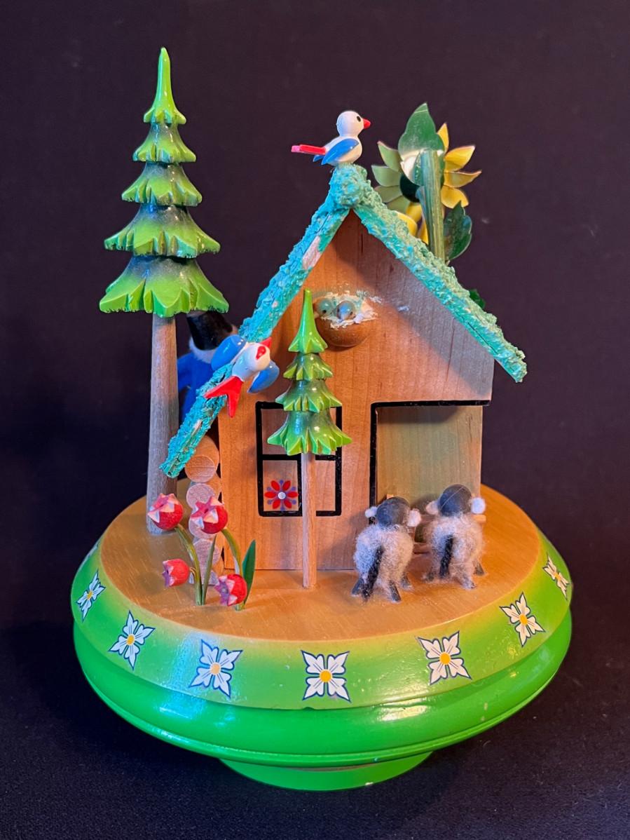This is a vintage 1950s Steinbach Wooden figurine music box. Charming Vintage Wooden Chalet - sheep at the stall, birds, flowers. Made in Germany, possibly Erzgebirge with a Swiss Thorens Music Box - Works. 8" tall. Some paint loss on roof. (pictured) Underneath side has a split in the wood (pictured) but not noticeable when upright. One little wooden chick has flown the nest. :o( Plays Lara's Theme a bit slowly. Made in Western Zone Germany