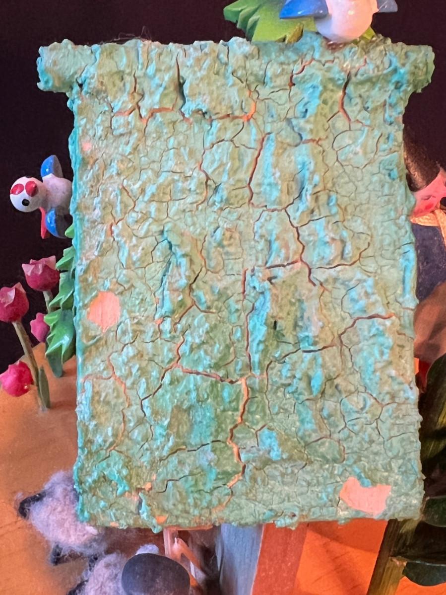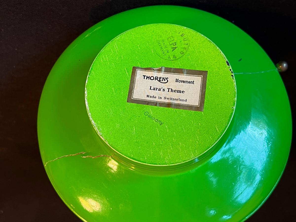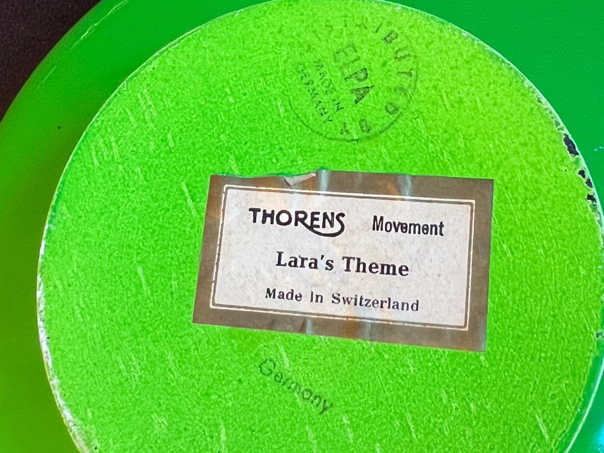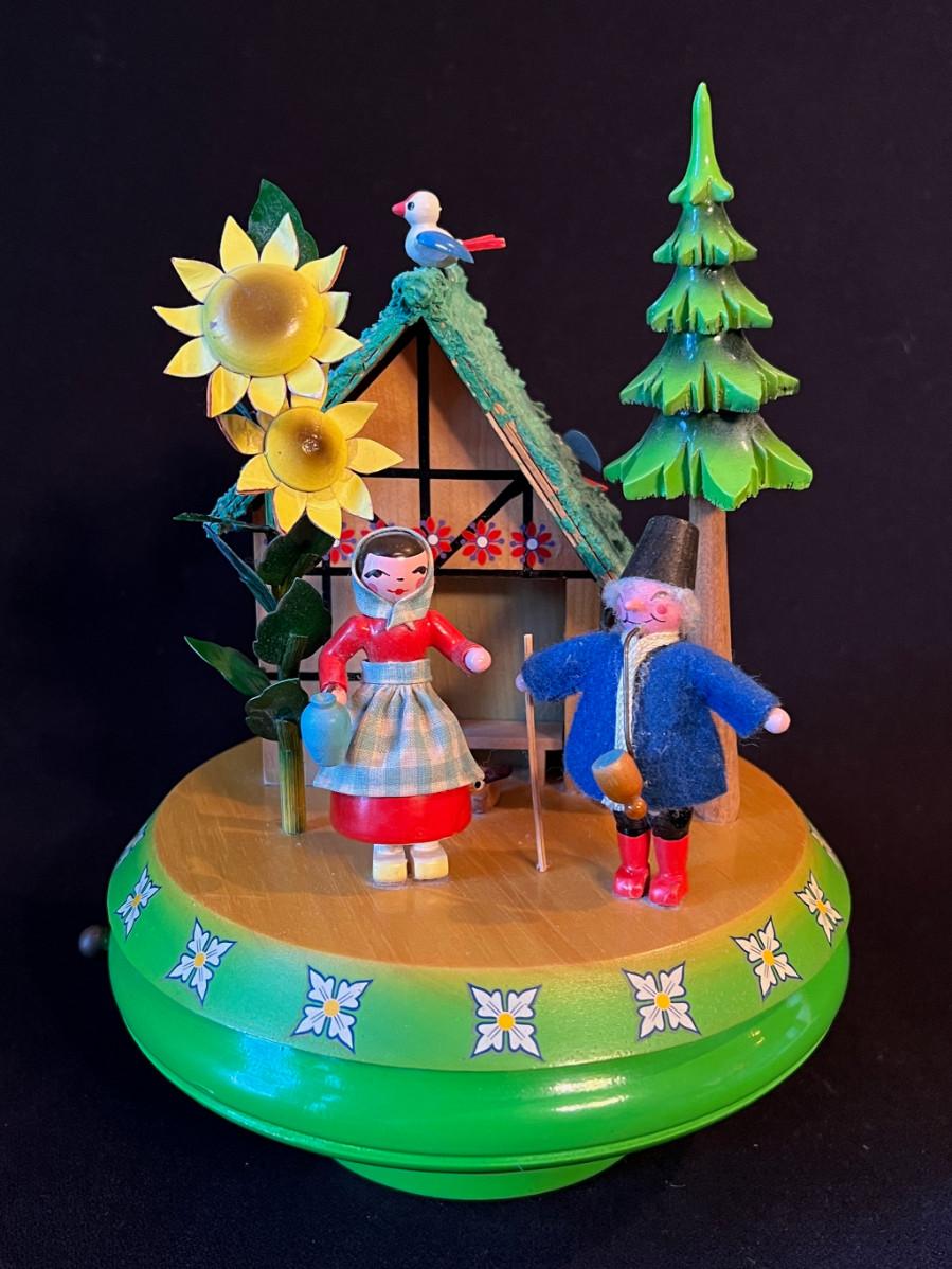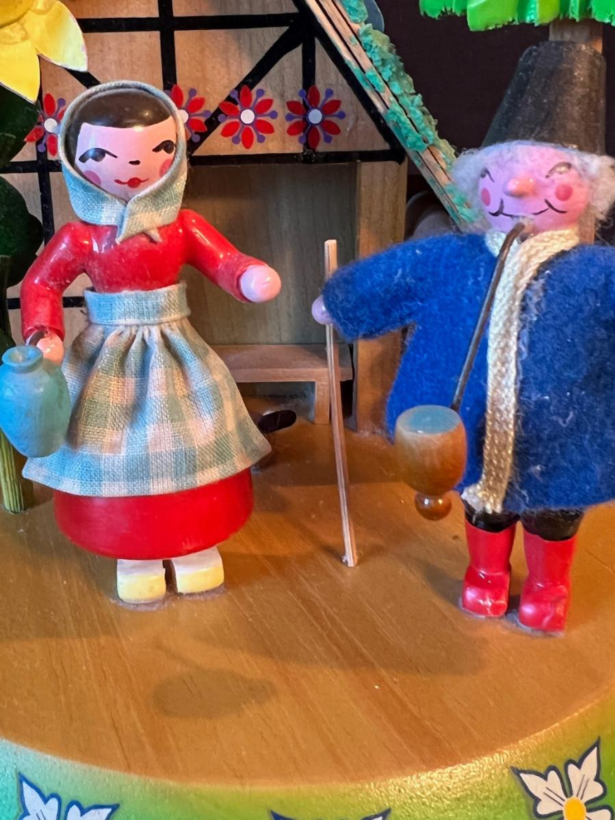 This is a vintage 1950s Steinbach Wooden figurine music box. Charming Vintage Wooden Chalet - sheep at the stall, birds, flowers. Made in Germany, possibly Erzgebirge with a Swiss Thorens Music Box - Works. 8" tall. Some paint loss on roof. (pictured) Underneath side has a split in the wood (pictured) but not noticeable when upright. One little wooden chick has flown the nest. :o( Plays Lara's Theme a bit slowly. Made in Western Zone Germany
