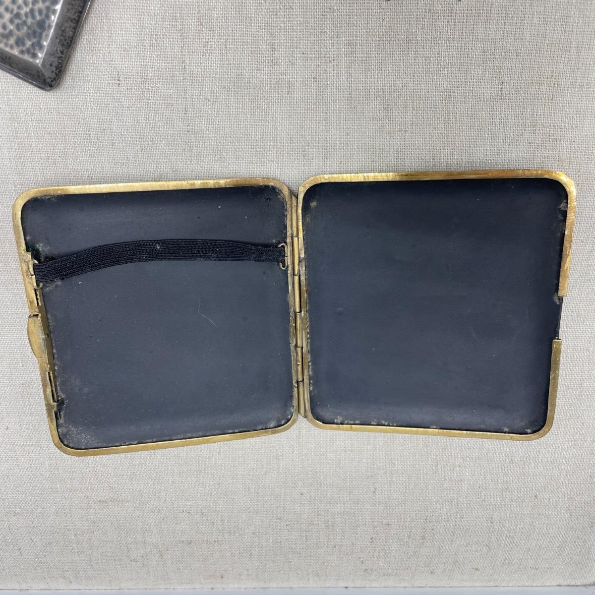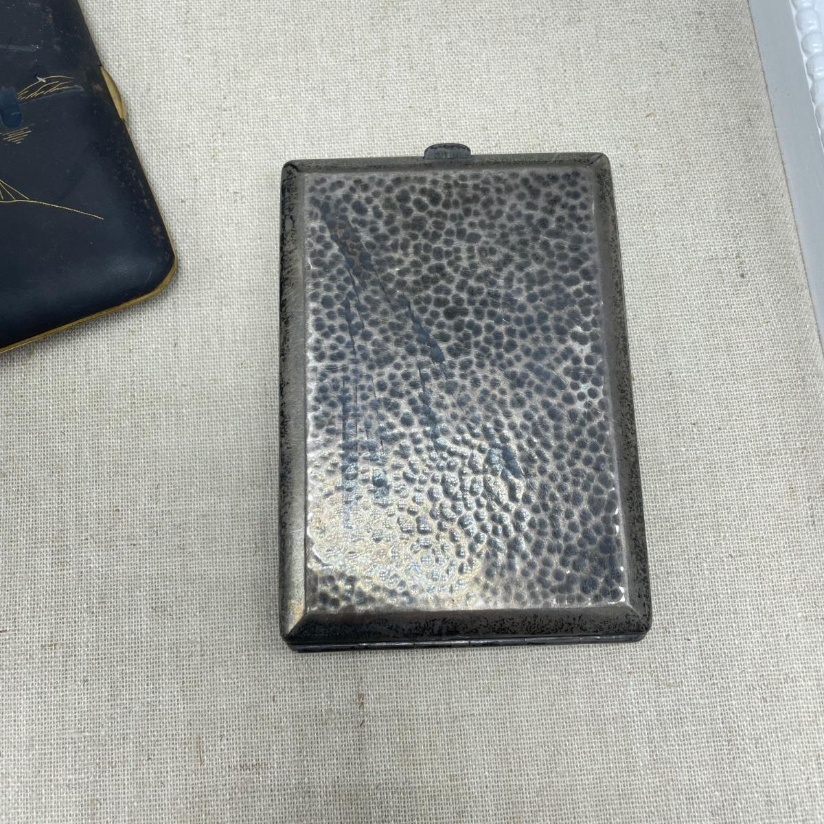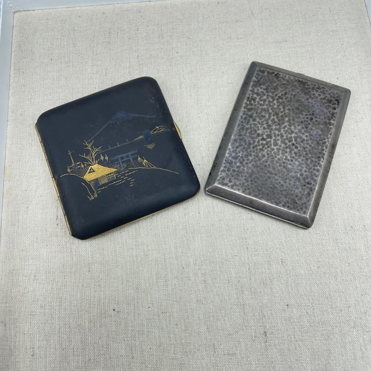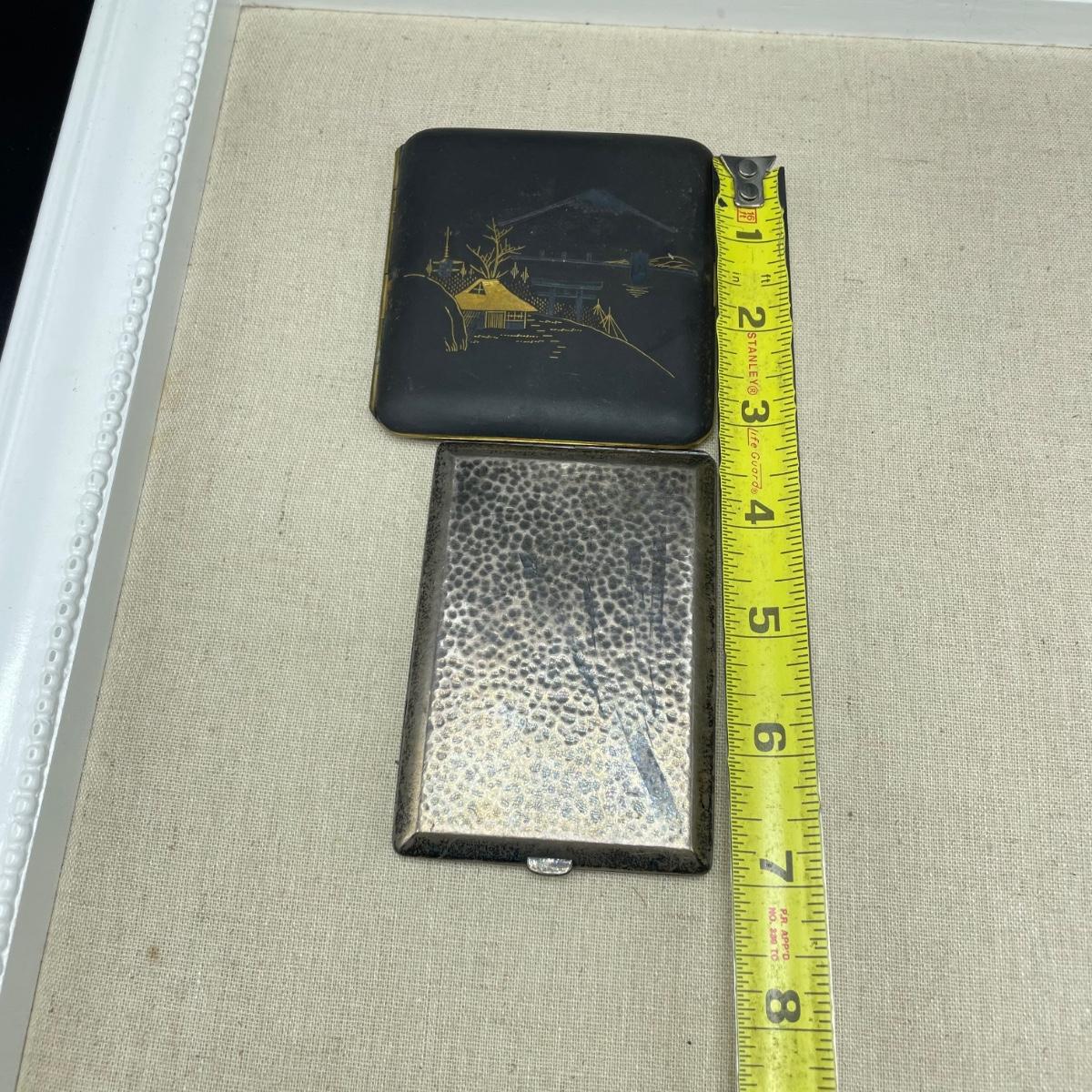 Two cases, possibly for business cards and cigarettes. The hammered silver case is marked Sterling 950. The other has what appears to be textured gold leaf designs and a stamp on the back. See images. Shipping available.