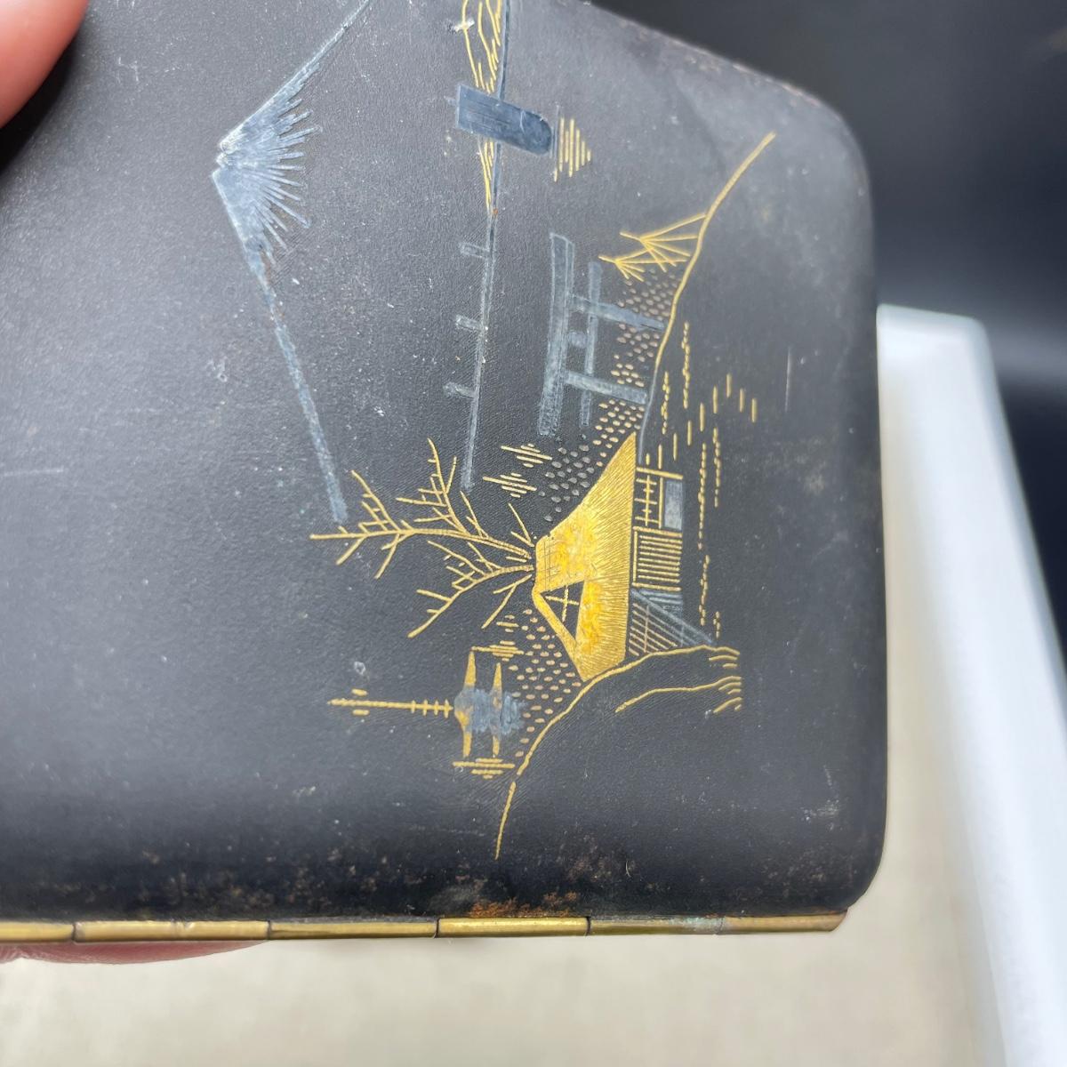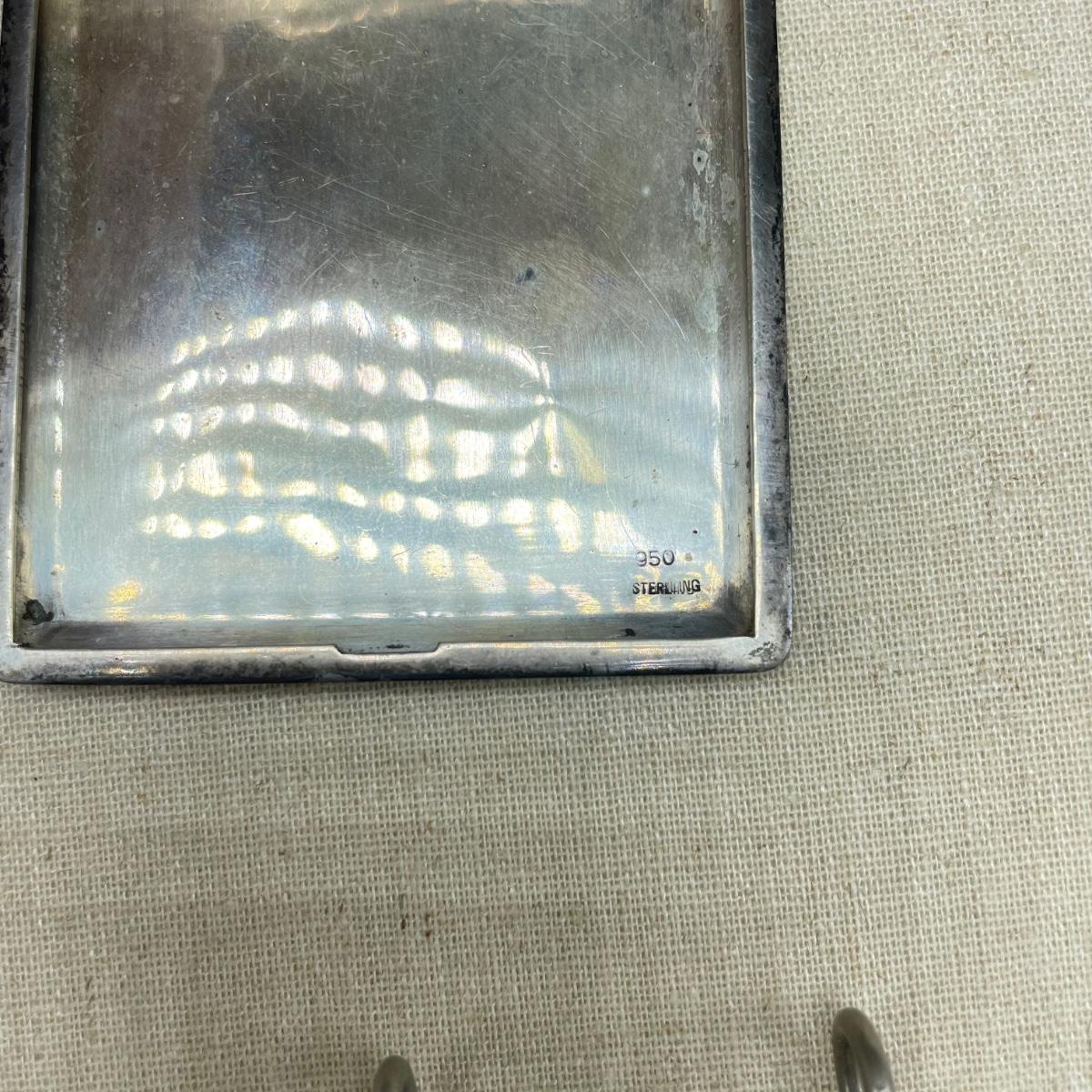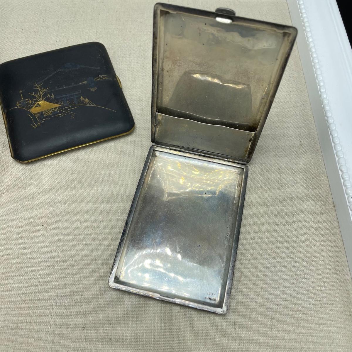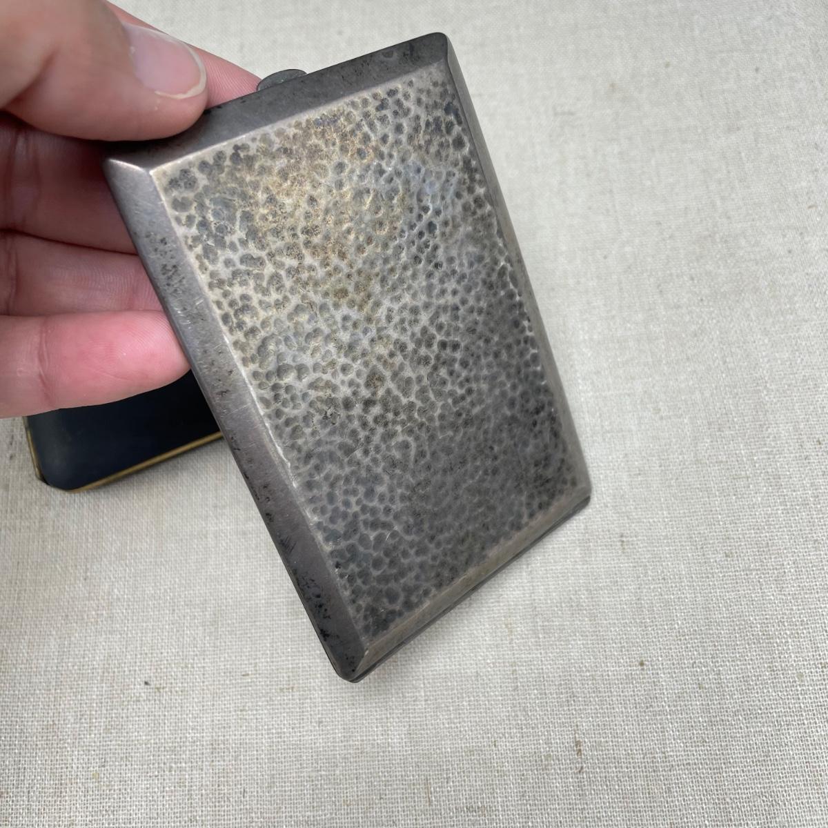 Two cases, possibly for business cards and cigarettes. The hammered silver case is marked Sterling 950. The other has what appears to be textured gold leaf designs and a stamp on the back. See images. Shipping available.
