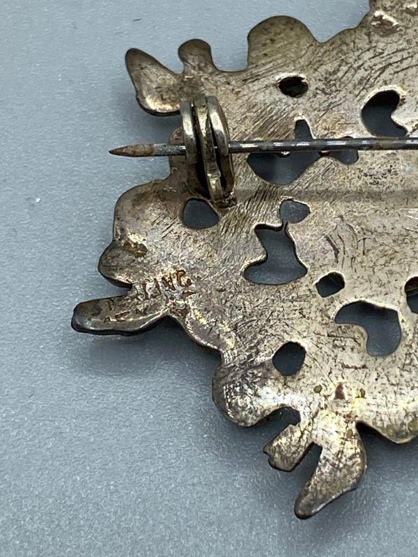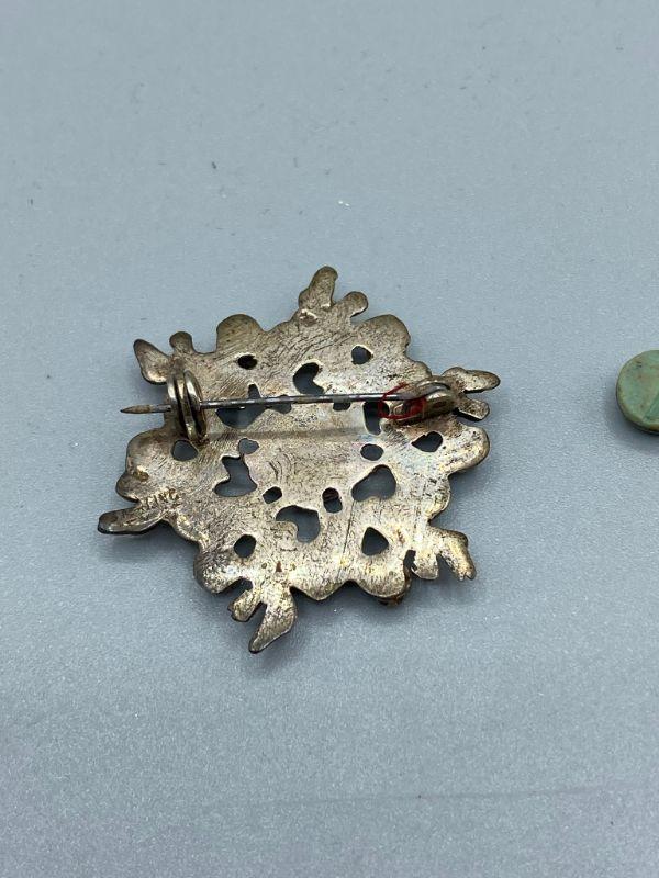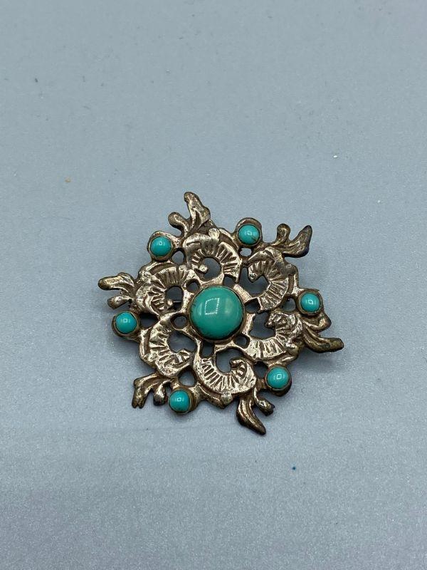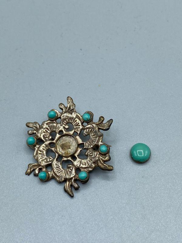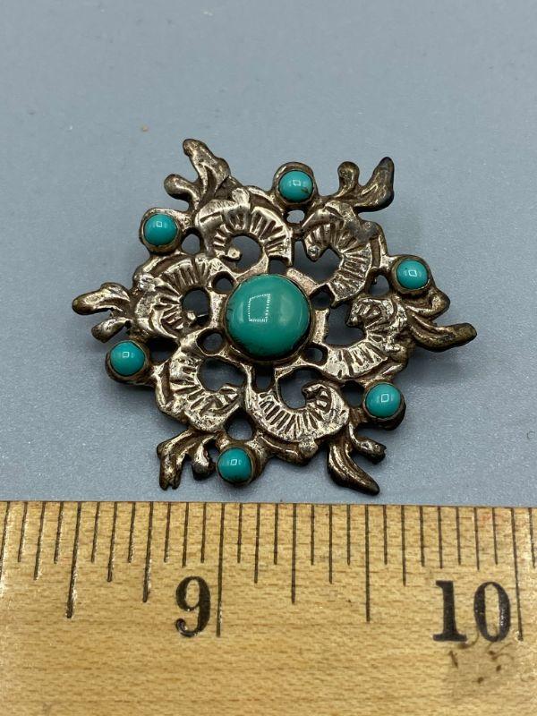 Vintage sterling and turquoise mandala brooch. Turquoise cabochons, the center one needs to be glued back in place. Stamped on the back. About 1.5" size.