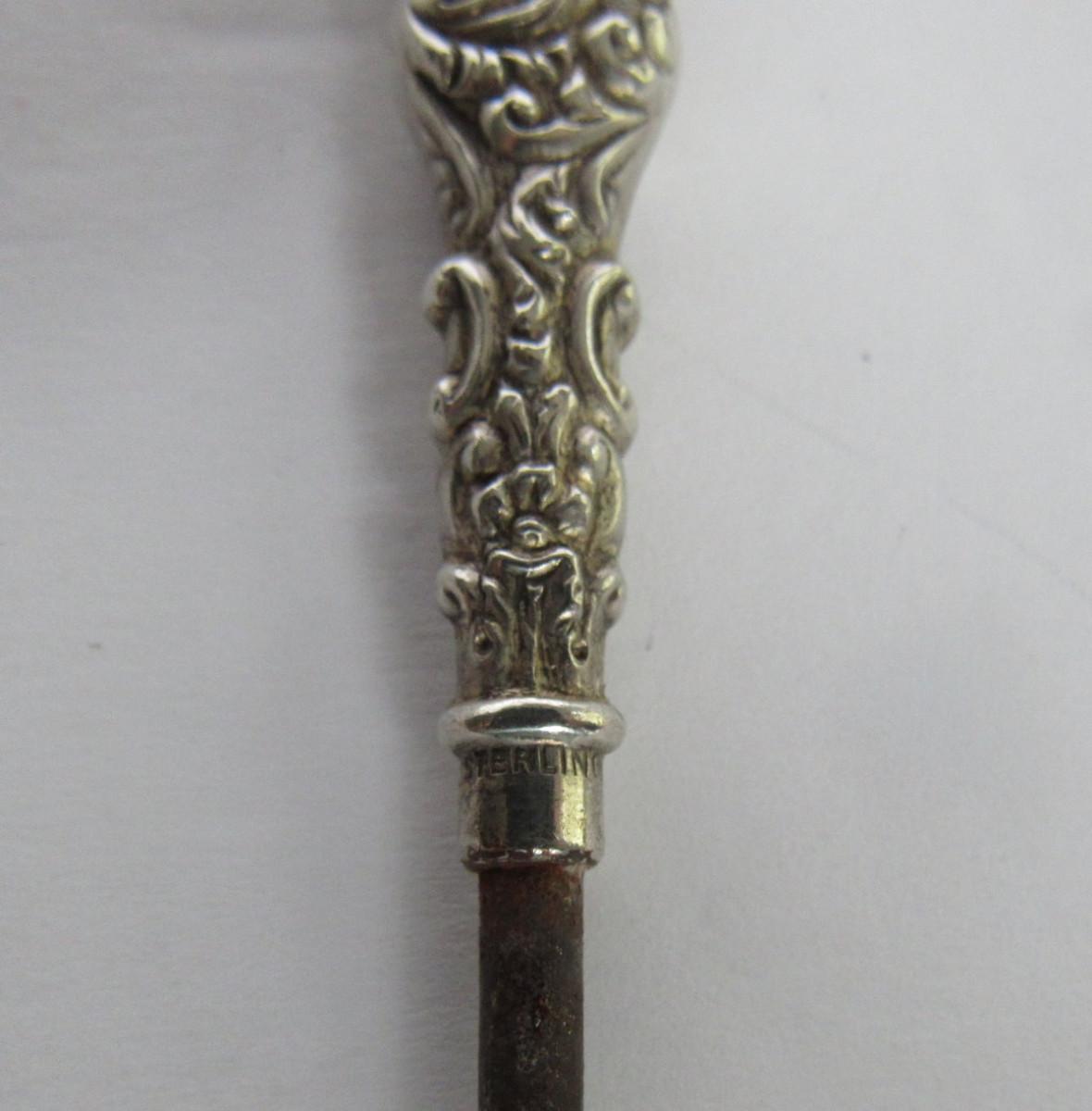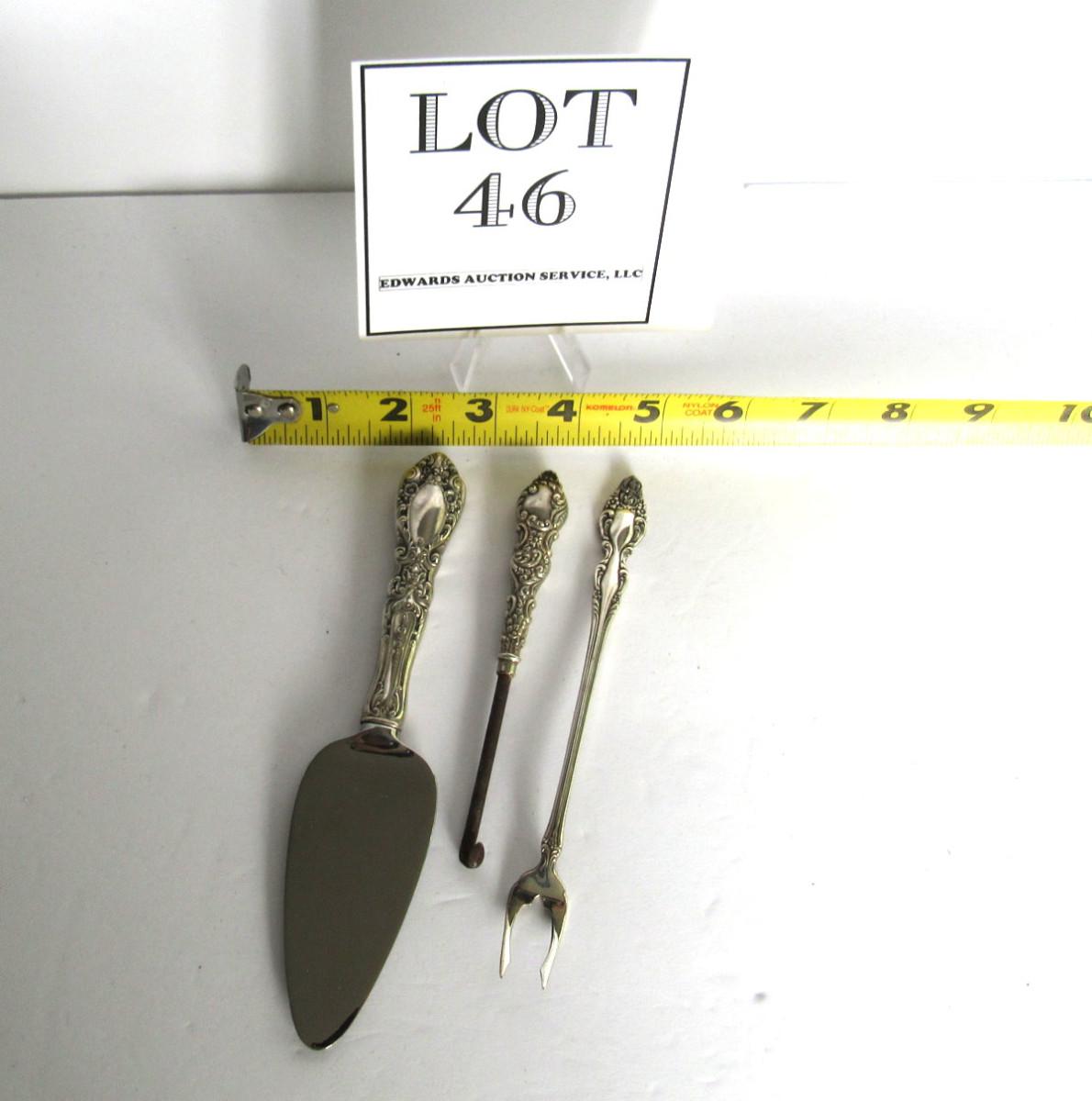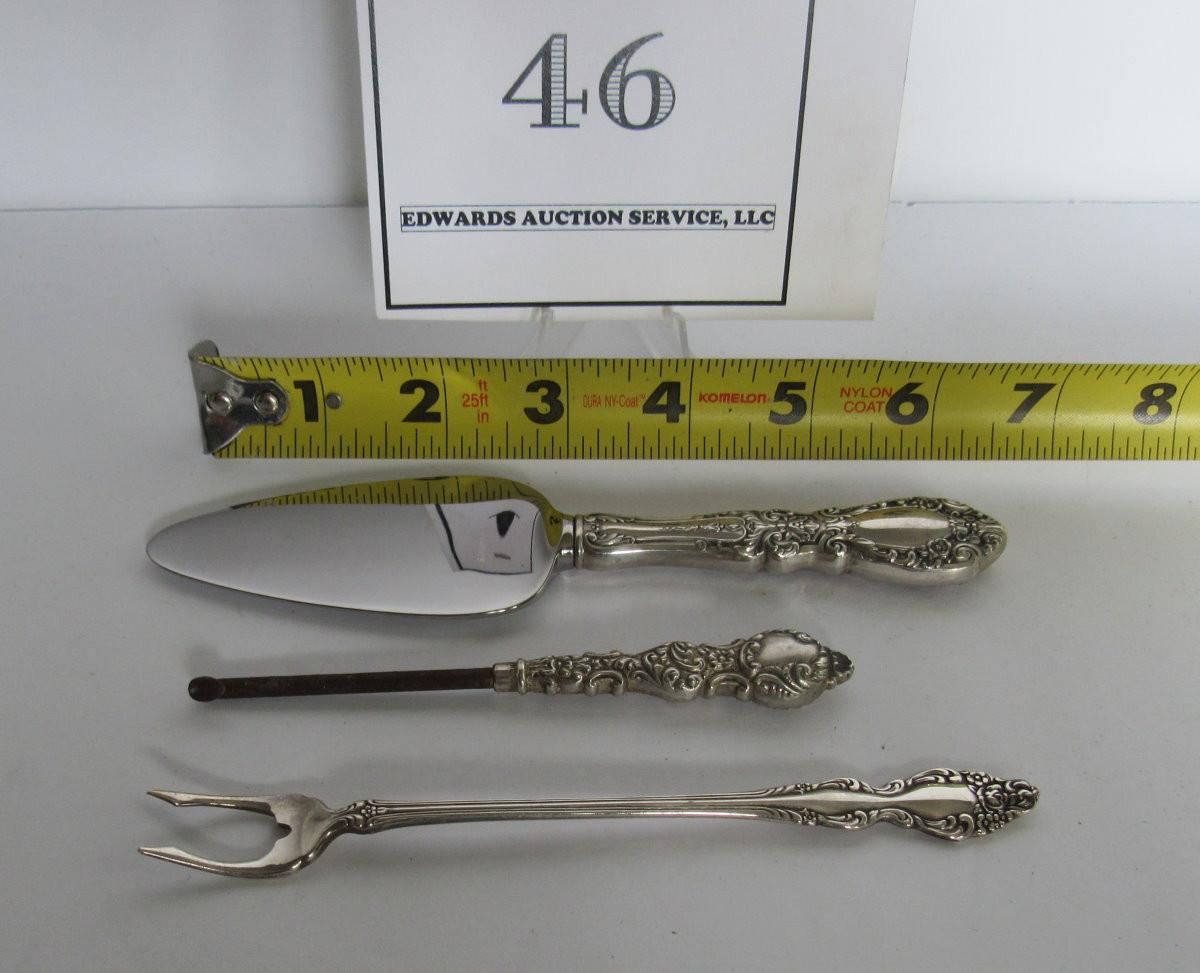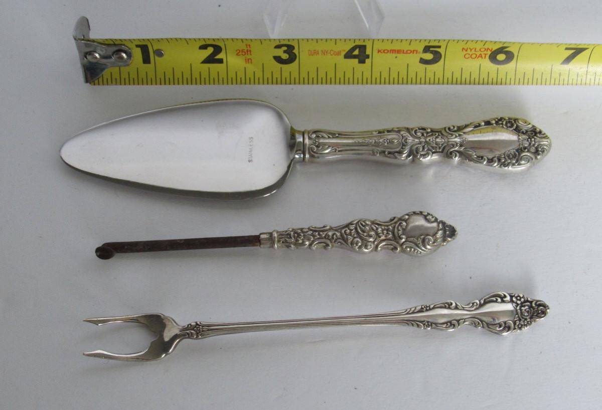 Vintage Sterling Handled Button Hook, Small Pie Server, and Plated Olive Fork