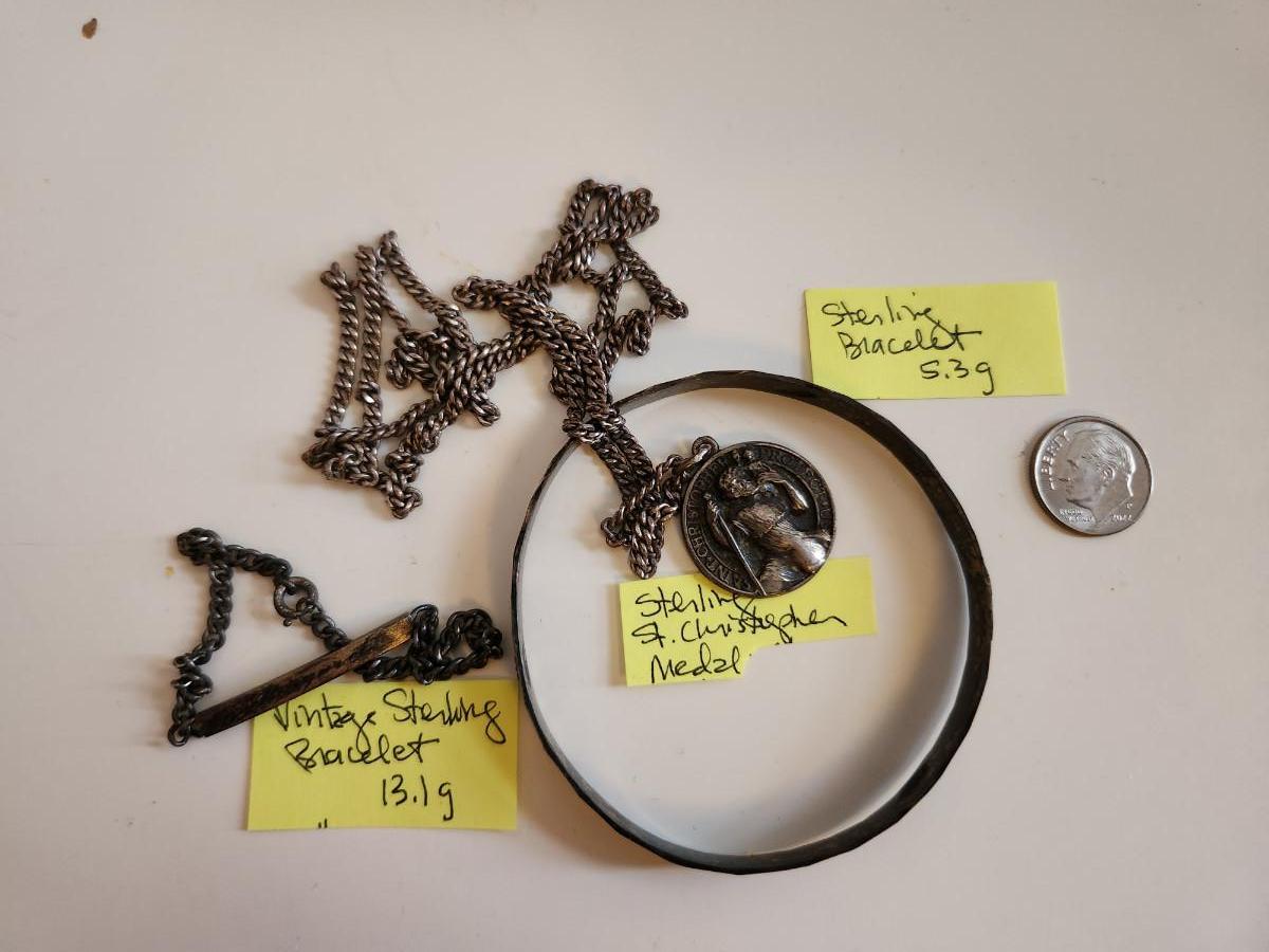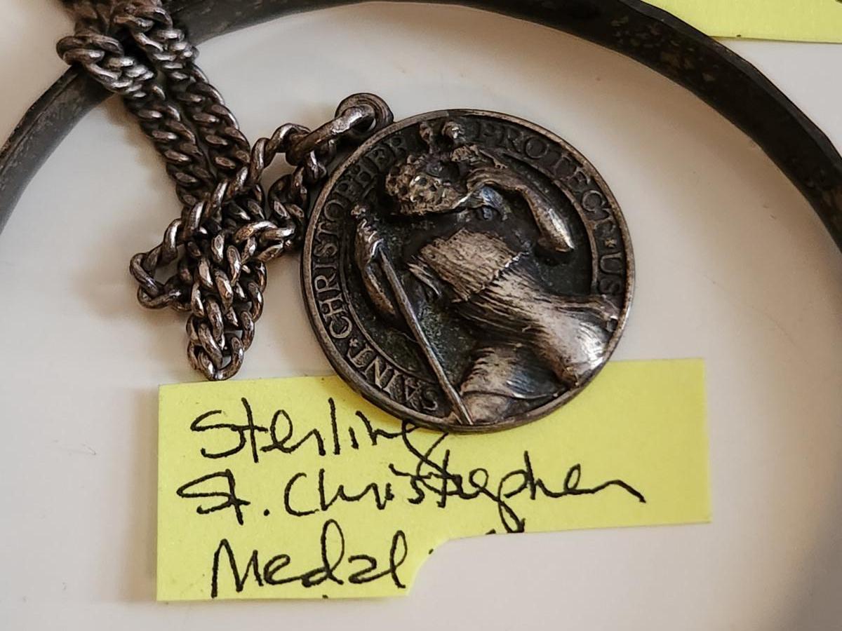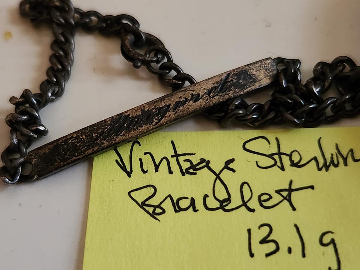 This auction lot is for a grouping of Vintage Sterling Jewelry. Included in this lot are a sterling silver bracelet, a smaller chained bracelet with the engraved name of "Margaret" and a sterling St. Christopher Medal with a necklace chain.
