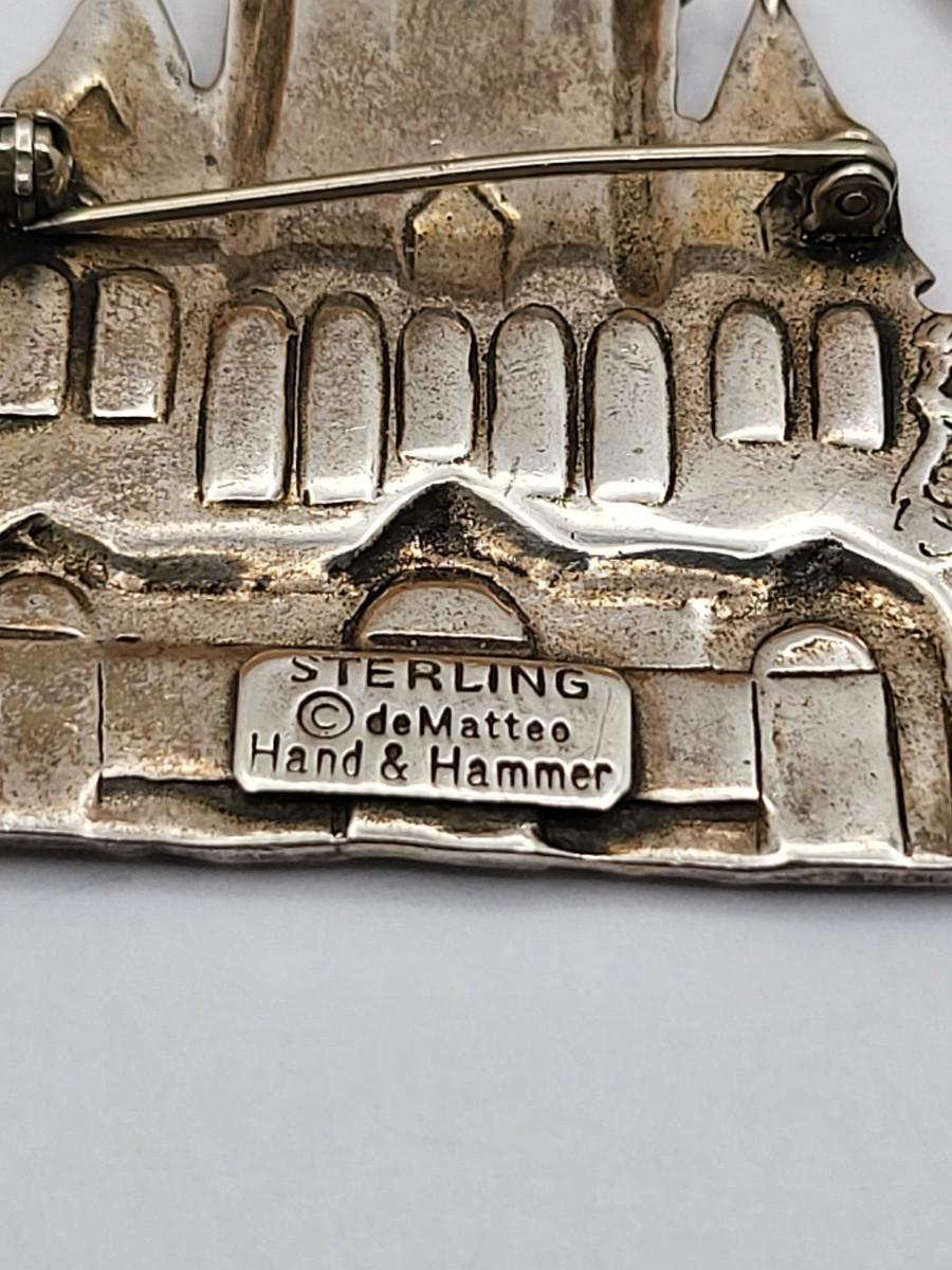 Stamped Sterling, deMattee Hand & Hammer. This piece can be worn as a brooch, pendant or hang as ornament. It measures 2" x 2" and weighs 16.8 grams sterling silver. Nice patina enhances the detail in this vintage piece.