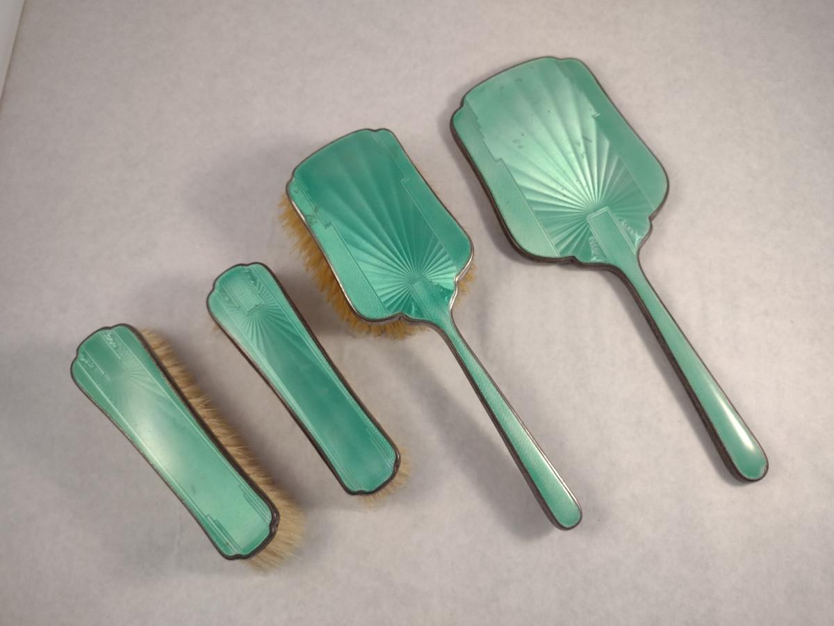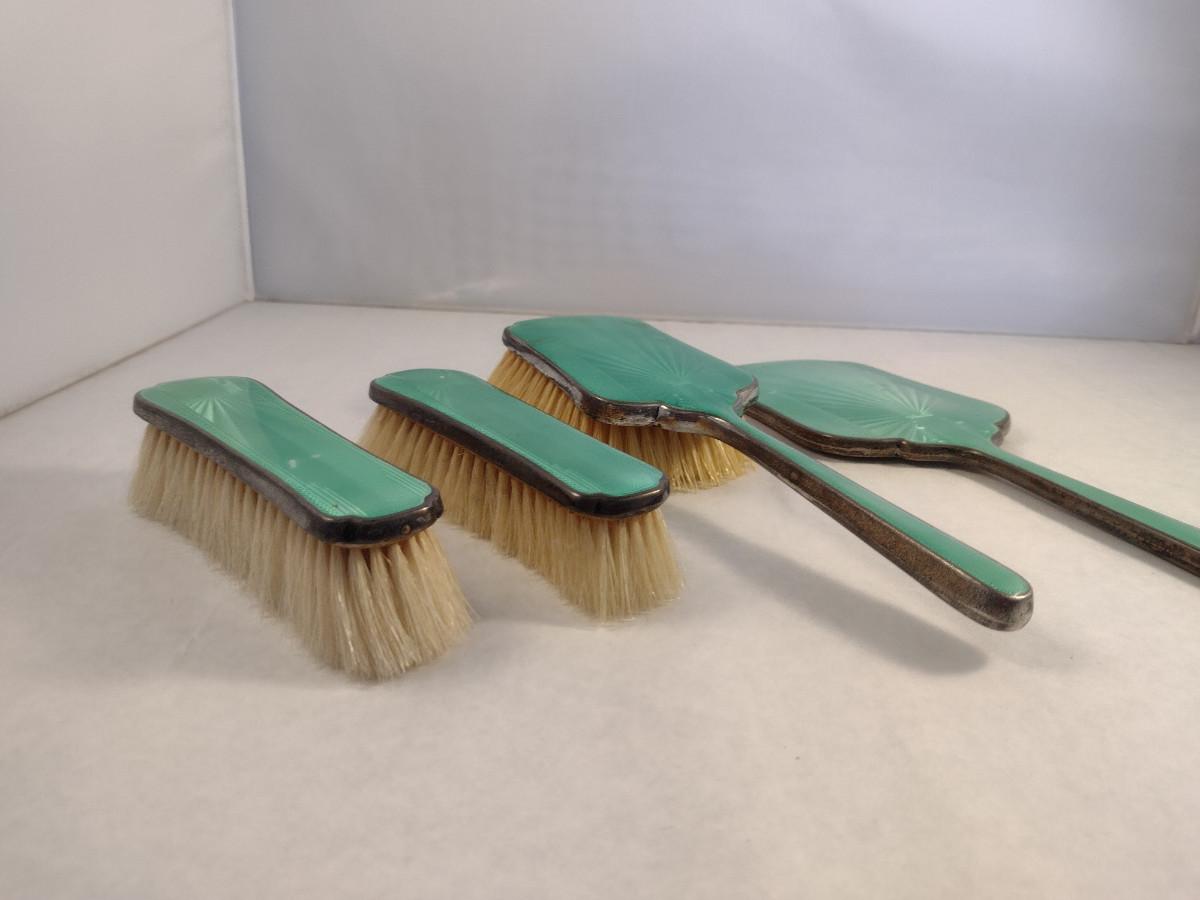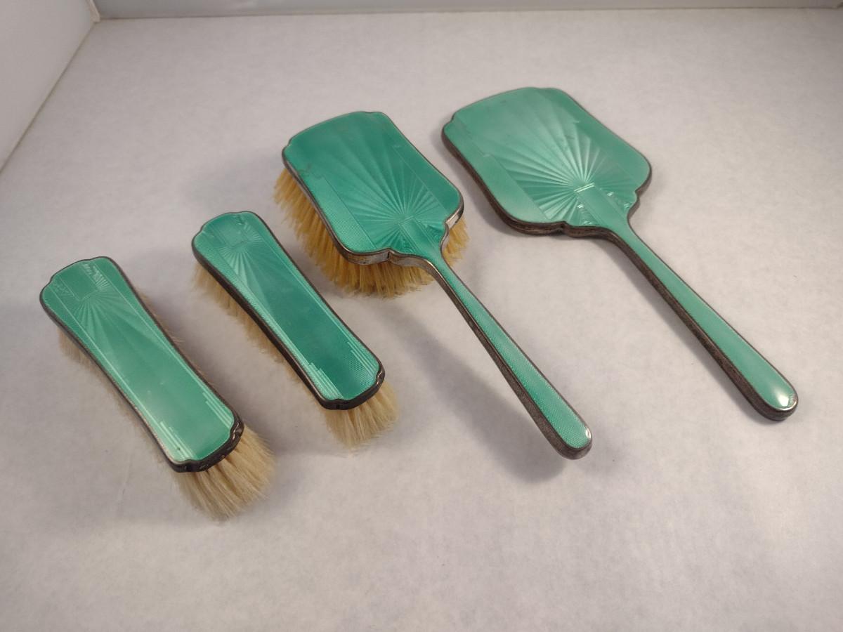 Vintage Sterling Silver and Guilloche Enamel Brush and Beveled Mirror Vanity Set- Four Pieces