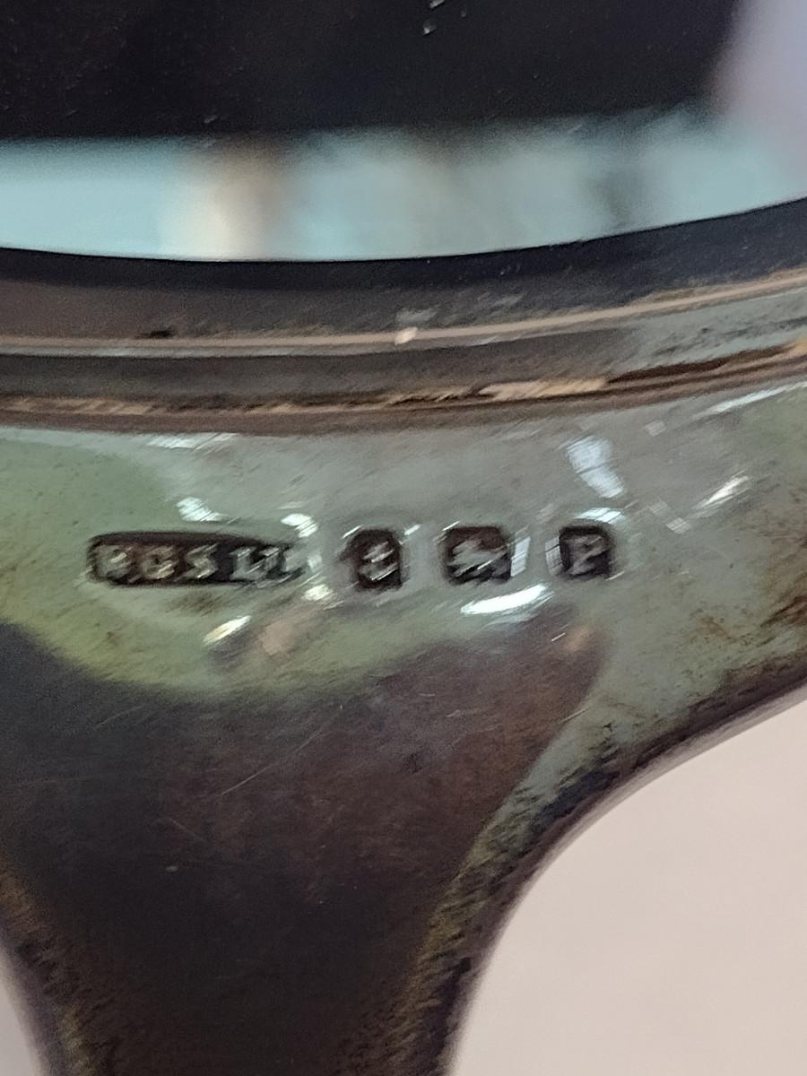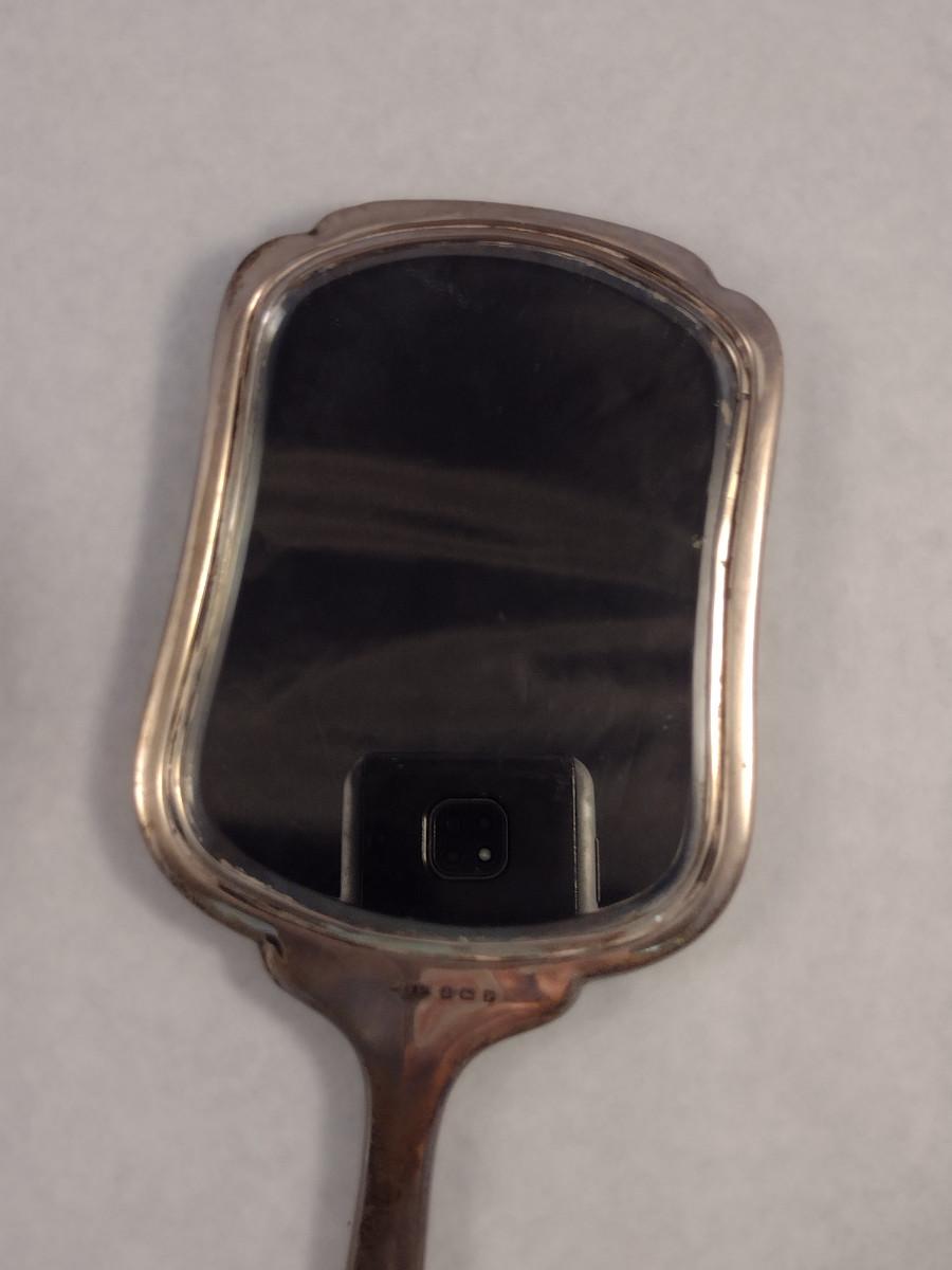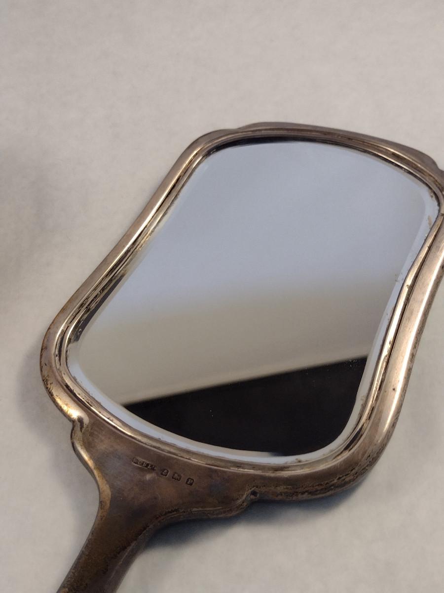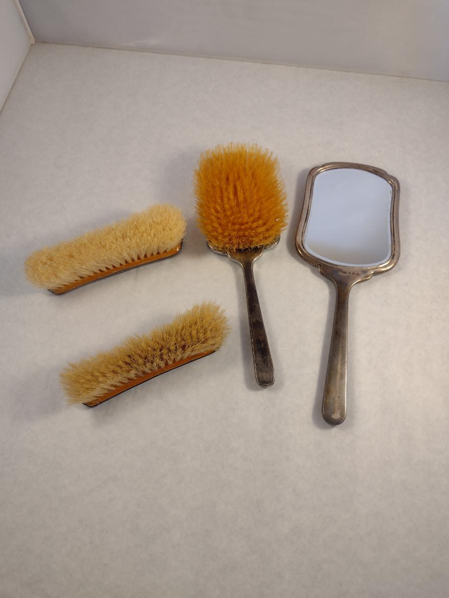 Vintage Sterling Silver and Guilloche Enamel Brush and Beveled Mirror Vanity Set- Four Pieces
