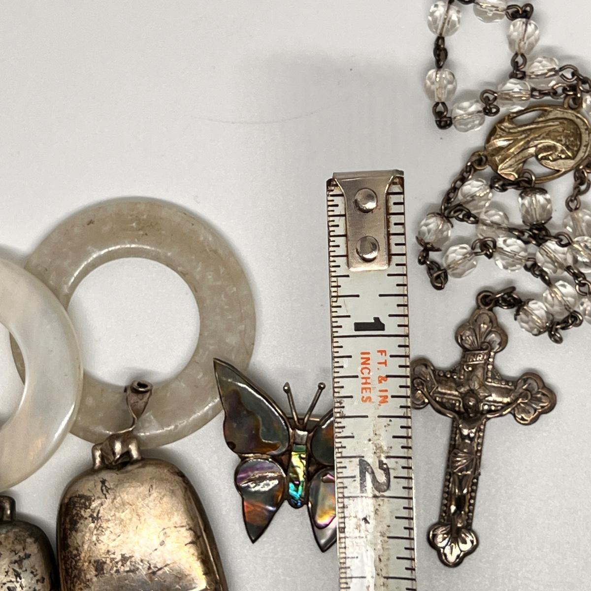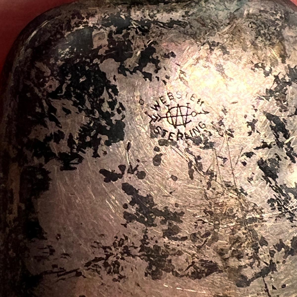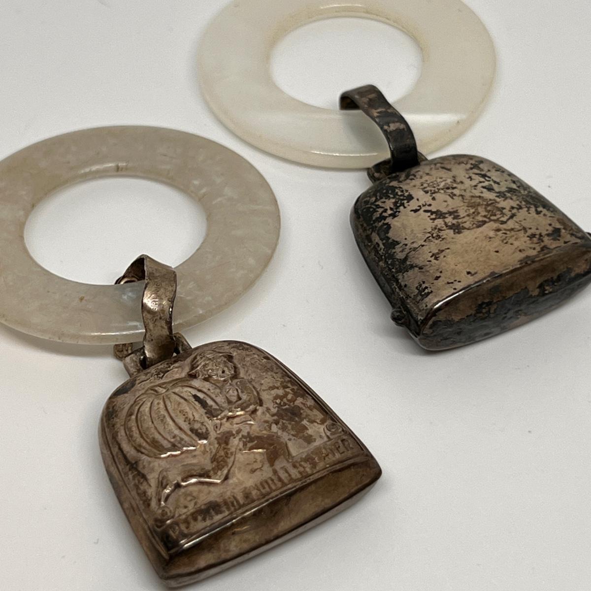 One rattle is stamped Webb Sterling. The other has Peter The Pumpkin Eater. The crucifix is stamped Sterling Hayward. The brooch is stamped 925.