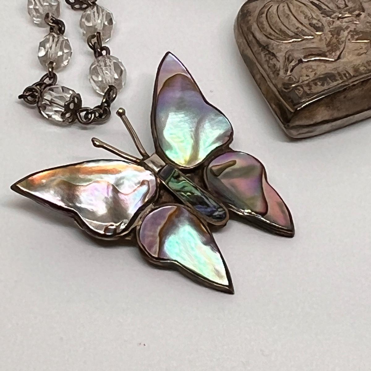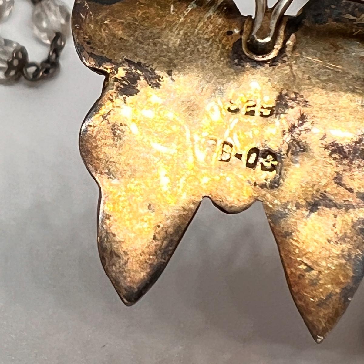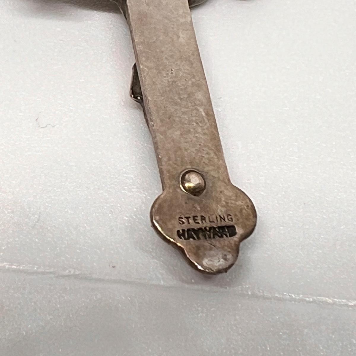One rattle is stamped Webb Sterling. The other has Peter The Pumpkin Eater. The crucifix is stamped Sterling Hayward. The brooch is stamped 925.
