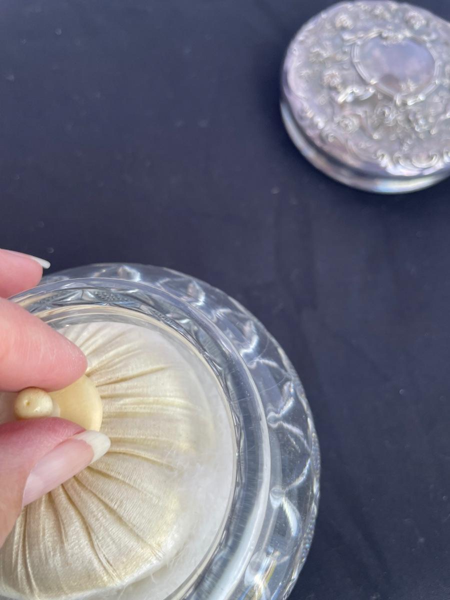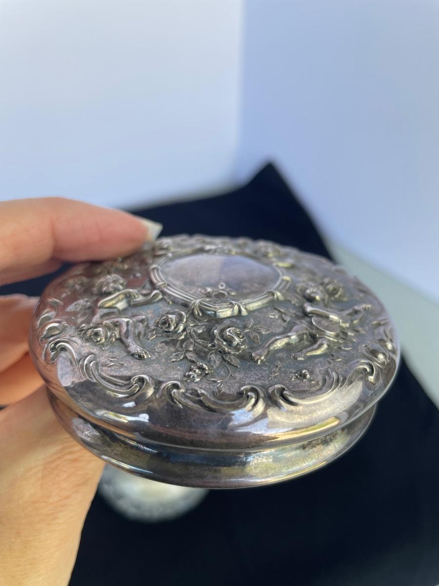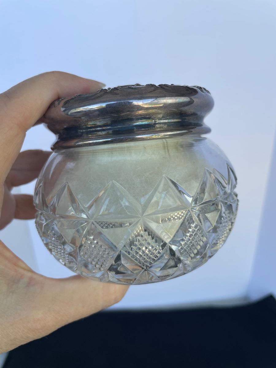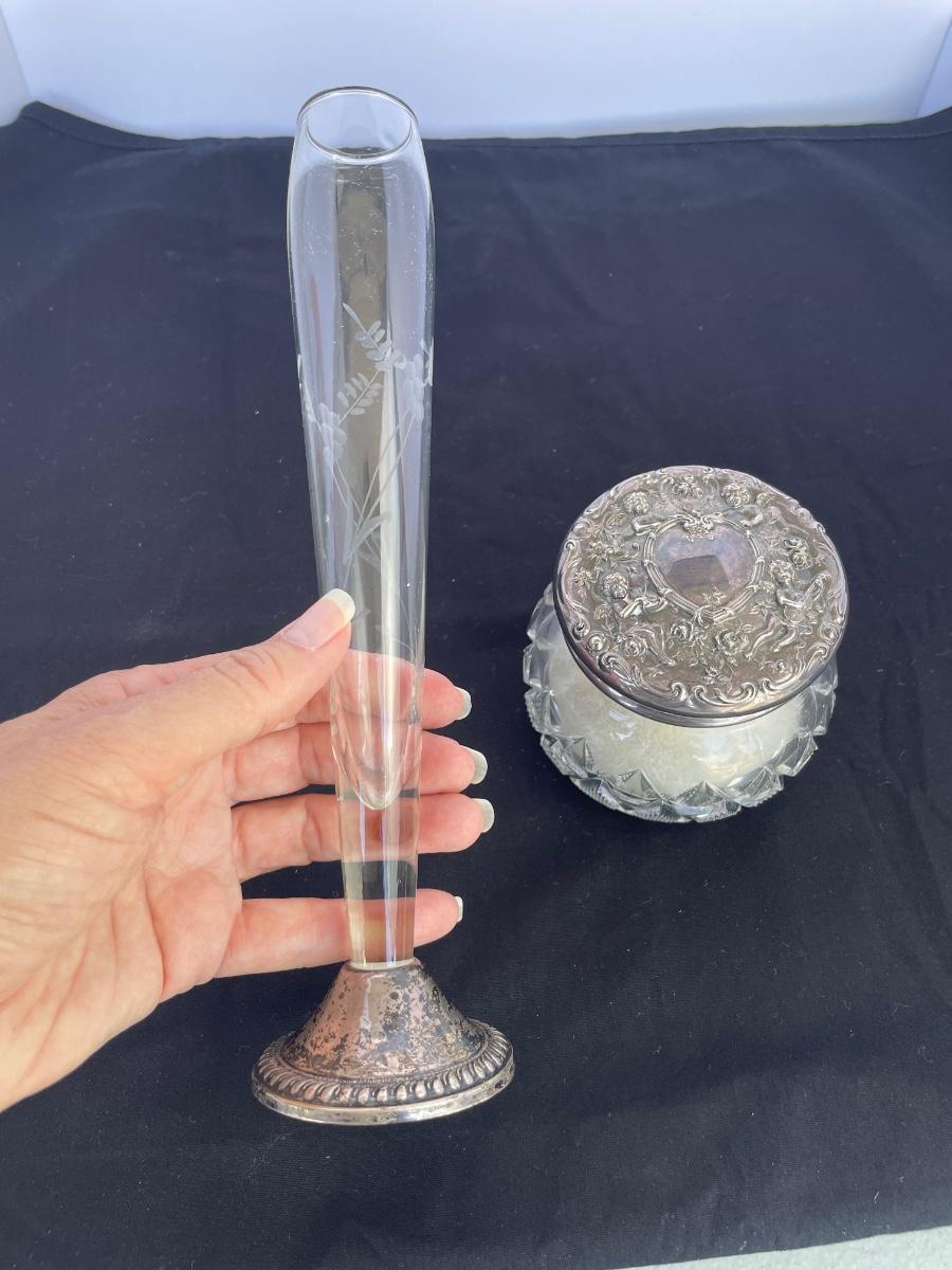 Vanity jar is cut crystal and includes a powder puff. Lid is marked with a 1907 patent date. Unknown silver content on the lid. Vase has sterling mark on the bottom.