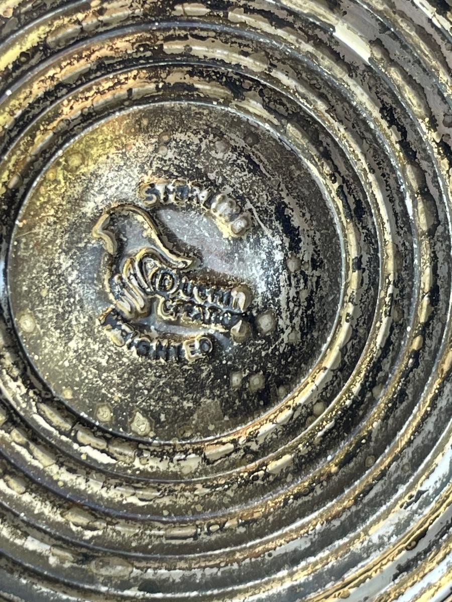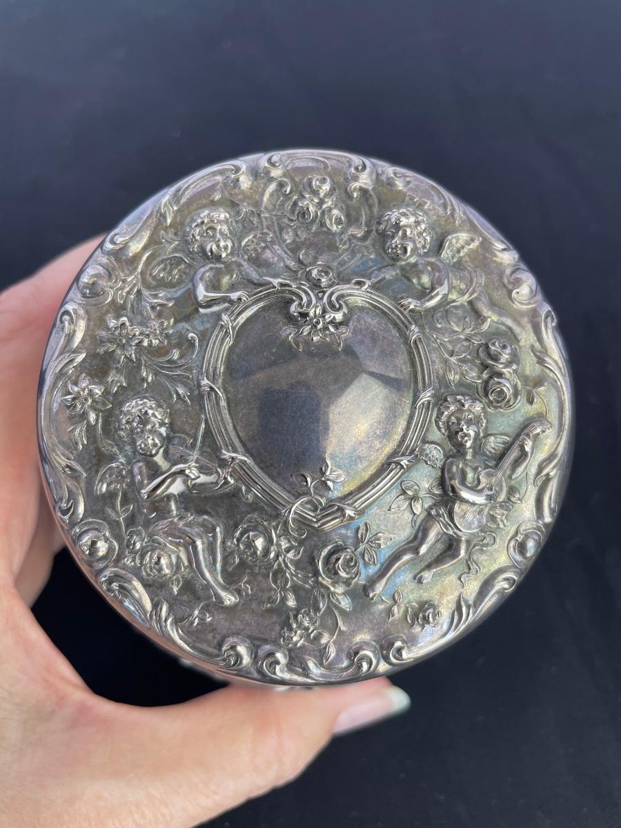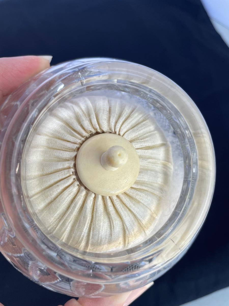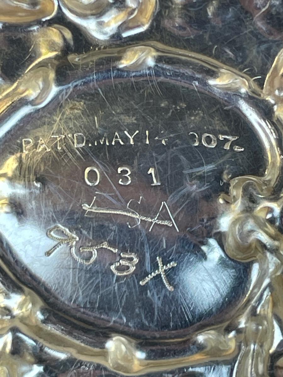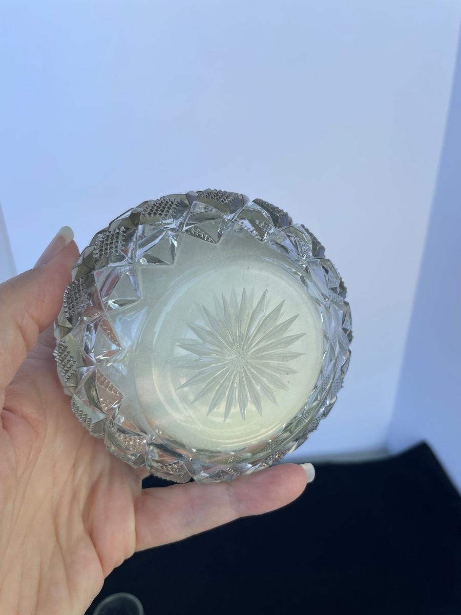 Vanity jar is cut crystal and includes a powder puff. Lid is marked with a 1907 patent date. Unknown silver content on the lid. Vase has sterling mark on the bottom.