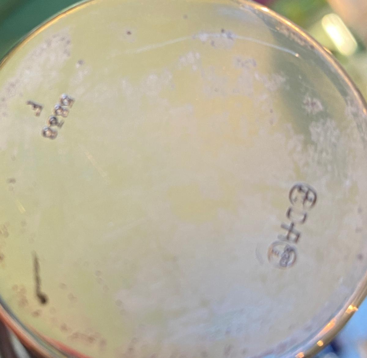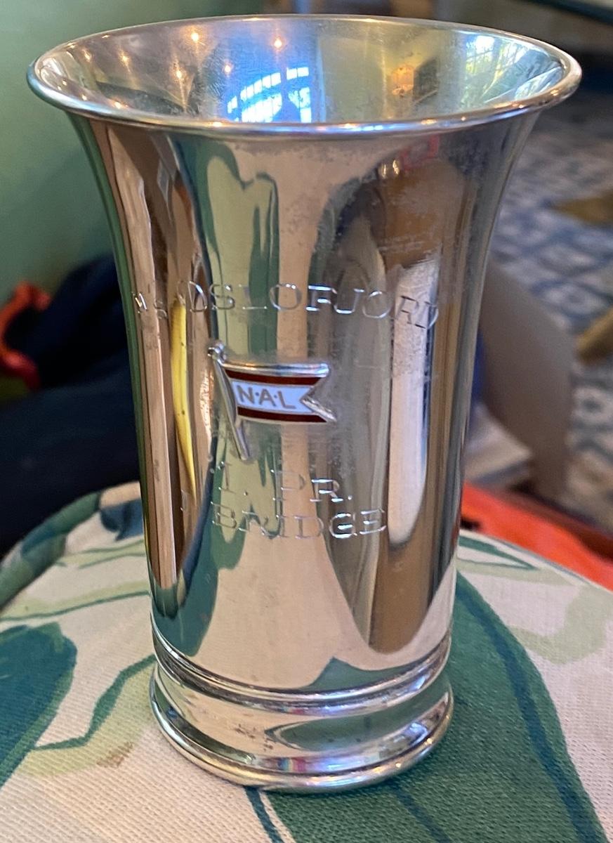 Vintage sterling silver cup commemorating Paul F. Kerr’s travels to Osla on the M/S Oslofjord. Has enameled flag with Norwegian line NAL, M/S Oslofjord and 1 Pr. Bridge engraved. Marked DA Sterling mark. 3 3/4” tall, 2 3/4 diameter lip. Some residue on silver could use a cleaning.