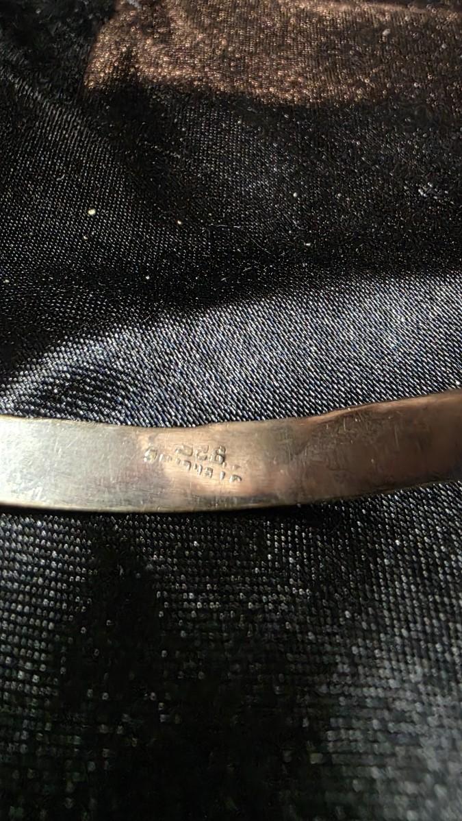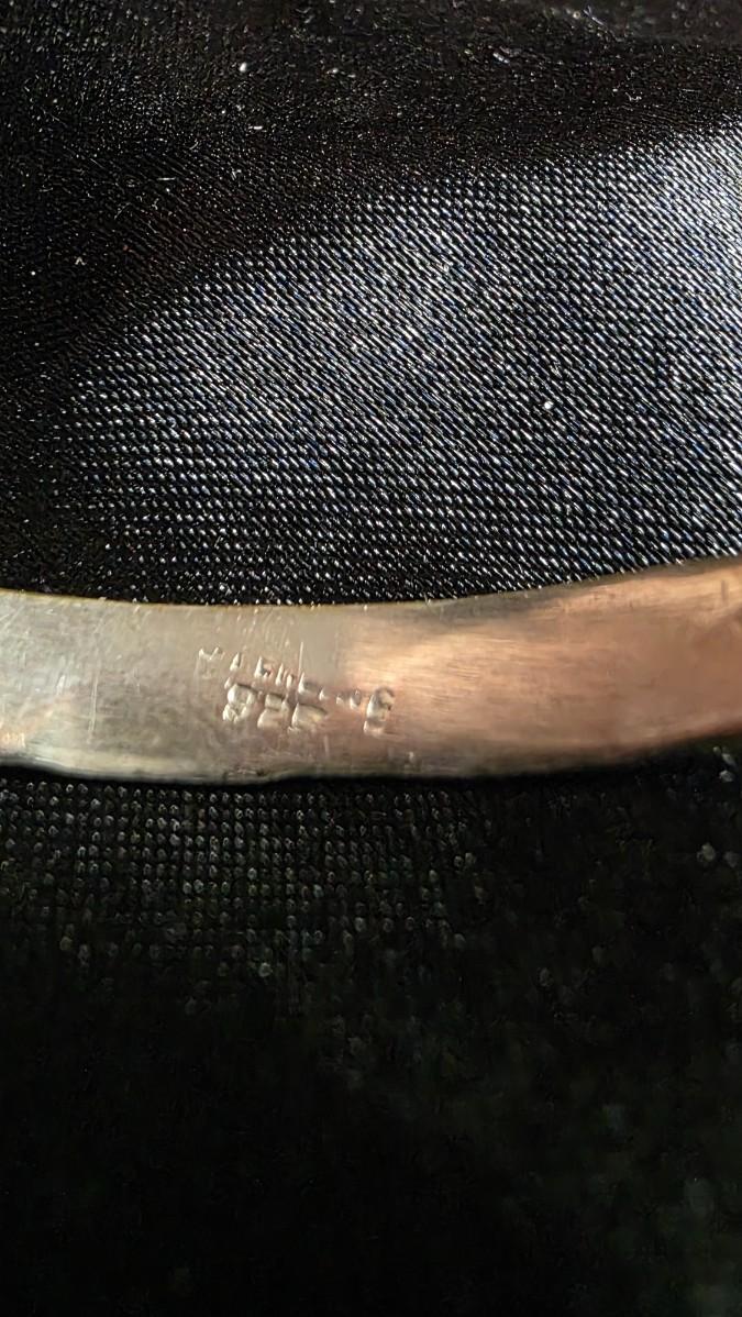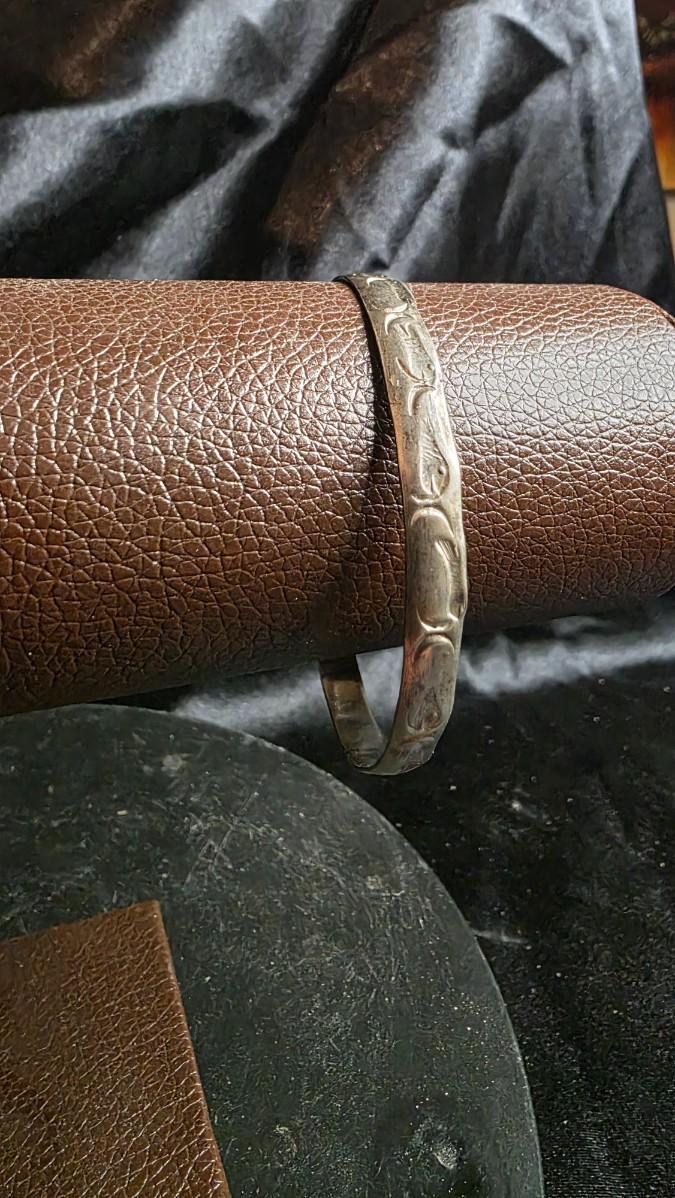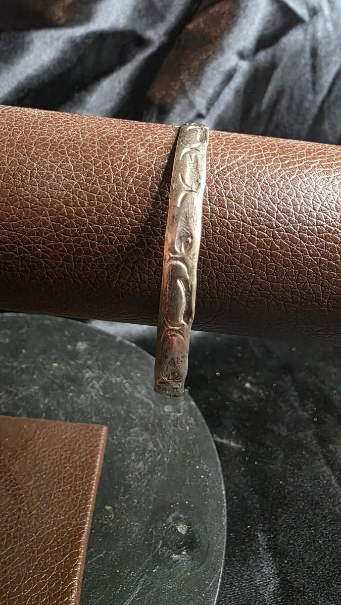 Imagine it catching firelight during evenings of quiet conversation, the etched flowers seeming to bloom anew with every gesture, or resting against sun-warmed skin where it becomes a talisman of understated elegance and timeless craft. Marked Mexico 925, its patina tells of journeys taken and stories held, a bracelet that turns the arm into a canvas of enduring beauty.