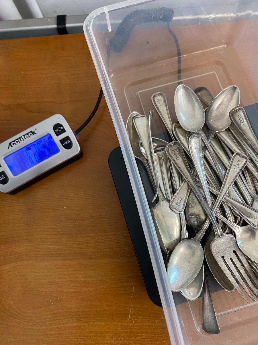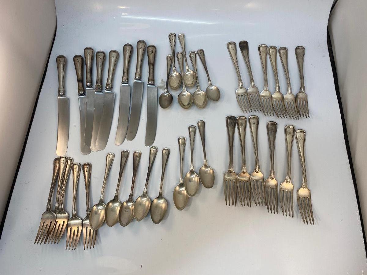 Vintage Sterling Silver Flatware Set Monogrammed Forks Knives Spoons. Old looking set of sterling. Some pieces are monogrammed "A" and some "D". Three spoons are not monogrammed at all. Incomplete set. Heavy pieces. Knives are sterling handle with stainless blades. Total weight for forks and spoons is 1254g and knives are 634g. 39 pieces total.